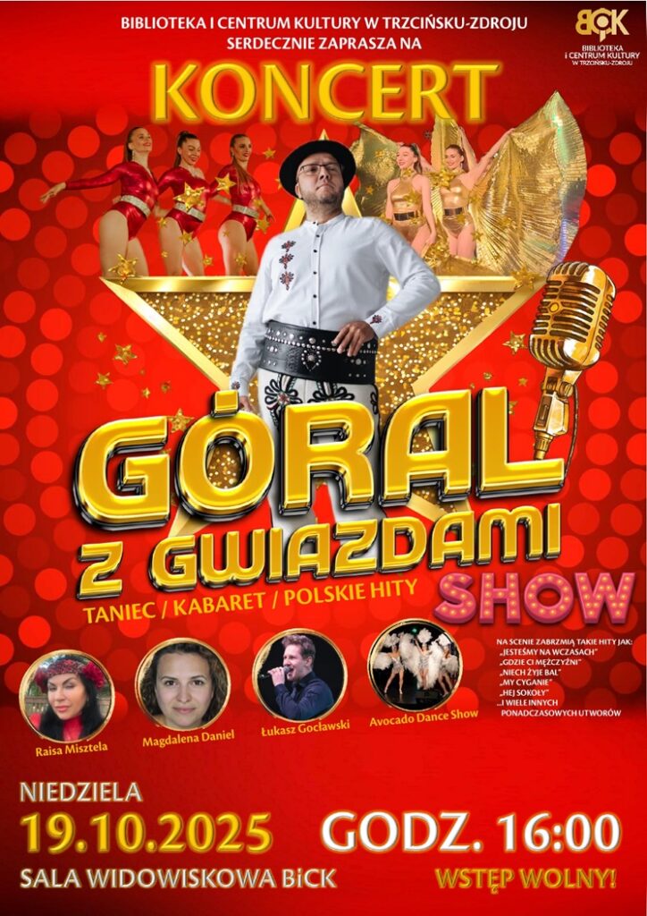 Serdecznie zapraszamy na „Góral z Gwiazdami Show”, wyjątkowe widowisko muzyczno-taneczne, które odbędzie się w Bibliotece i Centrum Kultury w Trzcińsku-Zdroju. Koncert odbędzie się w niedzielę, 19 października 2025 r., o godzinie 16:00 w sali widowiskowej BiCK. Wstęp wolny!
