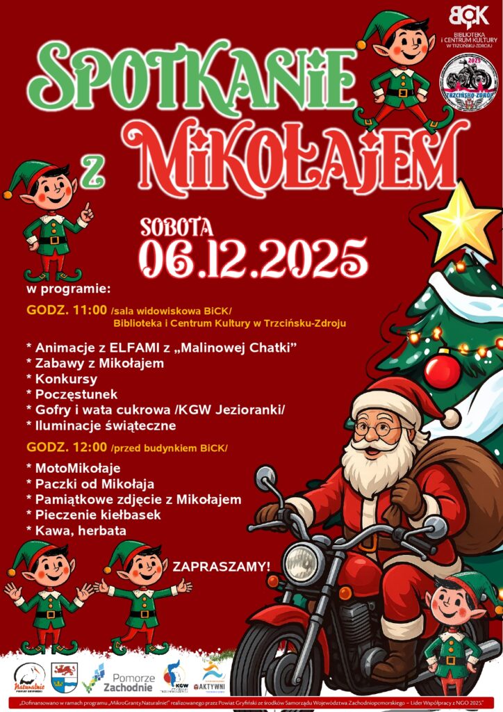 HO! HO! HO! Nadchodzi najbardziej wyczekiwane wydarzenie grudnia! Zapraszamy serdecznie wszystkie dzieci i całe rodziny na wyjątkowe Spotkanie z Mikołajem, które odbędzie się w Trzcińsku-Zdroju w sobotę 6 grudnia 2025 roku, startując już od godziny 11:00. Przygotujcie się na dzień pełen magii, śmiechu i świątecznej radości! Rozpoczynamy o GODZ. 11:00 w sali widowiskowej BICK/Biblioteki i Centrum Kultury. Wewnątrz budynku na najmłodszych czekać będą Wesołe Animacje z Elfami z „Malinowej Chatki”, interaktywne Zabawy z naszym gościem specjalnym – Mikołajem, liczne Konkursy z nagrodami oraz słodki poczęstunek. Punktem kulminacyjnym tej części będzie uroczysta Iluminacja świąteczna! Następnie, o GODZ. 12:00, przenosimy się przed Budynek BICK, gdzie odbędą się motoryzacyjne atrakcje: Przyjazd MotoMikołajów! To doskonała okazja, by odebrać Paczki od Mikołaja, zrobić pamiątkowe zdjęcie z Mikołajem. Czekać będzie także na was gorąca kawa, herbata i pieczenie kiełbasek na świeżym powietrzu. Nie może Was zabraknąć! To idealny sposób na rodzinne rozpoczęcie sezonu świątecznego.
