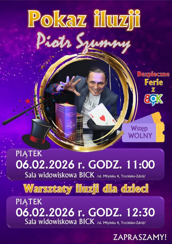 Magiczny piątek w BiCK już blisko! Zapraszamy wszystkie dzieci i rodziców na niesamowity pokaz iluzji, który poprowadzi Piotr Szumny. Wydarzenie odbędzie się 6 lutego 2026 roku o godzinie 11:00 w sali widowiskowej BiCK przy ulicy Młyńskiej 4 w Trzcińsku-Zdroju. To jednak nie koniec atrakcji, ponieważ o godzinie 12:30 rozpoczną się specjalne warsztaty iluzji dla dzieci, podczas których będzie można poznać sekrety magicznych sztuczek. Na oba wydarzenia wstęp jest wolny, więc zabierzcie ze sobą dobre humory i dajcie się porwać magii. Zapraszamy!