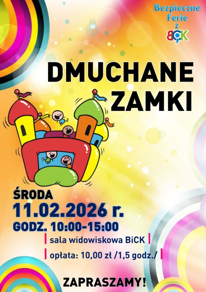 Ferie wcale nie muszą być nudne, dlatego już w najbliższą środę zamieniamy naszą salę widowiskową w prawdziwe dmuchane królestwo, w którym dzieciaki będą mogły wyszaleć się za wszystkie czasy. Zapraszamy wszystkich małych odkrywców 11 lutego 2026 roku w godzinach od 10:00 do 15:00 do sali widowiskowej BiCK, gdzie na uczestników czekać będą kolorowe dmuchane zamki. Koszt udziału w zabawie wynosi 10 zł za 1,5 godziny skakania. To idealna okazja, aby spożytkować niespożytą energię w bezpiecznym i radosnym miejscu, dlatego nie zwlekajcie i wpadajcie do nas całymi rodzinami.