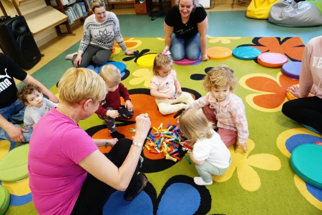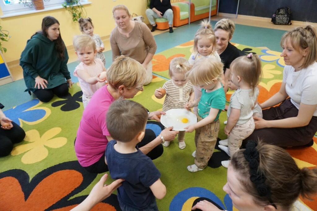 Dnia 1.04.26 do Biblioteki przyszły Moliki z mamusiami. Na początku troszkę grymasiły i popłakiwały, bo chorowały i w zajęciach udziału nie brały. Powolutku humorki się poprawiały, przystępując do zabawy. Najpierw w kole wirowanie, balonika rozciąganie. Potem zabawy w rytmu wystukiwanie i o jajach rozmawianie. Jajko ze skorupki się uwolniło i na talerzyku zagościło. Maluszki je dotykały, gdzie białko i żółtko pokazywały. W ręce jajka chwyciły i na dywan upuściły. Jedne były surowe i się rozlały. Mamy szybko posprzątały. Te gotowane zostały porozgniatane. Potem kurczaki wyskoczyły i maluchy zadziwiły. Nieufnie w ręce je brały i oglądały.