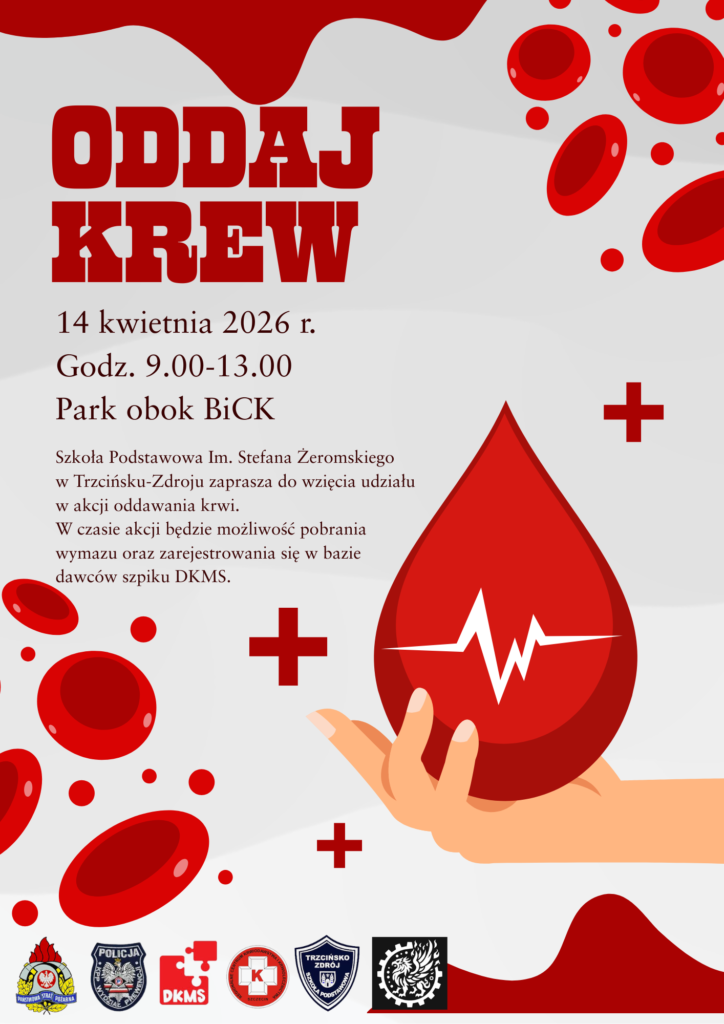 Już w najbliższy wtorek, 14 kwietnia 2026 r., odbędzie się wyjątkowe wydarzenie, podczas którego każdy z nas może stać się bohaterem. Szkoła Podstawowa im. Stefana Żeromskiego w Trzcińsku-Zdroju serdecznie zaprasza wszystkich mieszkańców oraz gości do wzięcia udziału w akcji oddawania krwi. Czekamy na Państwa w parku obok BiCK w godzinach od 9:00 do 13:00. To niepowtarzalna okazja, aby w prosty sposób wesprzeć osoby potrzebujące i zasilić banki krwi, których zasoby są bezcenne dla ratowania zdrowia i życia. Oprócz samej donacji, w trakcie trwania akcji będzie istniała dodatkowa możliwość pobrania wymazu oraz zarejestrowania się w bazie dawców szpiku fundacji DKMS. Dołączenie do tego grona to szansa na uratowanie osób walczących z nowotworami krwi. Pamiętajcie, że każda kropla ma ogromne znaczenie. Aby proces oddawania krwi przebiegł sprawnie i bezpiecznie, prosimy o zabranie ze sobą dokumentu tożsamości, zjedzenie lekkiego posiłku przed wizytą oraz zadbanie o odpowiednie nawodnienie organizmu. Wspólnie możemy zdziałać wiele dobrego !