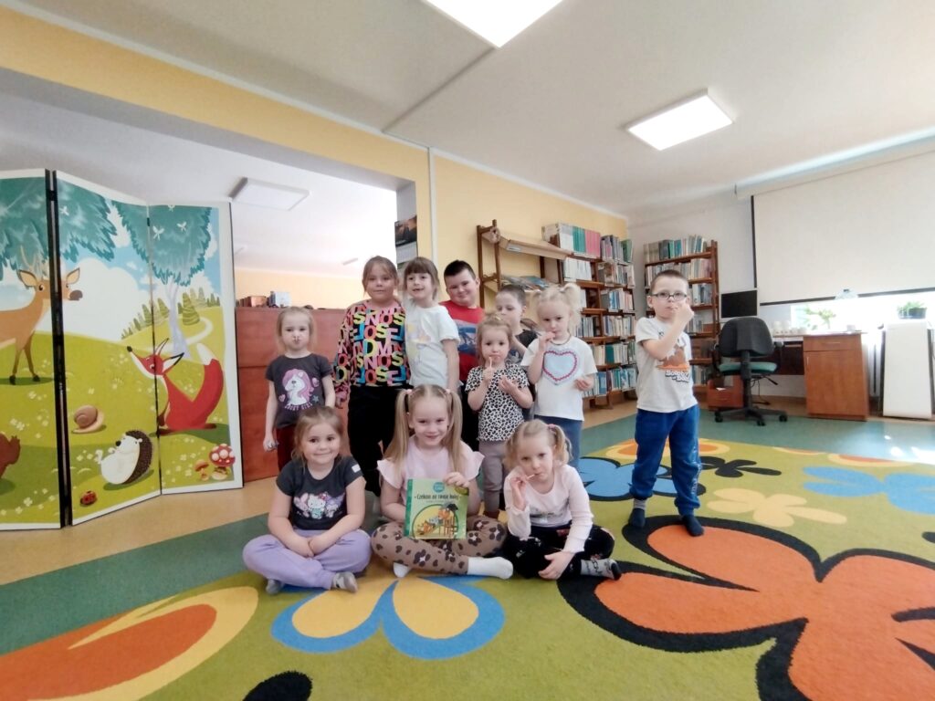W środę 08.04.2026 r. odbyły się czytelnicze zajęcia dla dzieci. Bibliotekę odwiedziło 11 uśmiechniętych przedszkolaków, gotowych do odkrywania świata książek i wspólnej zabawy. Spotkanie rozpoczęło się od zabaw ruchowo-integracyjnych, które pozwoliły dzieciom rozładować energię. Ucieszył je tor przeszkód. Z zaangażowaniem pokonywały kolejne etapy, doskonaląc sprawność i współpracę. W trakcie zabaw, padały pytania: „Proszę pani, kiedy będziemy czytać”?, co tylko potwierdzało, że dzieci czekają na czytanie.