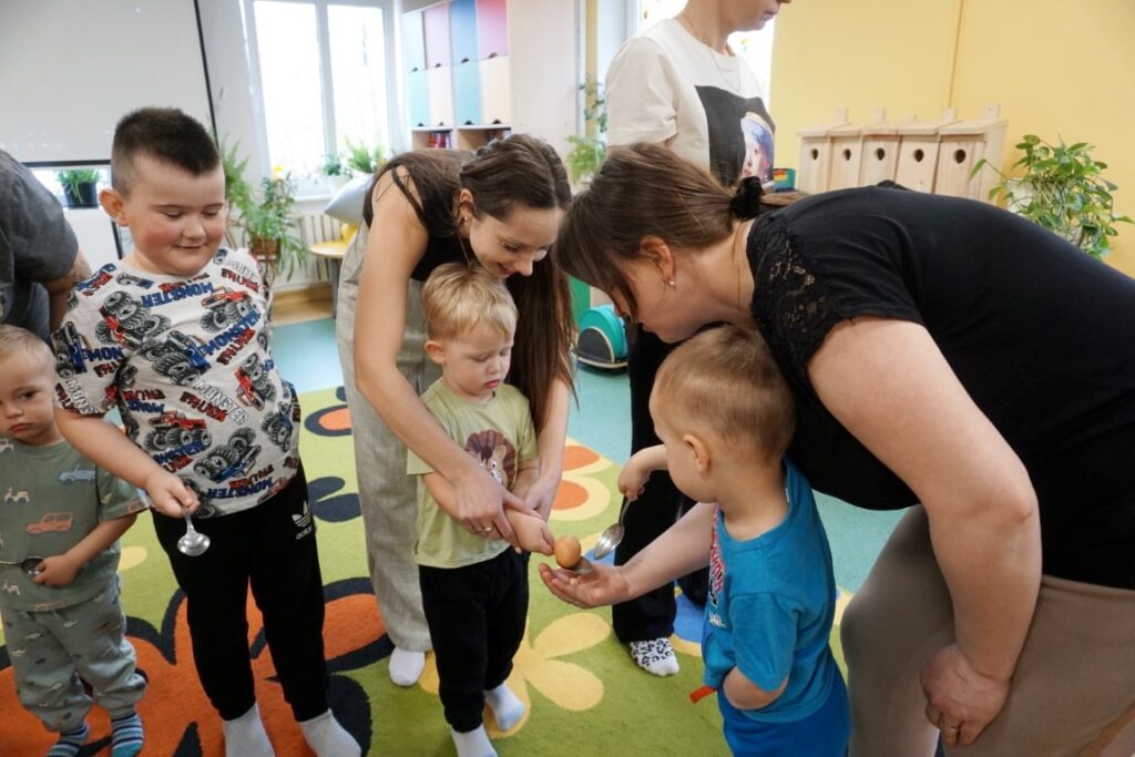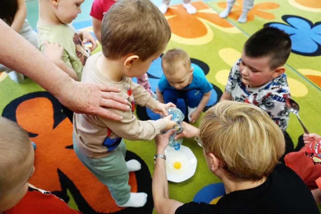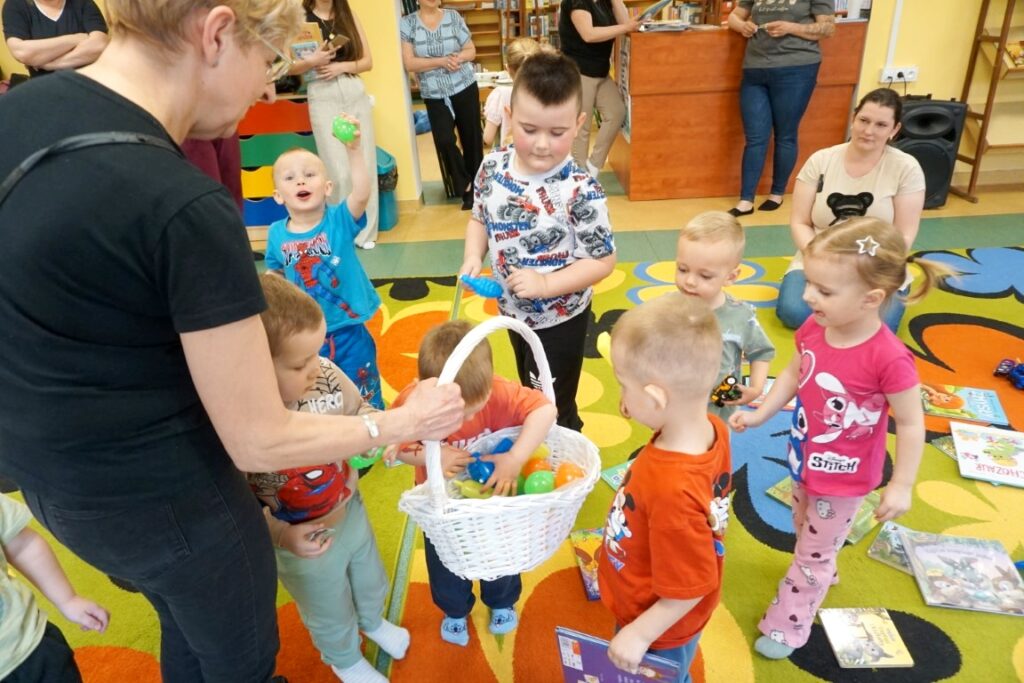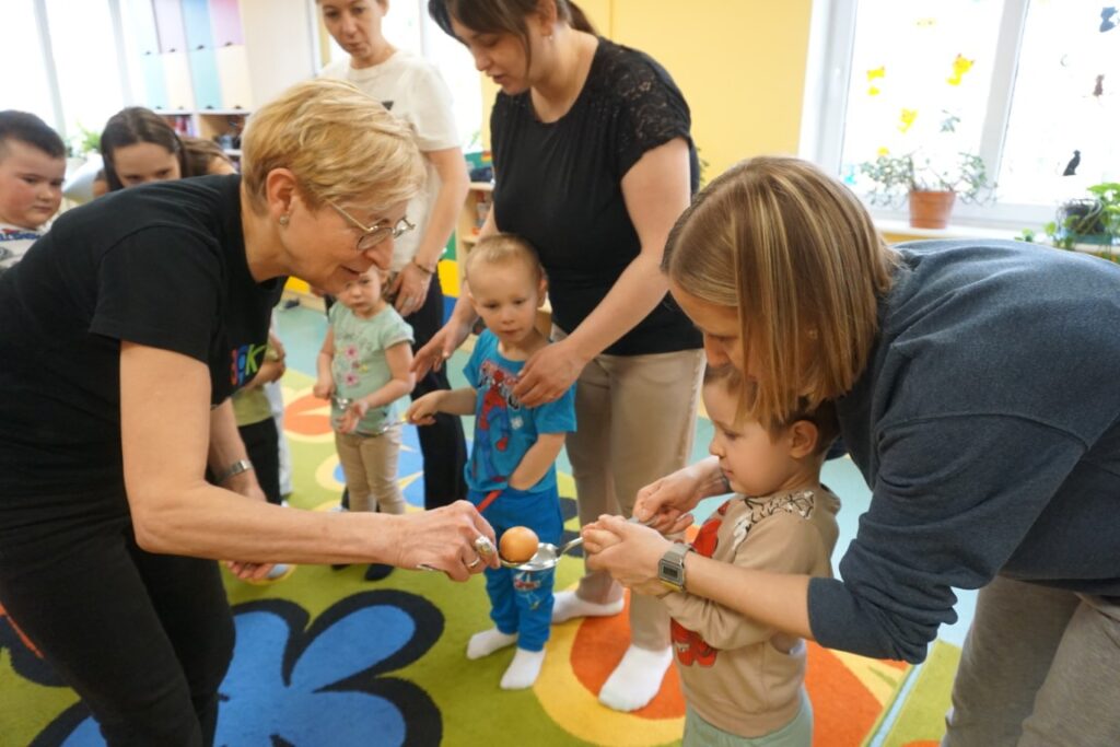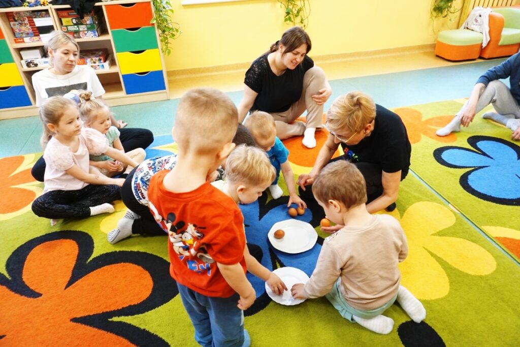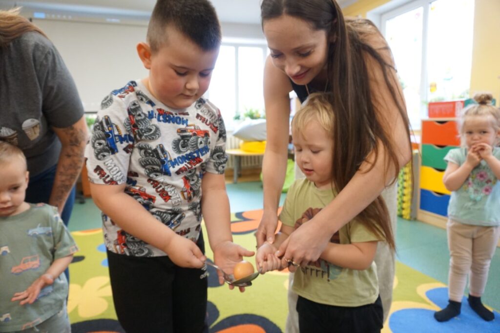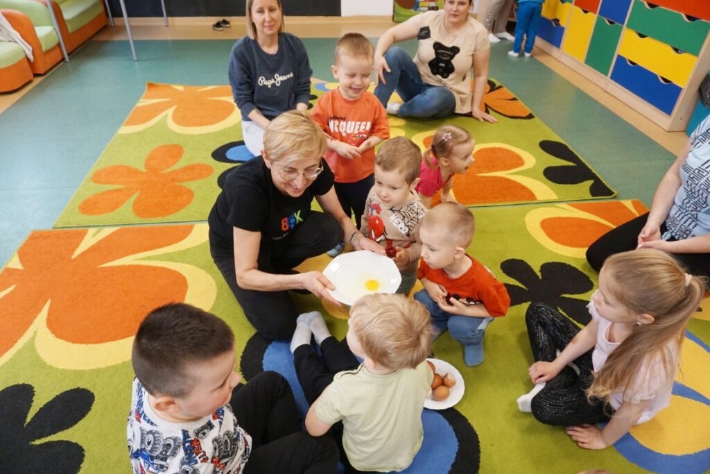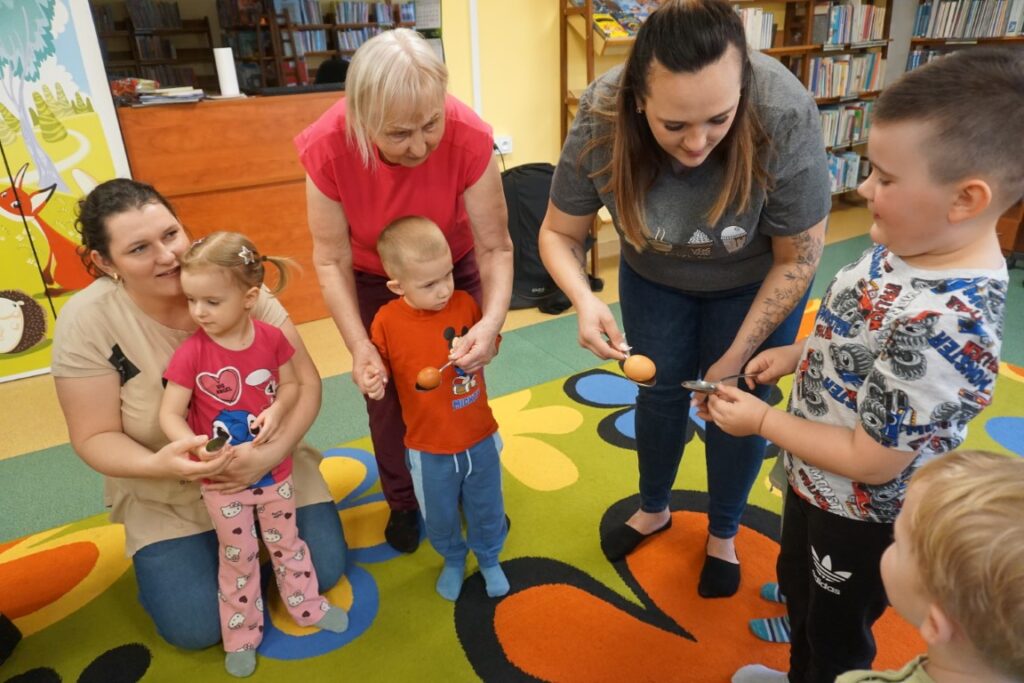 Dnia 31.03.26 odbyły się przedświąteczne zajęcia Akademii Malucha. Wiosna gdzieś się skryła i pogoda prawie zimowa się pojawiła. Dla dzieci i rodziców nie była to przeszkoda, by odwiedzić Bibliotekę, świetnie się zabawić i zgłębić tajemnicę jajka. Dzieci pobrykały, pohasały. Potem siadły na dywanie i czekały na następne działanie. Pani jajka położyła. Na dywanie zakręciła. Surowe kręcić się nie chciały a ugotowane żwawo wirowały. Pani w kole dzieci ustawiła i każdemu w rączkę łyżkę włożyła. Na łyżkę jajko położyła i podawać z łyżki na łyżkę zaleciła. Dzieci w skupieniu jajko podawały, by nie spadło uważały. Ono niesforne było i z łyżki zeskoczyło. Na dywanie się rozbiło i zabawę zakończyło. Inne na talerzyku wylądowało, co ma w środku pokazało. Białko i żółtko to było. Maluchy je dotykały, zalążka szukały. Pani butelkę wzięła i żółtko do środka wciągnęła.