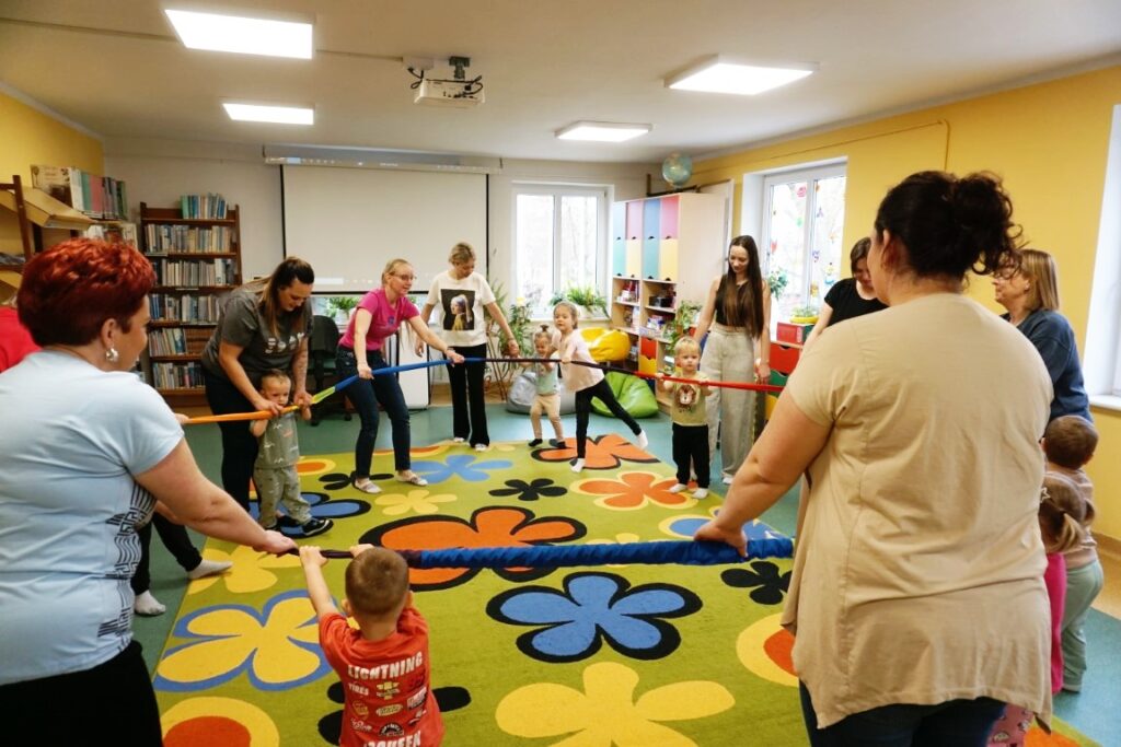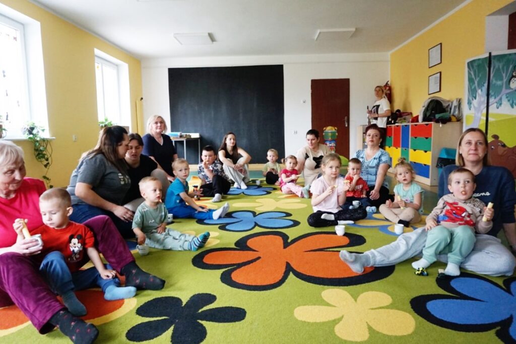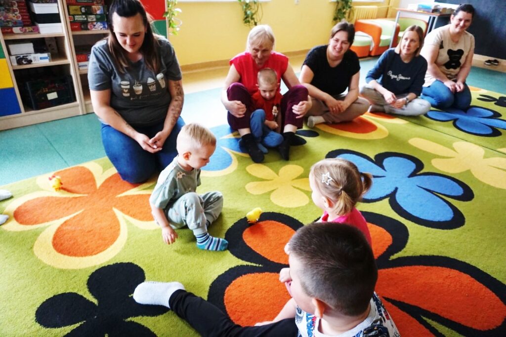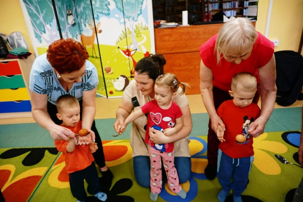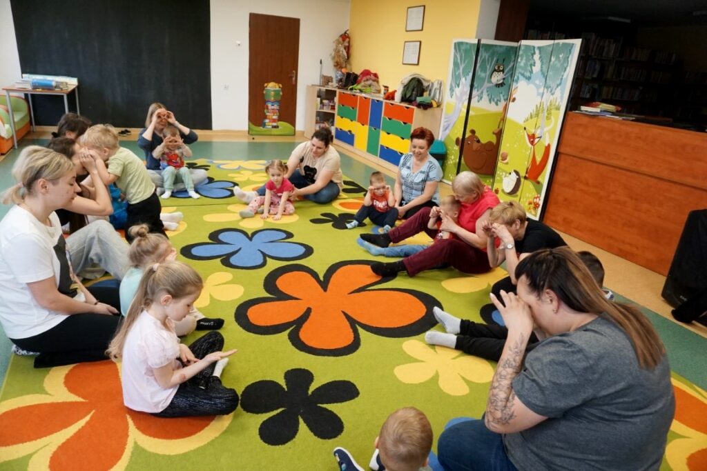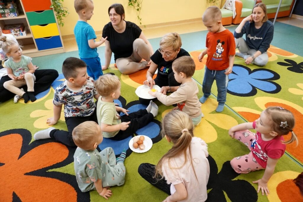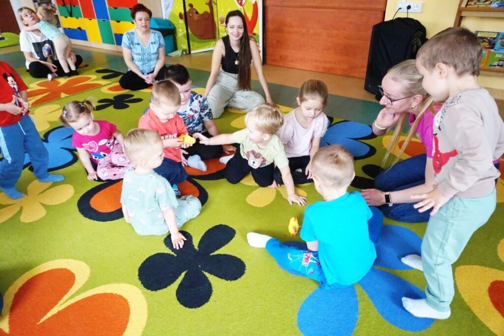 Dnia 31.03.26 odbyły się przedświąteczne zajęcia Akademii Malucha. Wiosna gdzieś się skryła i pogoda prawie zimowa się pojawiła. Dla dzieci i rodziców nie była to przeszkoda, by odwiedzić Bibliotekę, świetnie się zabawić i zgłębić tajemnicę jajka. Dzieci pobrykały, pohasały. Potem siadły na dywanie i czekały na następne działanie. Pani jajka położyła. Na dywanie zakręciła. Surowe kręcić się nie chciały a ugotowane żwawo wirowały. Pani w kole dzieci ustawiła i każdemu w rączkę łyżkę włożyła. Na łyżkę jajko położyła i podawać z łyżki na łyżkę zaleciła. Dzieci w skupieniu jajko podawały, by nie spadło uważały. Ono niesforne było i z łyżki zeskoczyło. Na dywanie się rozbiło i zabawę zakończyło. Inne na talerzyku wylądowało, co ma w środku pokazało. Białko i żółtko to było. Maluchy je dotykały, zalążka szukały. Pani butelkę wzięła i żółtko do środka wciągnęła.