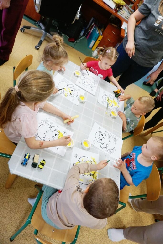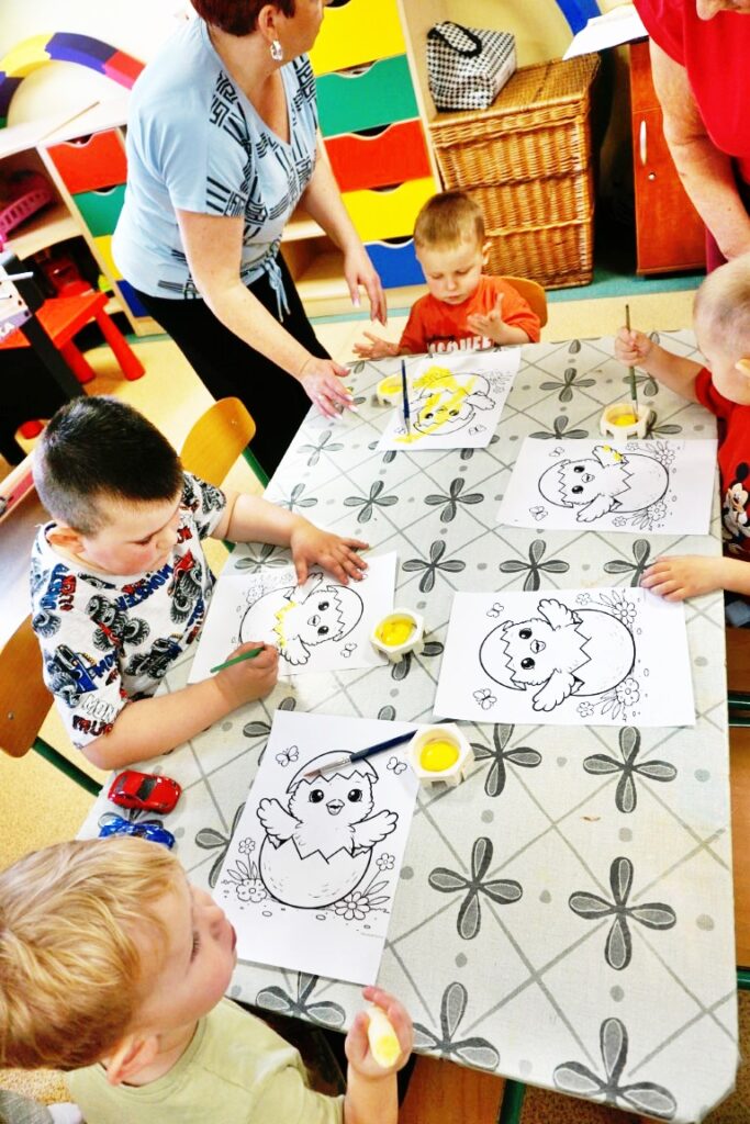 Potem książkę o jajku wszyscy oglądali, magię natury odkrywali. Zobaczyli, jak z jajka wykluwa się kurczaczek mały, świata ciekawy. Potem wyliczanki- rytmiczanki się uczyli, sami siebie zadziwili: „Mały kurczak w jajku śpi-cichuteńko sobie śni”zapukajmy puk puk puk, jajko idzie w ruch. Zanucili. Dwa kurczaczki się zjawiły, dzieciom radość sprawiły. Po dywanie się przemieszczały, jakby ziarenek szukały. Po chwili drugą piosenkę wszyscy zaśpiewali: ko ko ko, wesoło powtarzali, kurę naśladowali: „Duża kura ko ko ko, jajo duże… mała kura ko ko ko, jajo małe…”. Był to z przeszkodami, kurczaków malowanie i książeczek wybieranie a na koniec pożegnanie.