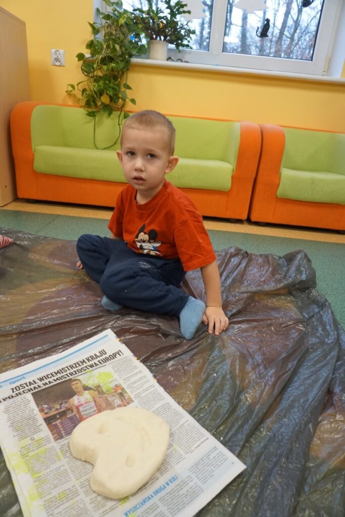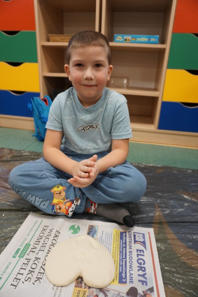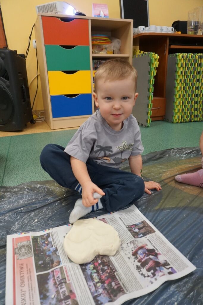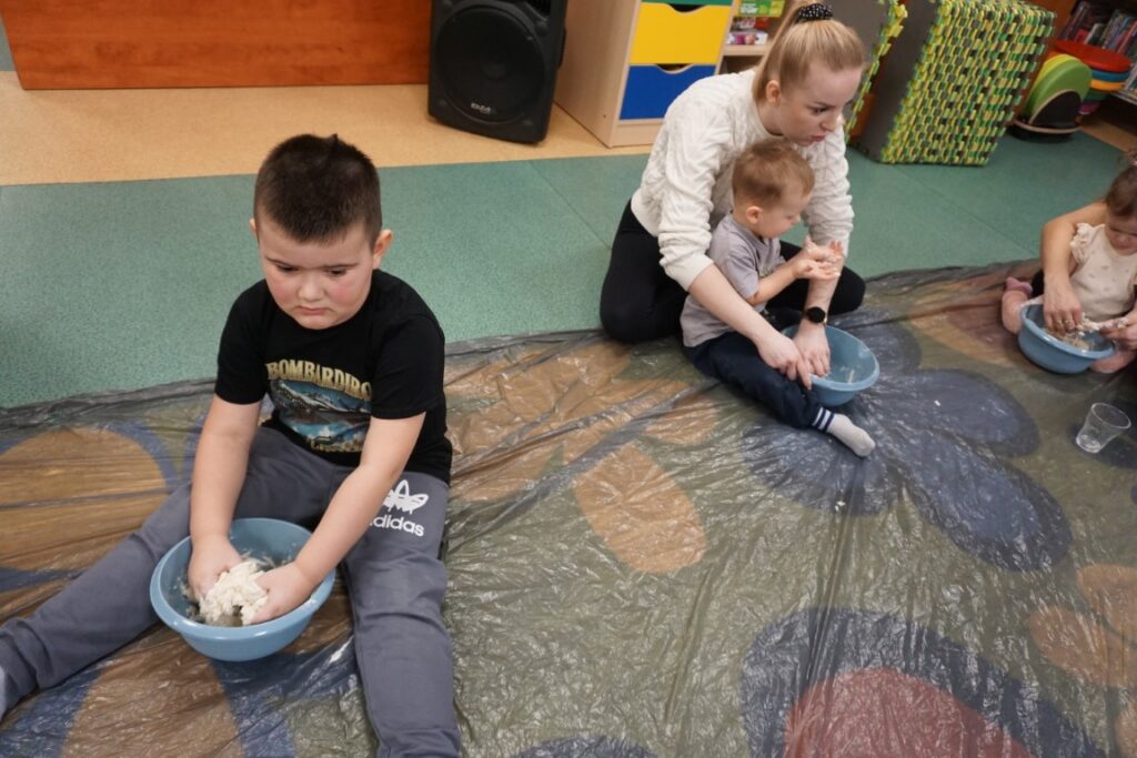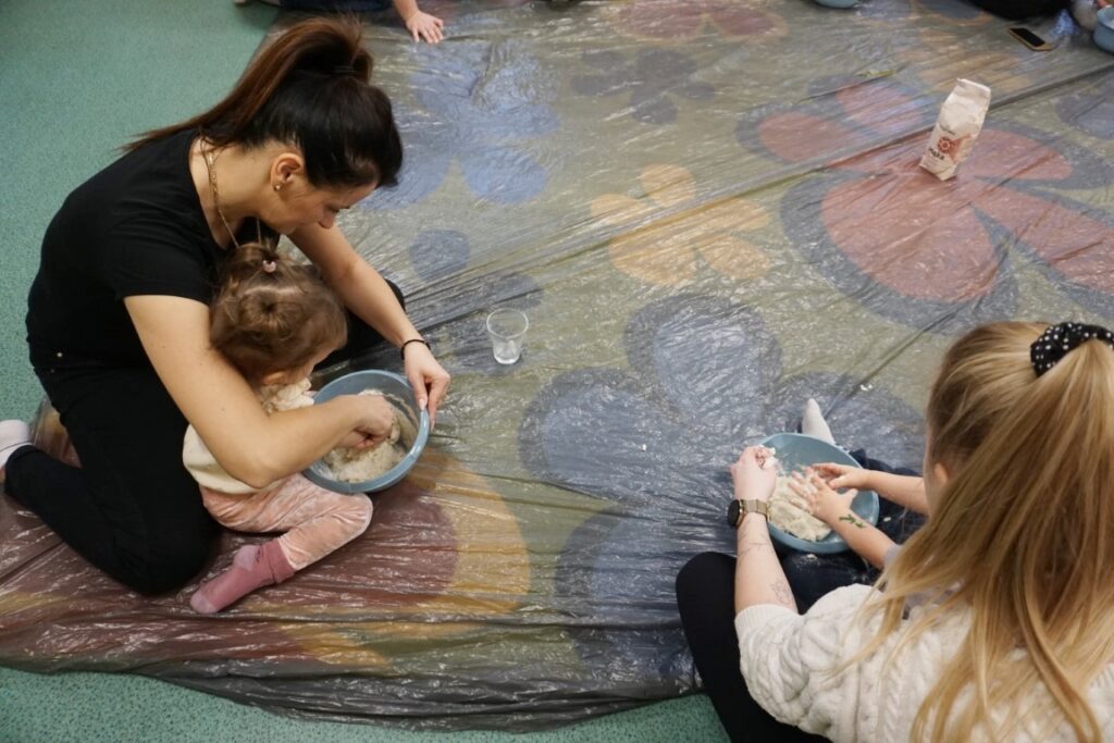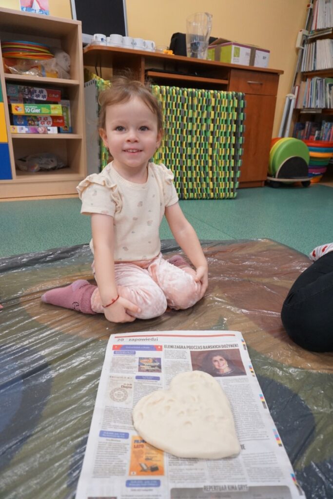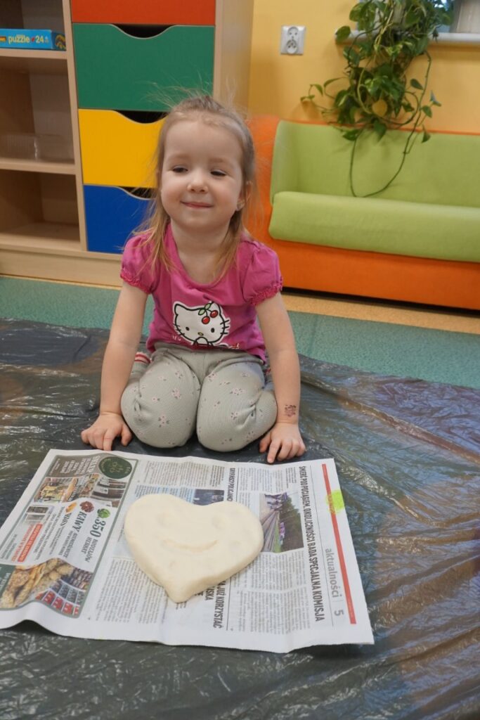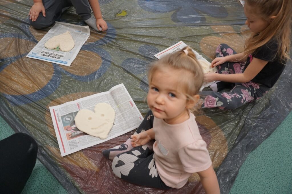 Tematem zajęć było serduszko. Dzieci wskazywały gdzie się znajduje, powtarzając rymowankę: „Serduszko, serduszko tutaj mam…serduszko, serduszko Tobie dam”. Wystukiwały rytm, w którym bije serce. Na dywanie rozłożyły folię, zabezpieczając podłogę. Już po chwili, samodzielnie przygotowywały masę solną. Do misek wsypywały mąkę, sól i wodę. Mieszały i zagniatały, aż powstało plastyczne ciasto. Dzieci z mamusiami formowały serca. Wszystkie wyszły wspaniale. Jeszcze czerwoną farbą pomalowały rysunek serduszka. Te ulepione z masy, wszystkie zabrały do domu, razem z wypożyczonymi książeczkami. Były dumne z efektów swojej pracy.