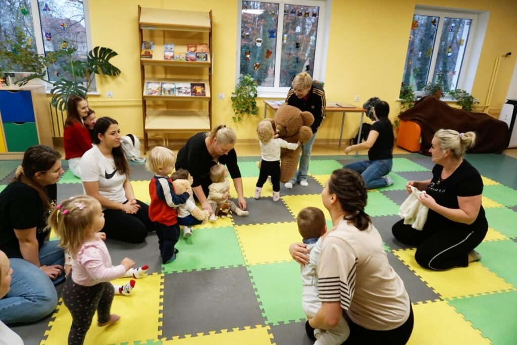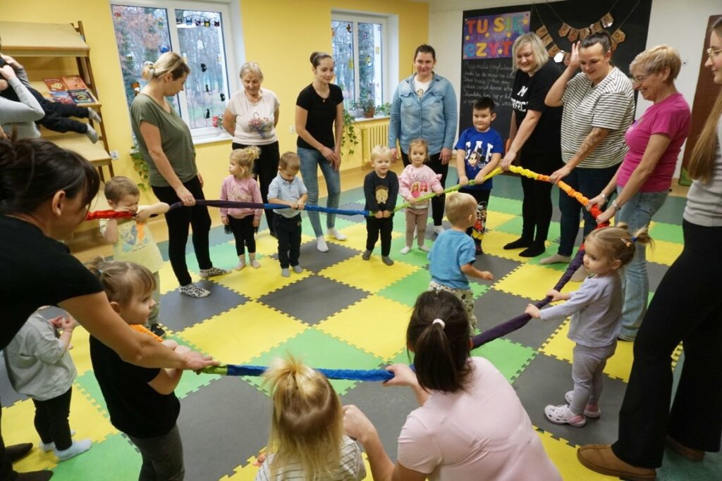 Dnia 26.11.25 do Biblioteki przyszły maluszki z misiami i uśmiechniętymi buźkami. Misie w raczkach trzymały i się do nich przytulały. Do tańca i wspólnej zabawy je porwały. Przysiadły w kole. W kącie niespodziankę zobaczyły. Cichutko podeszły i powoli odkryły. Misie zobaczyły, na kanapce siedziały. Dzieciom się przyglądały. Każde z dzieci wybrało innego, przyjaciela swego. Pani dwa miśki miała: wielkiego i małego, maluchom pokazała. Misie przedstawiła i wierszyk mówiła: „Jedna łapka, druga łapka, ja jestem niedźwiadek, jedna nóżka, druga nóżka a to jest mój zadek…”.