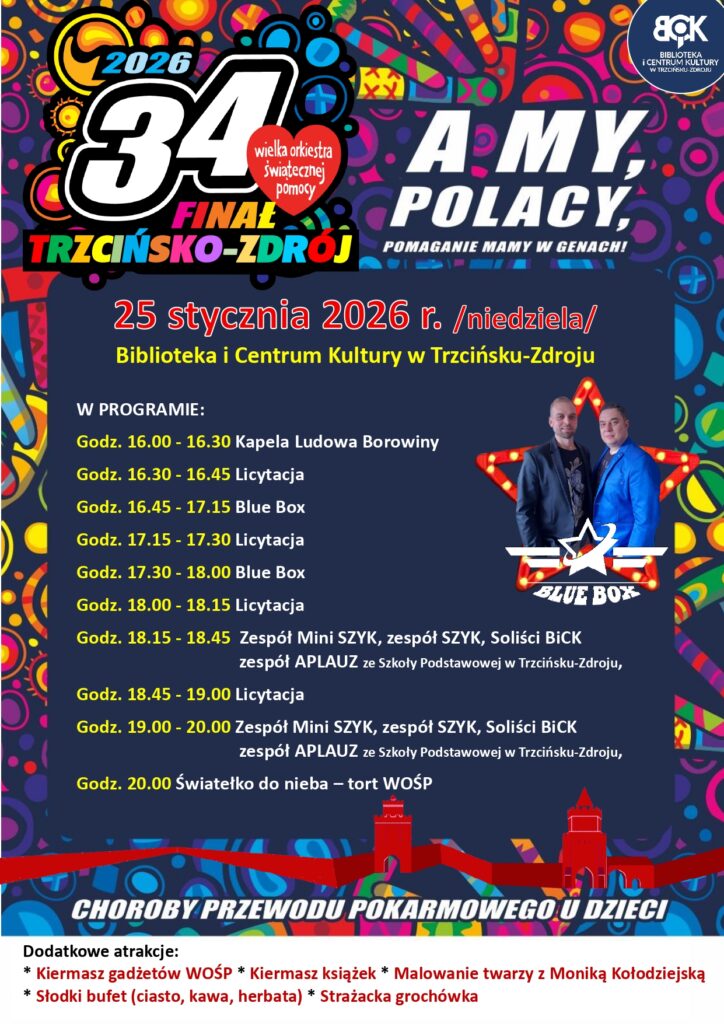 Już w najbliższą niedzielę, 25 stycznia, cała Polska zagra w 34. Finale Wielkiej Orkiestry Świątecznej Pomocy. Nasza gmina również włącza się w tę wyjątkową akcję, a jak wiadomo – pomaganie najlepiej smakuje z domowym ciastem! Mamy do Was ogromną prośbę. Upieczcie swoje ulubione ciasto, babeczki lub inne słodkości i przynieście je do Biblioteki i Centrum Kultury w Trzcińsku-Zdroju w Niedzielę, 25 stycznia. Kiermasz ciast, z którego całkowity dochód zasili puszki WOŚP! Każda blacha ciasta to realne wsparcie i kolejna „cegiełka” dorzucona do wspólnego celu. Pokażmy, że mieszkańcy naszej gminy mają ogromne serca (i talent kulinarny)!Podziel się radością i upiecz dobro! Do zobaczenia na kiermaszu!