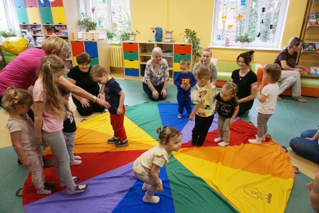 Dnia 25.02.2026 r. odbyły się zajęcia dla przedszkolaków „Od zabawy do czytania”, które łączą aktywność ruchową z literacką przygodą.Pierwsza część miała charakter integracyjny i ruchowy. Dzieci z entuzjazmem brały udział w zabawach z wykorzystaniem si-gumy oraz kolorowych chustek, co sprzyjało współpracy i budowaniu relacji w grupie. Nie zabrakło również gimnastyki przy muzyce. Rytmiczne ćwiczenia pozwoliły rozładować energię. Dużo emocji wzbudził, tradycyjnie tor przeszkód. Rozwijał sprawność ruchową, koordynację oraz uczył pokonywania trudności.