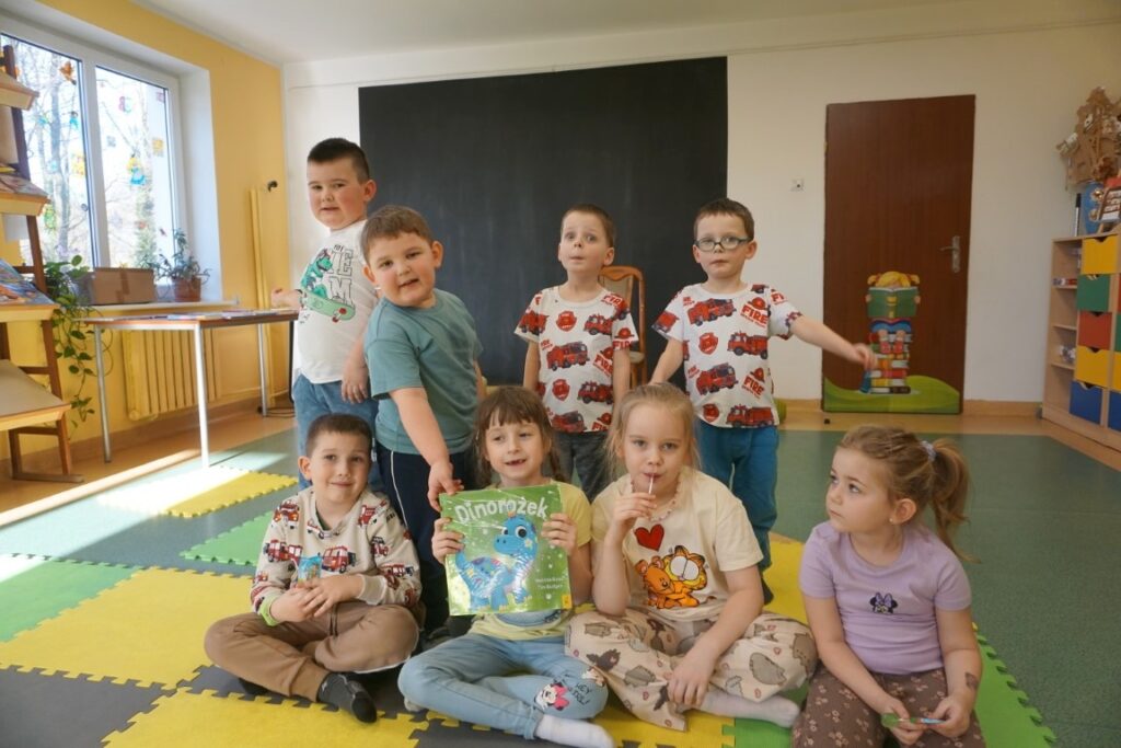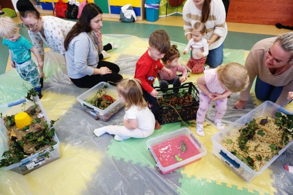 Dnia 4.03.26 odbyły się zajęcia z maluszkami-Molikami, które zawsze są nieprzewidywalne. Mali uczestnicy dopasowują program do własnych preferencji i upodobań w danej chwili. Generalnie starają się dopasować do harmonogramu zajęć, z małymi wyjątkami. Tym razem było podobnie. Przywitaliśmy się wesoło, uruchamiając poszczególne części ciała, w kole się pokręciliśmy. Komendę „Stop” uruchomiliśmy, idąc, skacząc, biegnąc….Wszyscy siedli na dywanie, były wierszyki i troszkę rytmiki. Gdy się wyciszyli, zobaczyli i usłyszeli małego dinusia, który wydawał dziwne głosy. Pani w rękach go trzymała i dzieciom pokazywała. One spoglądały i w cale się nie bały. Potem folię rozciągały i nią wachlowały. Chwilę się bawiły.