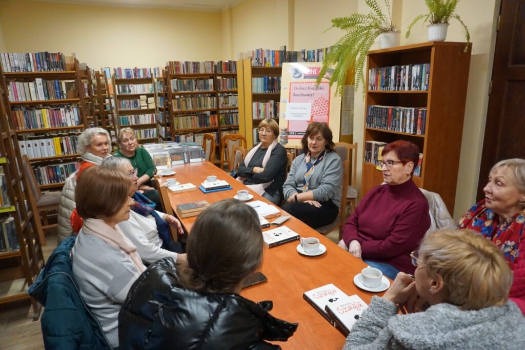Dnia 25.11.2025 odbyło się czytelnicze spotkanie członkiń Dyskusyjnego Klubu Książki. Uczestniczyło w nim 11 pań. Rozmawiano o humorystycznej powieści Moniki Szwaja pt: „Gosposia prawie do wszystkiego”. Główna bohaterka, literaturoznawczyni Mareszka, w sytuacji kryzysowej postanawia, drastycznie odmienić swoje życie. Nie chce tkwić w toksycznym związku, zrywa więc ze swoimi życiowymi schematami. Życie przecież przynosi wiele możliwości. Wystarczy tylko otworzyć się na świat i ludzi. Maria podejmuje ryzyko. Chce sama decydować o swoim życiu. Zostaje gosposią domową prawie do wszystkiego. Spotkania z ludźmi i praca „po domach” przynoszą jej radość. Na swojej drodze spotyka osoby, którym chce zaufać i obdarzyć miłością. Może pokochać kogoś o pięćdziesiąt lat starszego od siebie lub o pięćdziesiąt lat młodszego.