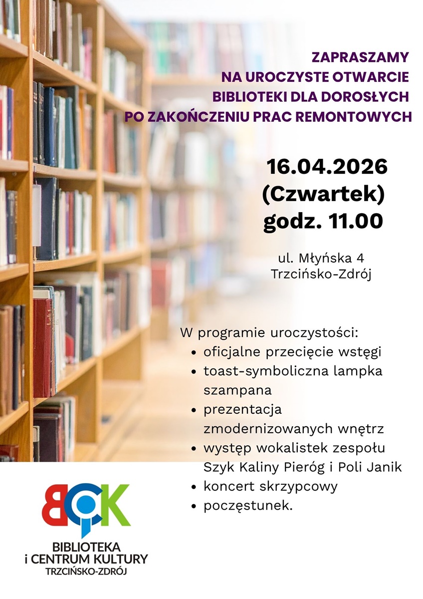 Wreszcie możemy to ogłosić! Otwieramy się ponownie dla Was! Remont dobiegł końca, zapach nowości unosi się w powietrzu, a książki już nie mogą doczekać się powrotu na swoje półki. Serdecznie zapraszamy na uroczyste otwarcie Biblioteki dla Dorosłych w nowej odsłonie, które odbędzie się w czwartek, 16 kwietnia 2026 roku o godzinie 11:00 przy ul. Młyńskiej 4 w Trzcińsku-Zdroju. Chcemy wspólnie z Wami świętować ten nowy rozdział w historii naszej placówki, dlatego przygotowaliśmy program pełen atrakcji, muzyki i miłych spotkań. W planie uroczystości przewidzieliśmy oficjalne przecięcie wstęgi, symboliczny toast oraz prezentację zmodernizowanych wnętrz, które całkowicie zmieniły swoje oblicze. Wydarzenie uświetnią występy artystyczne: koncert skrzypcowy oraz popis wokalny w wykonaniu wokalistek zespołu Szyk ? Kaliny Pieróg i Poli Janik. Na gości czekać będzie również słodki poczęstunek. Przyjdźcie i zobaczcie sami, jak zmieniła się Wasza biblioteka.