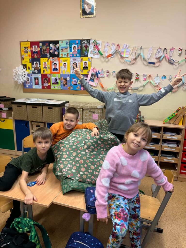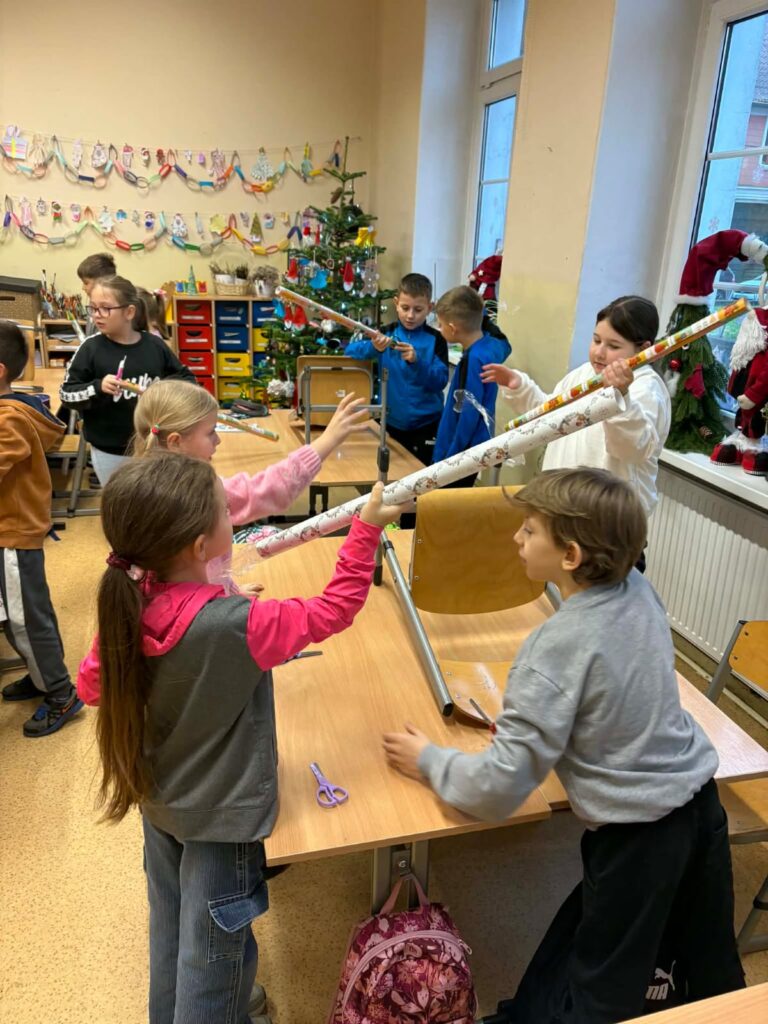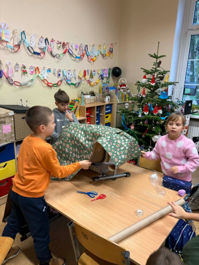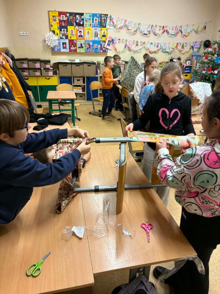 Następnie uczniowie wysłuchali bajki Bogusia Janiszewskiego „Wielkie mi rzeczy„, zaprezentowanej w formie teatrzyku Kamishibai. Historia elfa Olafa stała się punktem wyjścia do rozmowy o współpracy, pomysłowości oraz wzajemnej pomocy. W kolejnej części zajęć dzieci pracowały w grupach. Miały za zadanie zapakować nietypowy prezent – krzesło. Każda grupa wykazała się dużą kreatywnością, a przygotowane prezenty różniły się pomysłami i sposobami pakowania. Współpraca