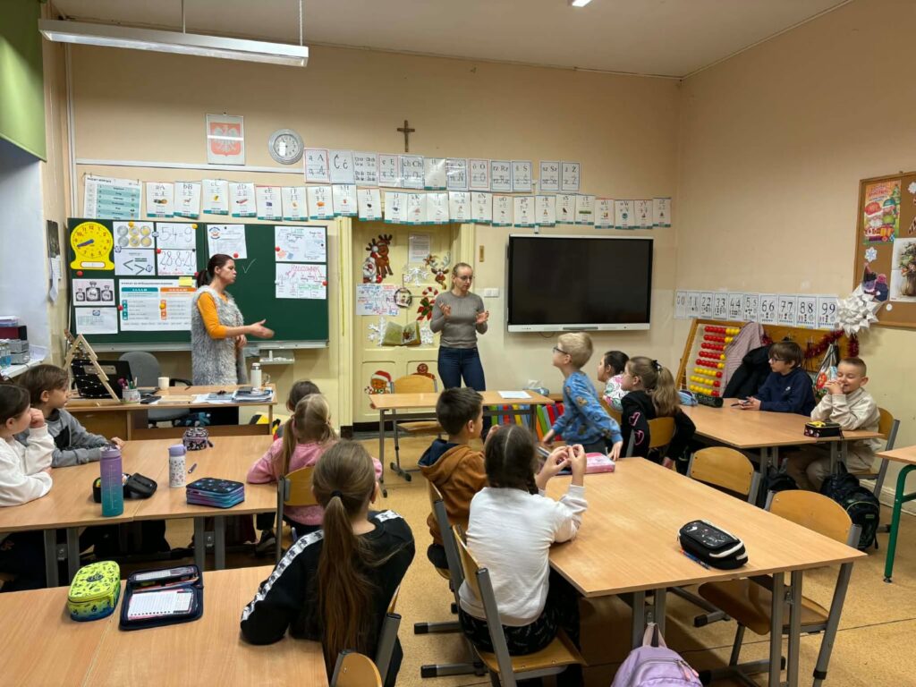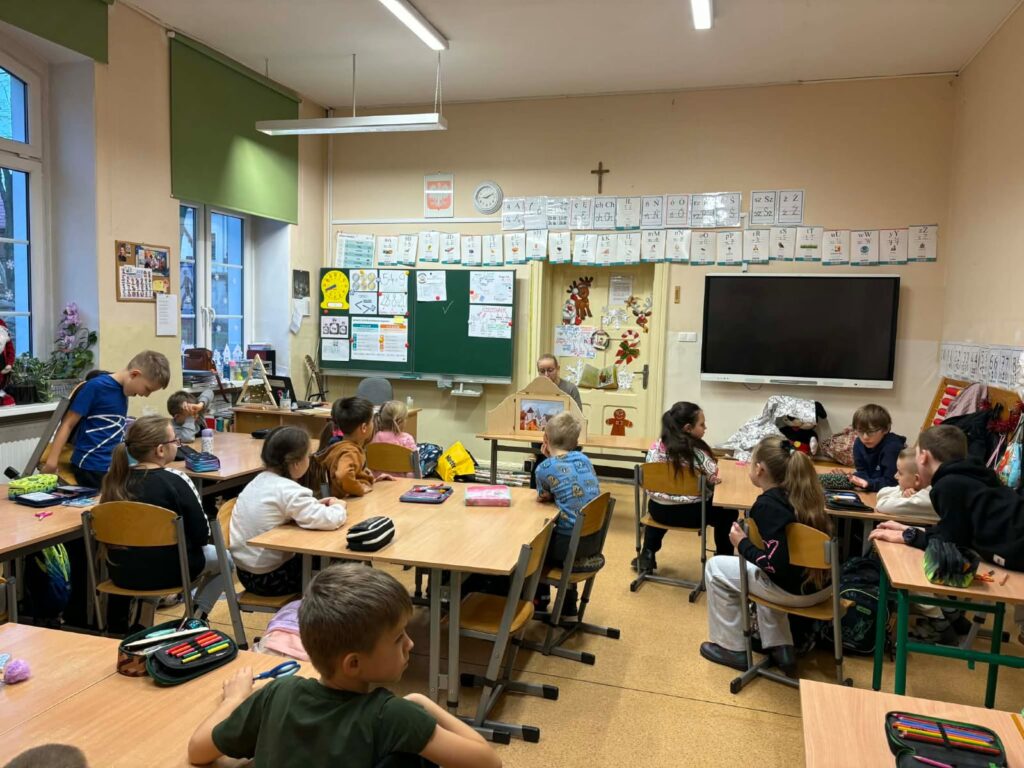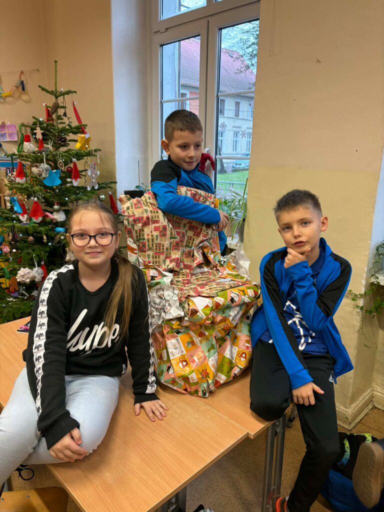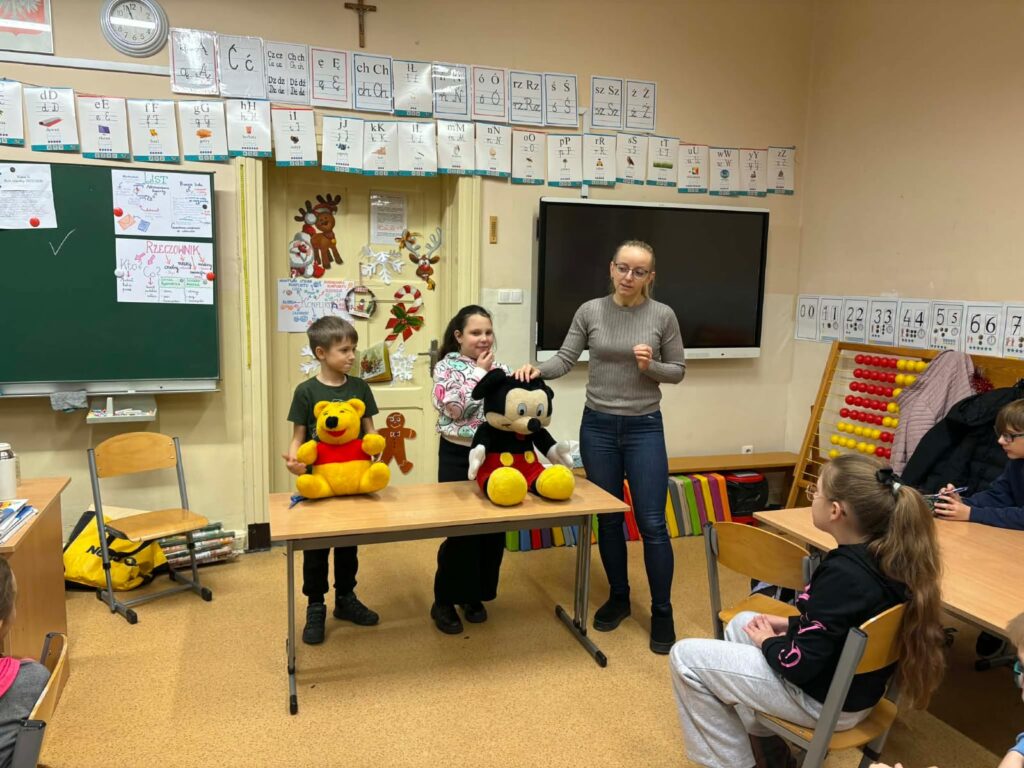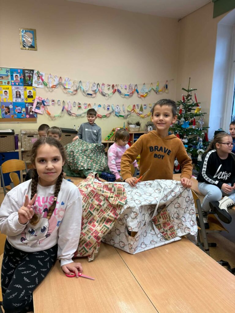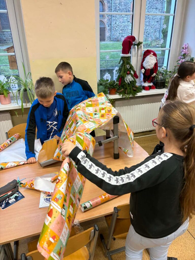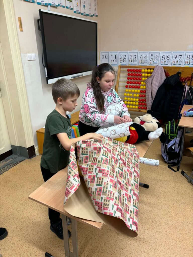 Dnia 15.12.2025 odbyły się zajęcia biblioteczne dla uczniów kl. II, które wyjątkowo, zostały przeprowadzone w sali lekcyjnej Szkoły Podstawowej w Trzcińsku-Zdroju. Na początku spotkania, dwoje wybranych dzieci otrzymało zadanie samodzielnego zapakowania maskotki. Zadanie początkowo wydawało się bardzo proste, jednak szybko okazało się, że jego wykonanie nie było takie łatwe.