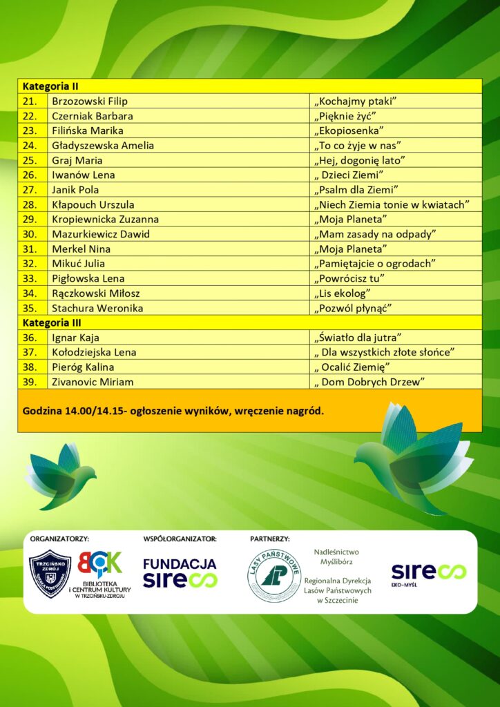 Lista wykonawców V Wojewódzkiego Festiwalu Piosenki Ekologicznej „W ZIELONE GRAJMY DZIŚ”- 17.04.2026