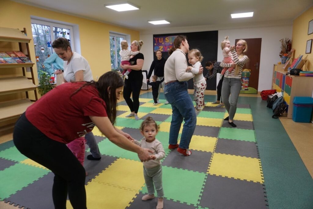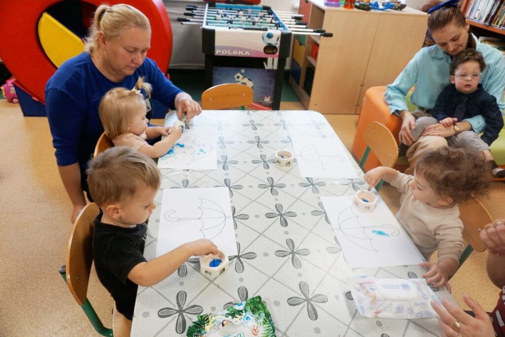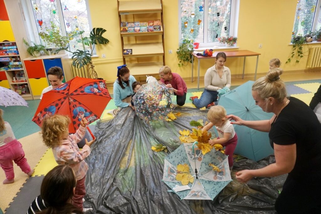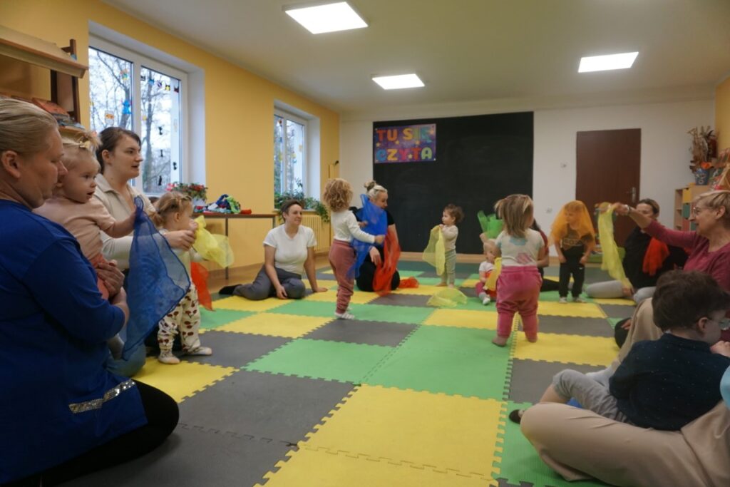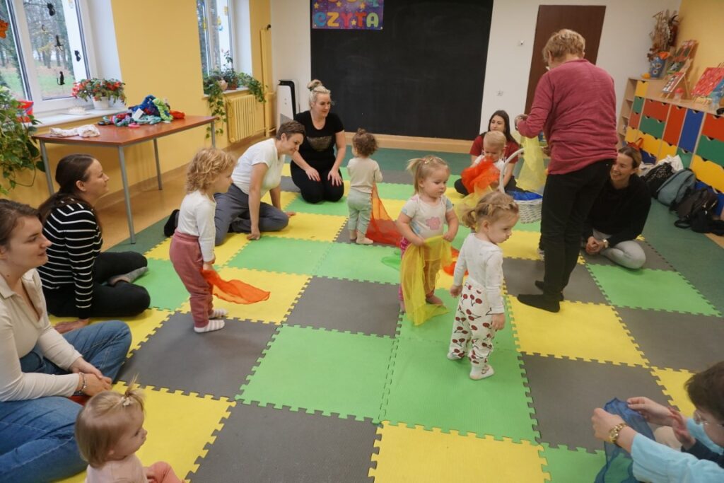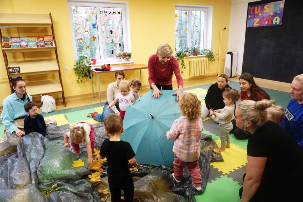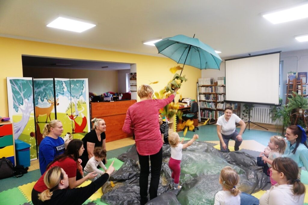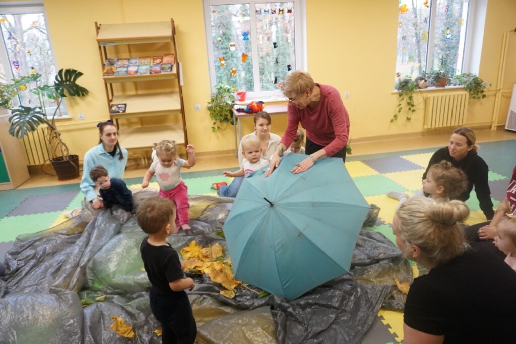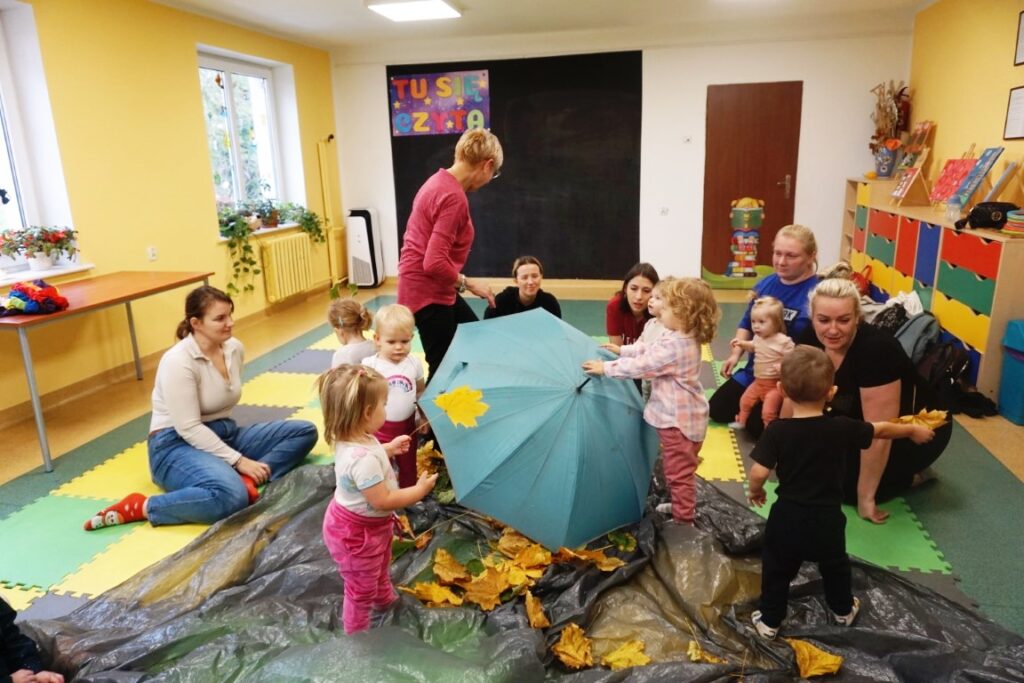 Dnia 19.11.25 przy deszczowej pogodzie, odbyło się molikowe spotkanie. Niektóre nie przyjechały, bo się pochorowały. Dzieci w kręgu się zgromadziły. W środku układanki się pojawiły. Cierpliwie je układały. Poszczególne elementy w odpowiednie miejsca wkładały. Zwierzątka rozpoznawały. Potem dopiero się przywitały. Jak koniki brykały i w rytmie klaskały. Kółeczka do rączek dostały: brum, brum…! Zawołały. Na podłodze je położyły. Przez kałużę hop! Zrobiły. Folią poszumiały: pa, pa, pa…szu, szu, szu…Deszczyk stuka: stuk, stuk, stuk…Parasole rozłożyły i kap, kap, stukając mówiły. Liście do nich wrzucały i je odwracały. Sypały się liście złociście. Dzieci się radowały.