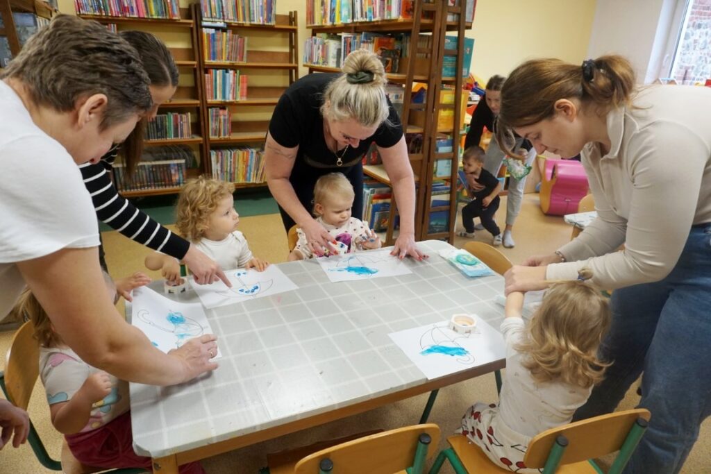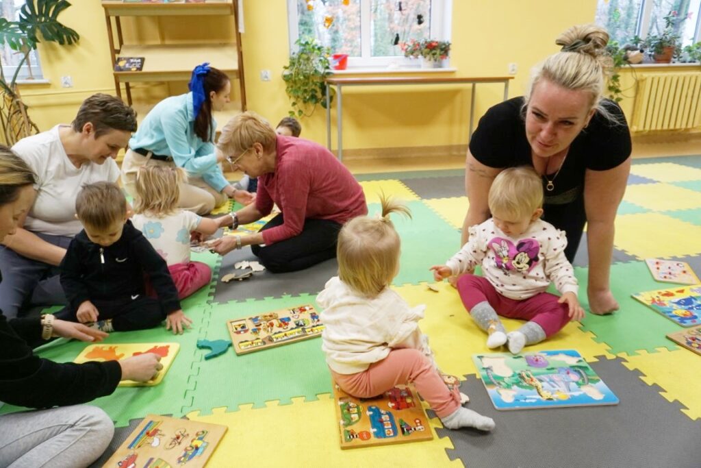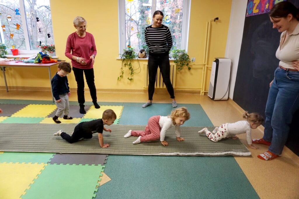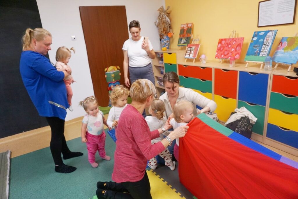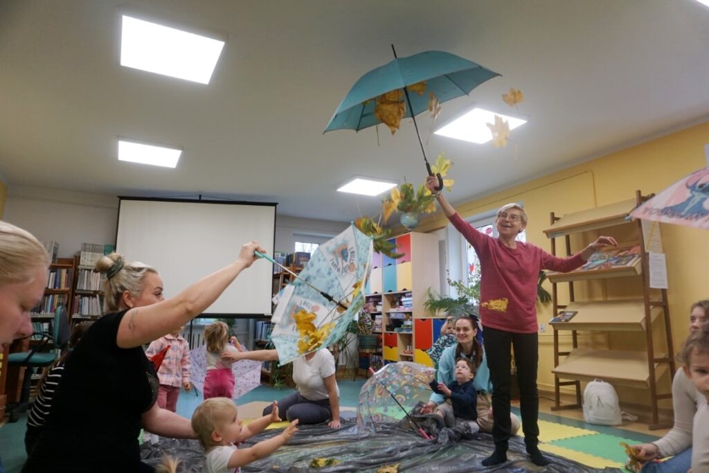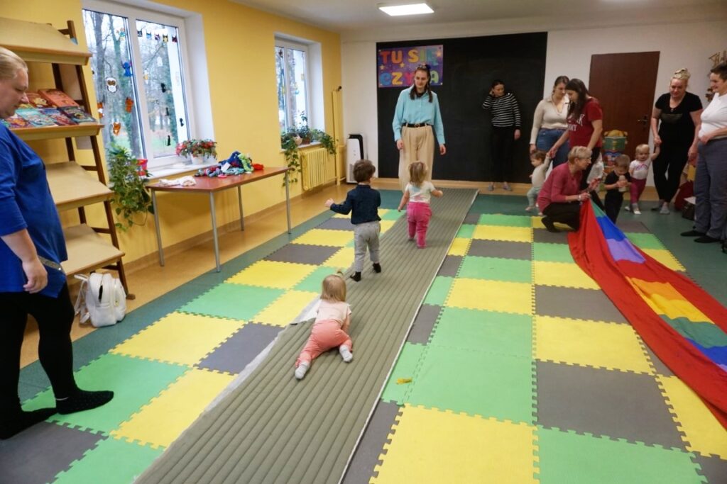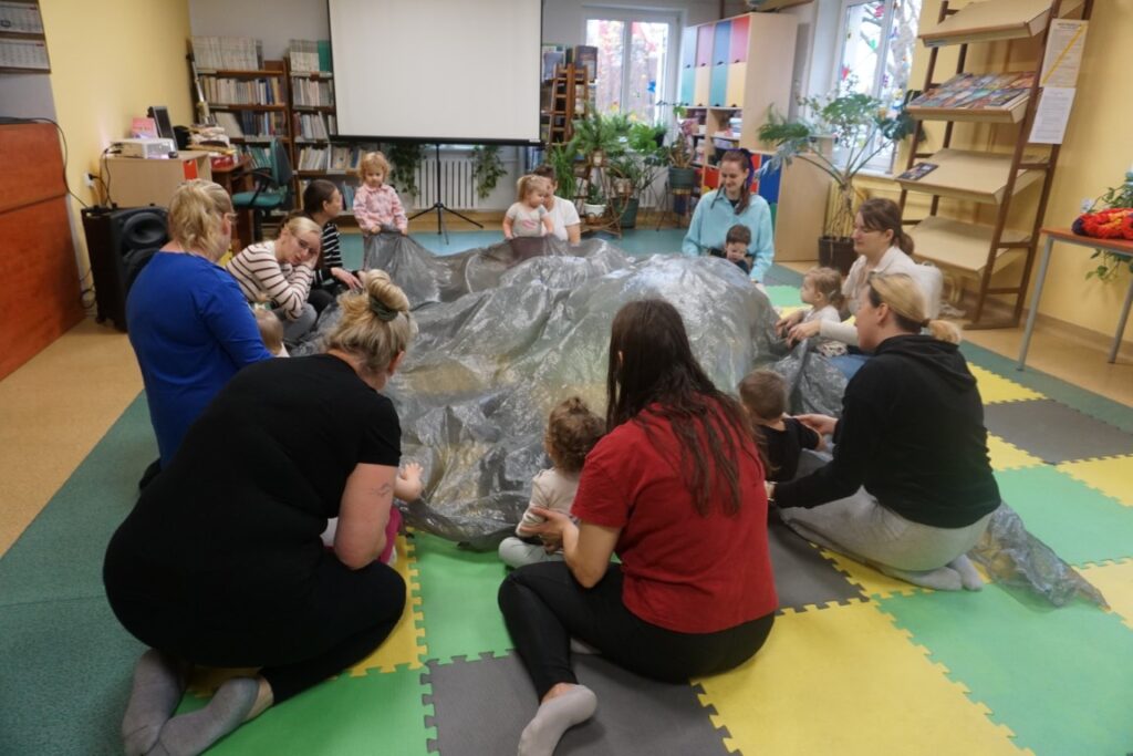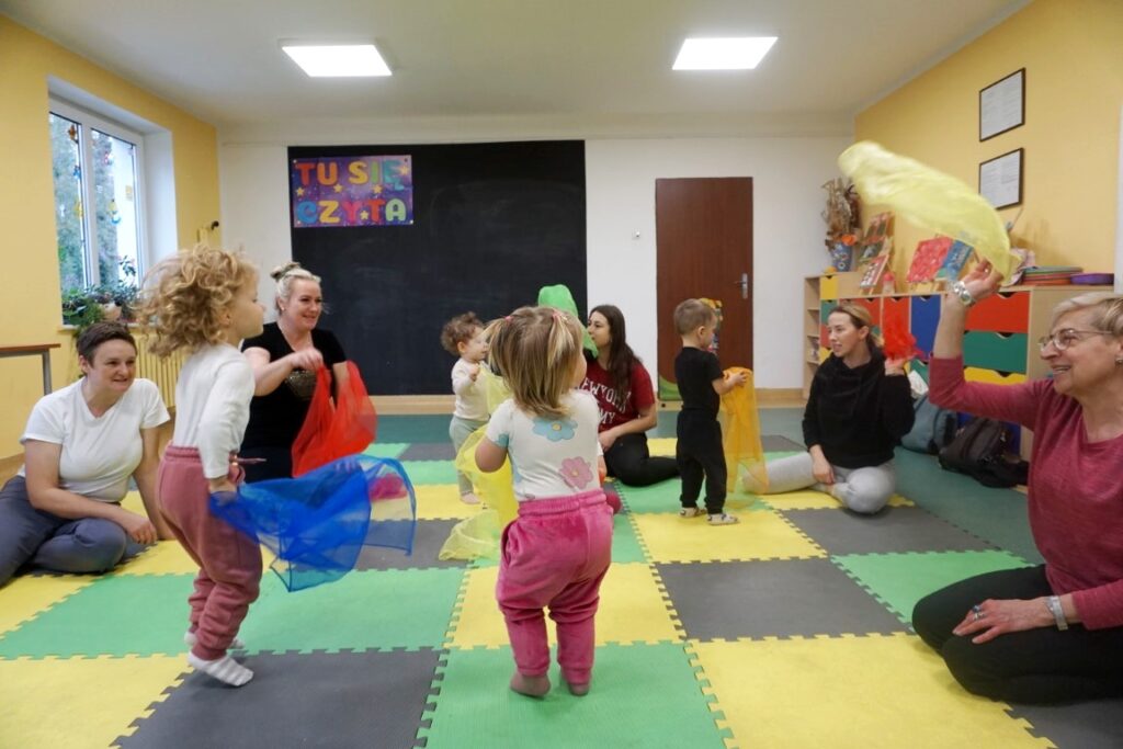 Dnia 19.11.25 przy deszczowej pogodzie, odbyło się molikowe spotkanie. Niektóre nie przyjechały, bo się pochorowały. Dzieci w kręgu się zgromadziły. W środku układanki się pojawiły. Cierpliwie je układały. Poszczególne elementy w odpowiednie miejsca wkładały. Zwierzątka rozpoznawały. Potem dopiero się przywitały. Jak koniki brykały i w rytmie klaskały. Kółeczka do rączek dostały: brum, brum…! Zawołały. Na podłodze je położyły. Przez kałużę hop! Zrobiły. Folią poszumiały: pa, pa, pa…szu, szu, szu…Deszczyk stuka: stuk, stuk, stuk…Parasole rozłożyły i kap, kap, stukając mówiły. Liście do nich wrzucały i je odwracały. Sypały się liście złociście. Dzieci się radowały.