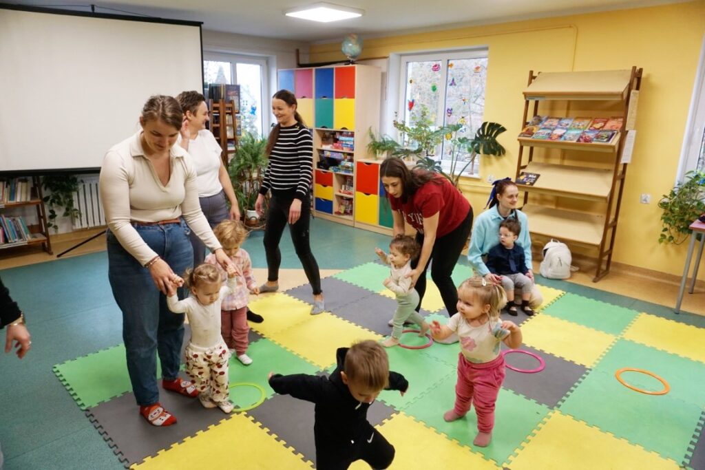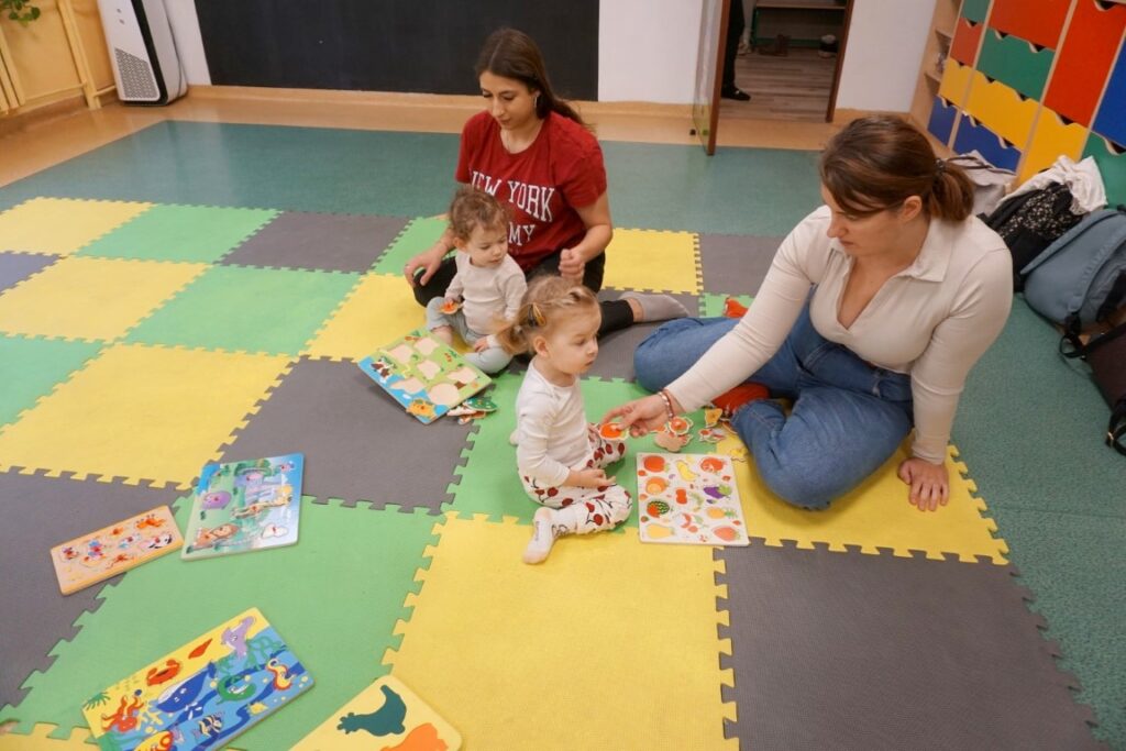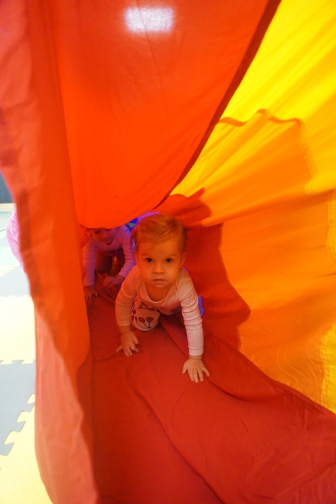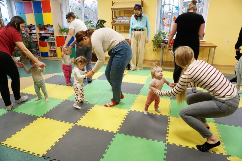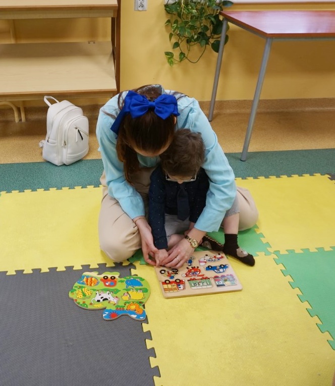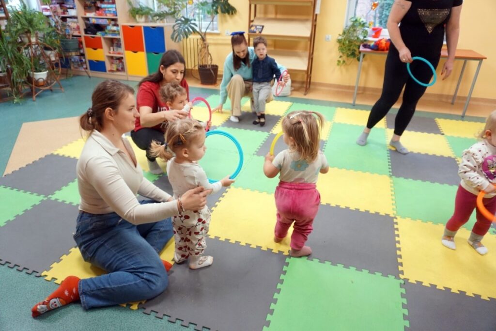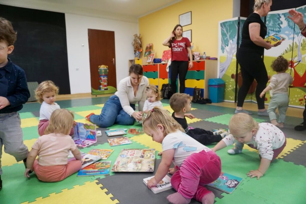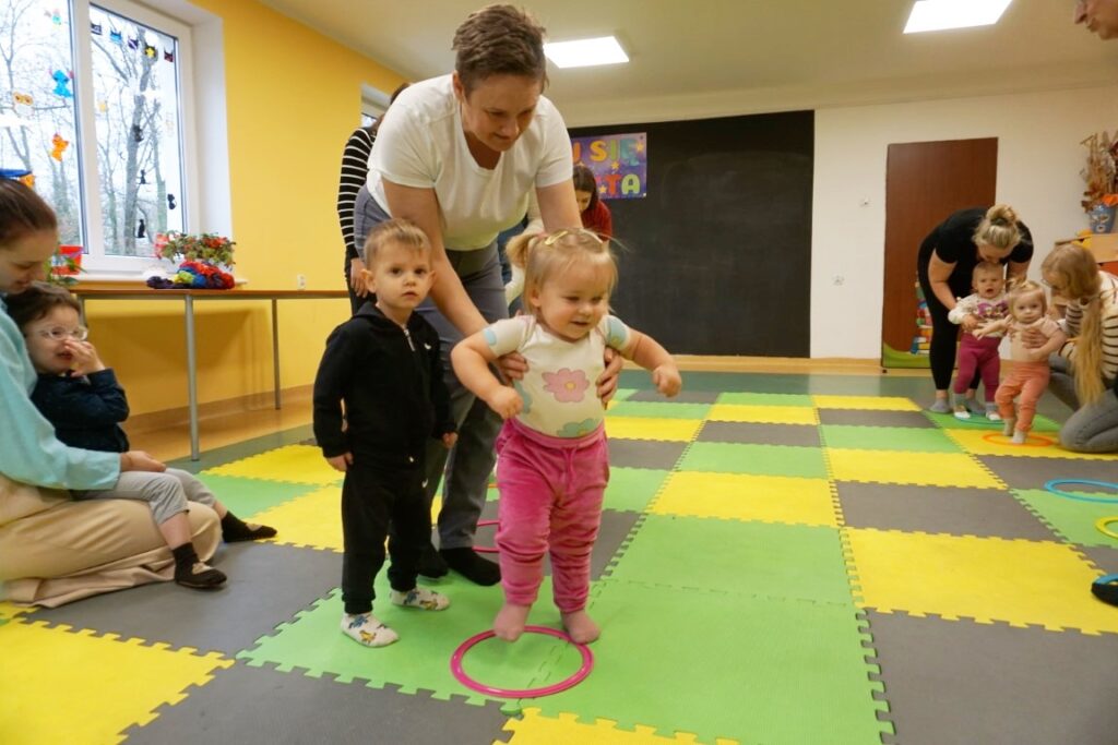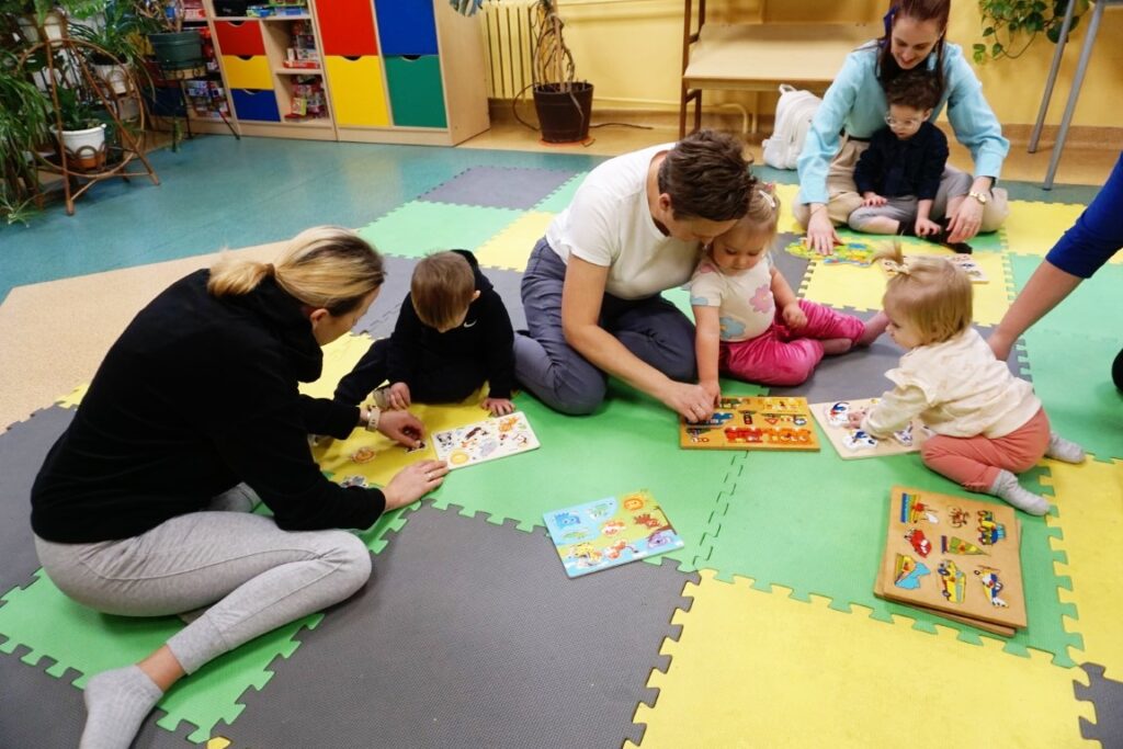 Dnia 19.11.25 przy deszczowej pogodzie, odbyło się molikowe spotkanie. Niektóre nie przyjechały, bo się pochorowały. Dzieci w kręgu się zgromadziły. W środku układanki się pojawiły. Cierpliwie je układały. Poszczególne elementy w odpowiednie miejsca wkładały. Zwierzątka rozpoznawały. Potem dopiero się przywitały. Jak koniki brykały i w rytmie klaskały. Kółeczka do rączek dostały: brum, brum…! Zawołały. Na podłodze je położyły. Przez kałużę hop! Zrobiły. Folią poszumiały: pa, pa, pa…szu, szu, szu…Deszczyk stuka: stuk, stuk, stuk…Parasole rozłożyły i kap, kap, stukając mówiły. Liście do nich wrzucały i je odwracały. Sypały się liście złociście. Dzieci się radowały.