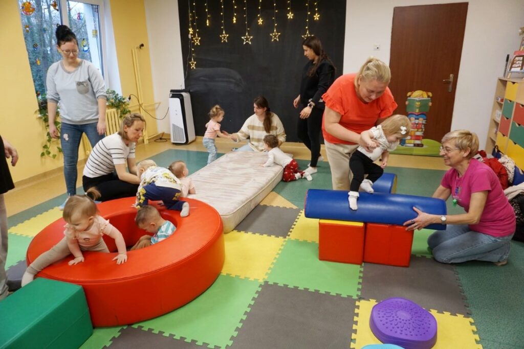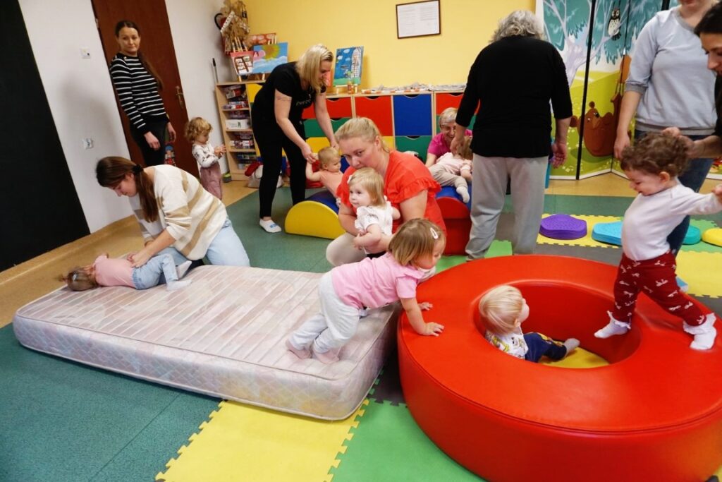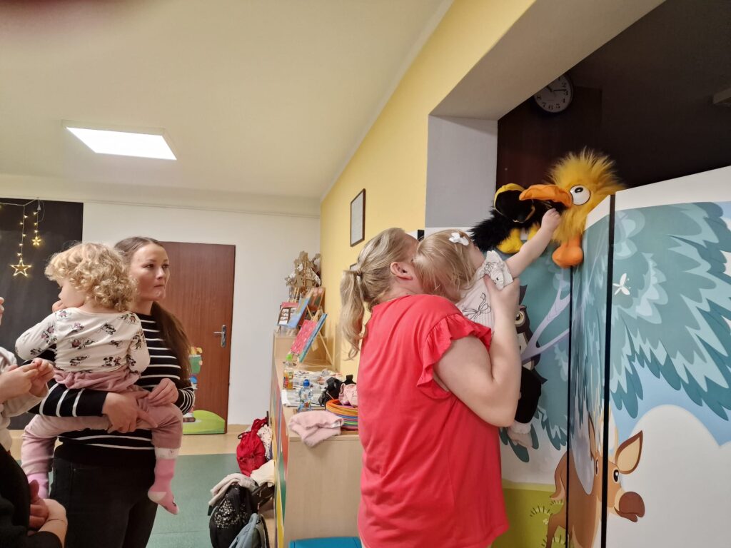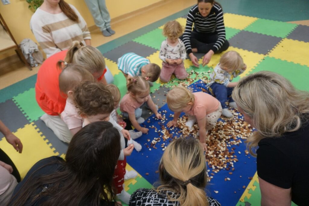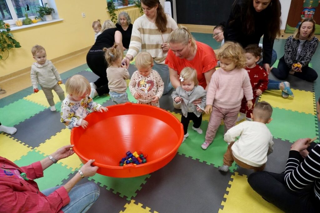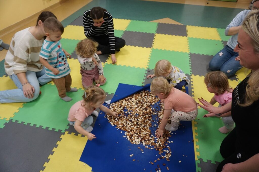 Dzieci bawiły się trzema dużymi piłkami, co wspierało rozwój motoryki dużej, chwytu i percepcji przestrzennej. Aktywność przechodząca w zabawę – sprzątanie i wrzucanie kulek do wielkiego bączka – wzmacniało poczucie odpowiedzialności, a także koordynację ruchową. Chodząc po obwodzie koła, maluchy machały rączkami jak skrzydłami i śpiewały: „Ptaszki fruwają Ćwir, ćwir, ćwir, fiu, fiu, nasyp nam ziarenek tu…” – ćwiczenie naśladowania, rytmu i koordynacji. Ważnym punktem zajęć była zabawa tematyczna z wykorzystaniem ziarenek, stymulująca zmysły. Na macie wysypano ziarenka. Dzieci ćwiczyły chwyt pęsetowy i małą motorykę, zbierając je paluszkami i wrzucając do wiaderek.. Niespodzianie pojawiły się dwa Ptaki-Cudaki, które „chciały jeść i głośno krakały”. Dzieci wkładały ziarenka prosto do ich dziobów, rozwijając empatię, precyzję i odgrywanie ról. Pokonywały tor przeszkód, który stanowił doskonałe ćwiczenie motoryki dużej, równowagi i integracji sensorycznej: Sensoryczne wyspy i jeżyki (stymulacja dotykowa stóp); Mega bloki ustawione szeregowo (ćwiczenie równowagi); Opona (przechodzenie/przeczołgiwanie); Materac do skakania (skoki, amortyzacja); Duży tunel (czołganie, orientacja w przestrzeni) itp.
