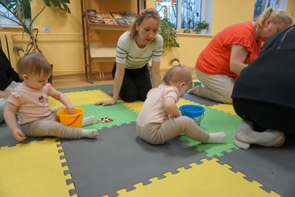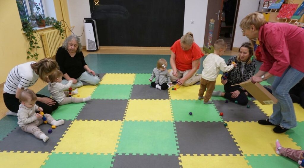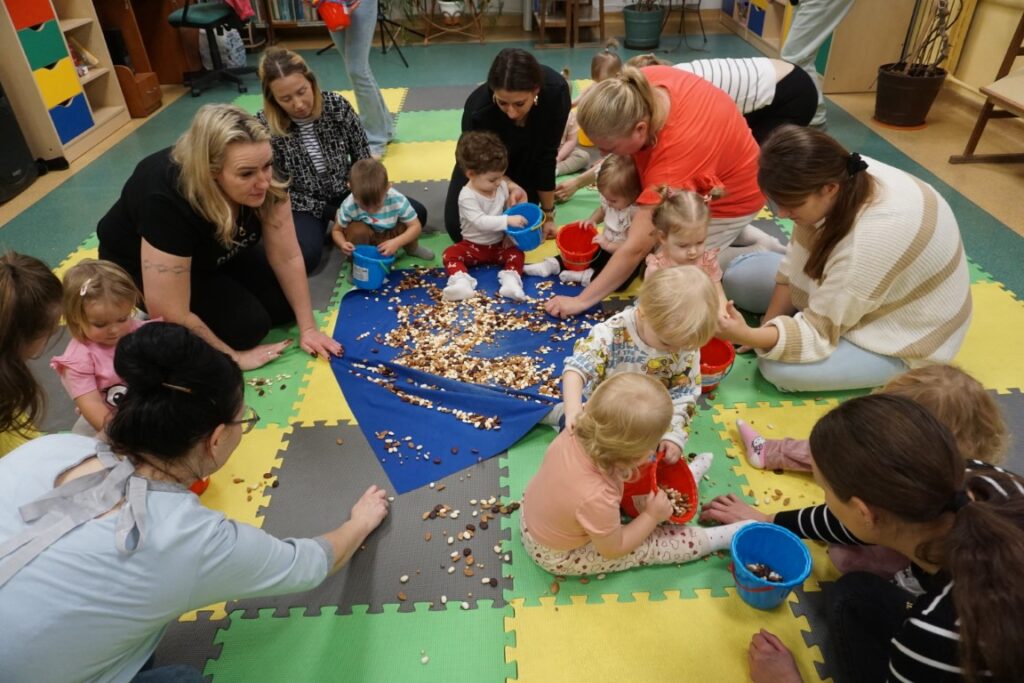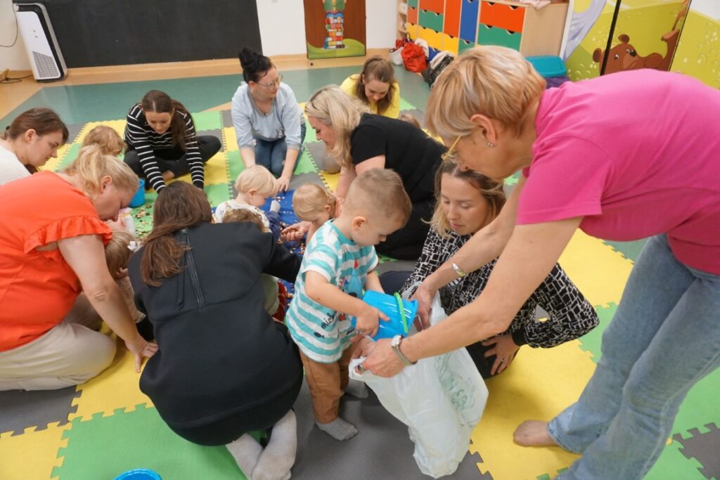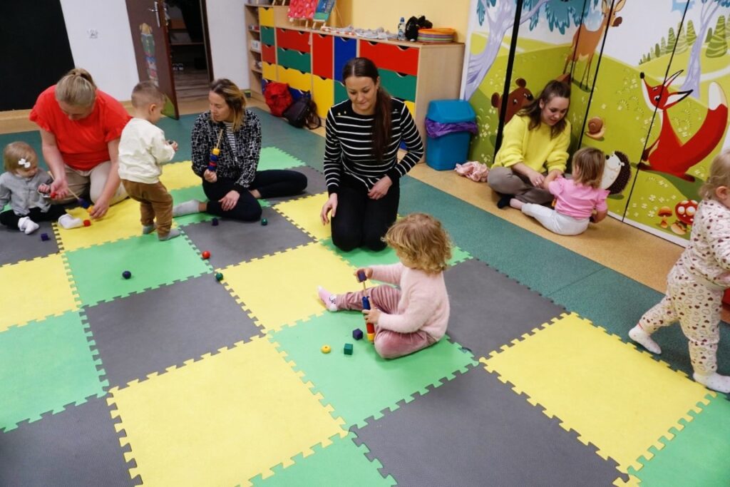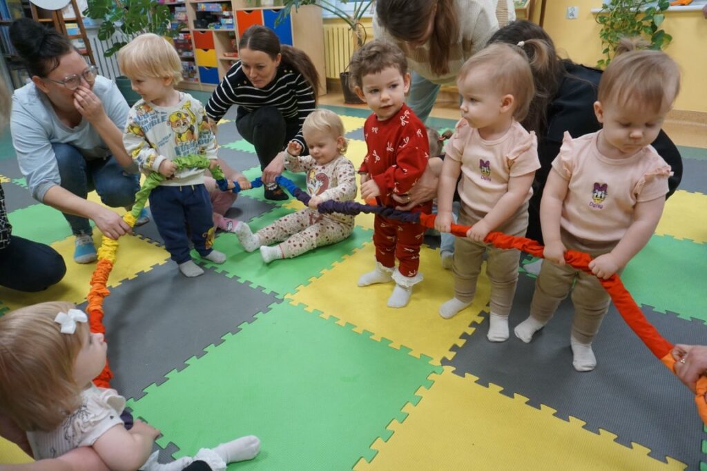 Dzieci bawiły się trzema dużymi piłkami, co wspierało rozwój motoryki dużej, chwytu i percepcji przestrzennej. Aktywność przechodząca w zabawę – sprzątanie i wrzucanie kulek do wielkiego bączka – wzmacniało poczucie odpowiedzialności, a także koordynację ruchową. Chodząc po obwodzie koła, maluchy machały rączkami jak skrzydłami i śpiewały: „Ptaszki fruwają Ćwir, ćwir, ćwir, fiu, fiu, nasyp nam ziarenek tu…” – ćwiczenie naśladowania, rytmu i koordynacji. Ważnym punktem zajęć była zabawa tematyczna z wykorzystaniem ziarenek, stymulująca zmysły. Na macie wysypano ziarenka. Dzieci ćwiczyły chwyt pęsetowy i małą motorykę, zbierając je paluszkami i wrzucając do wiaderek.. Niespodzianie pojawiły się dwa Ptaki-Cudaki, które „chciały jeść i głośno krakały”. Dzieci wkładały ziarenka prosto do ich dziobów, rozwijając empatię, precyzję i odgrywanie ról. Pokonywały tor przeszkód, który stanowił doskonałe ćwiczenie motoryki dużej, równowagi i integracji sensorycznej: Sensoryczne wyspy i jeżyki (stymulacja dotykowa stóp); Mega bloki ustawione szeregowo (ćwiczenie równowagi); Opona (przechodzenie/przeczołgiwanie); Materac do skakania (skoki, amortyzacja); Duży tunel (czołganie, orientacja w przestrzeni) itp.
