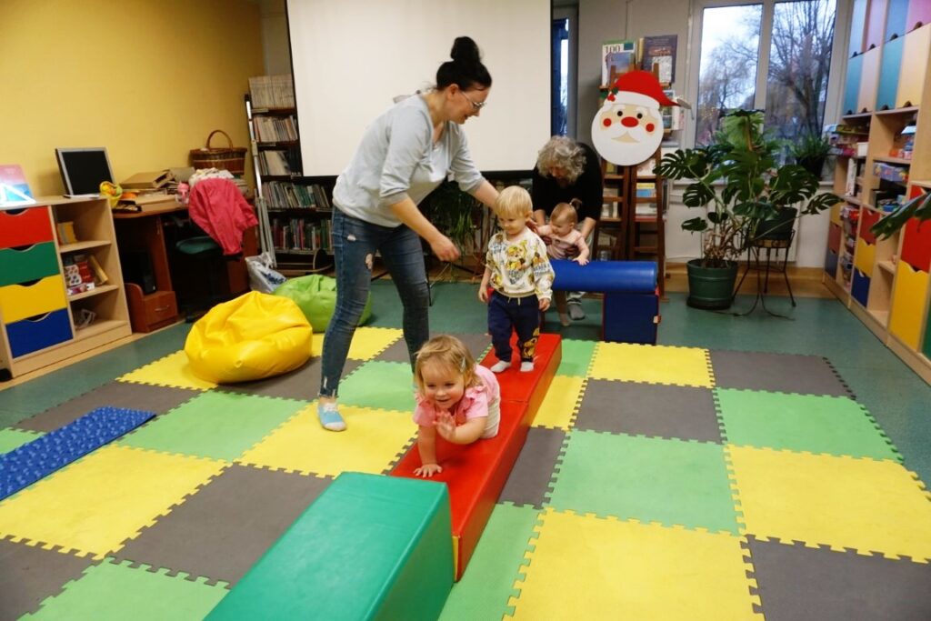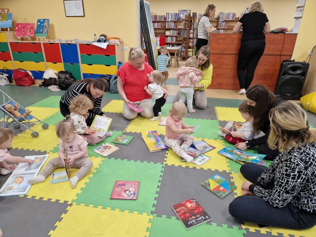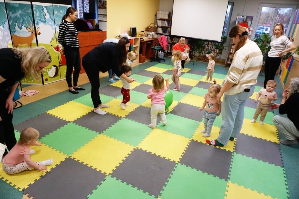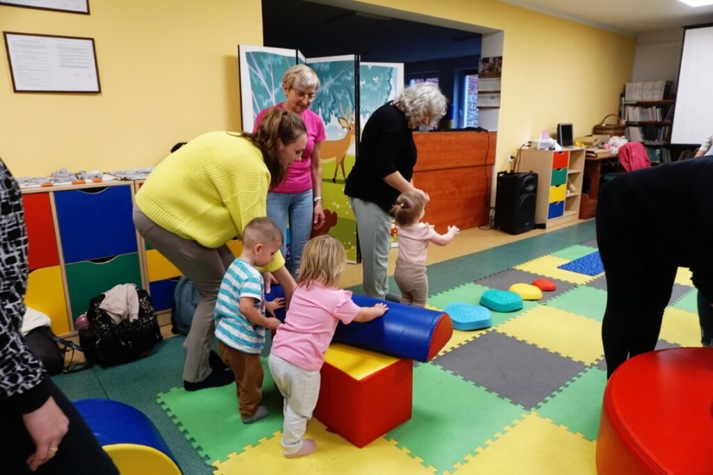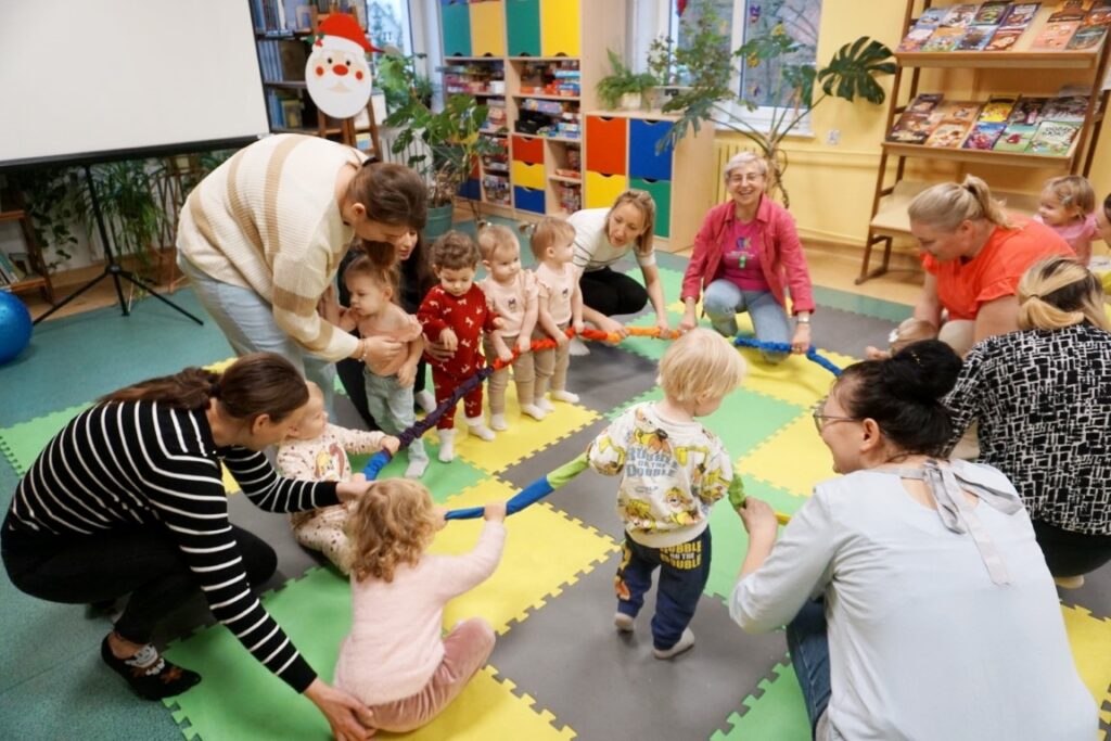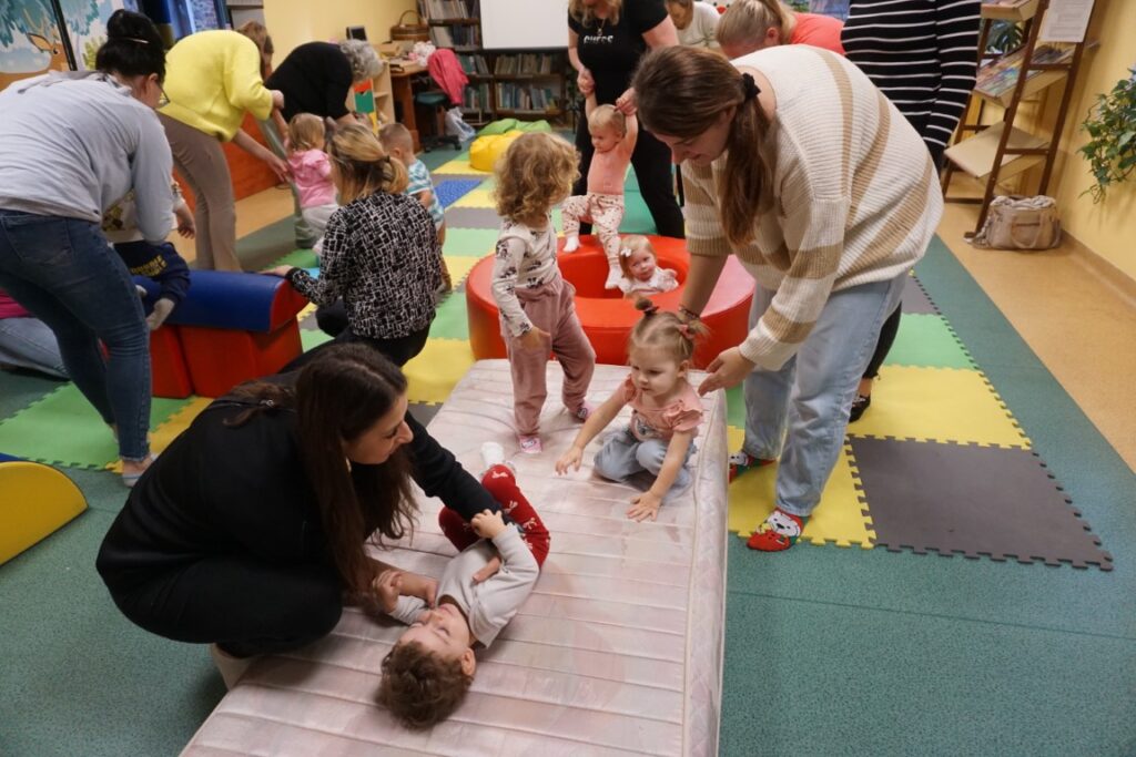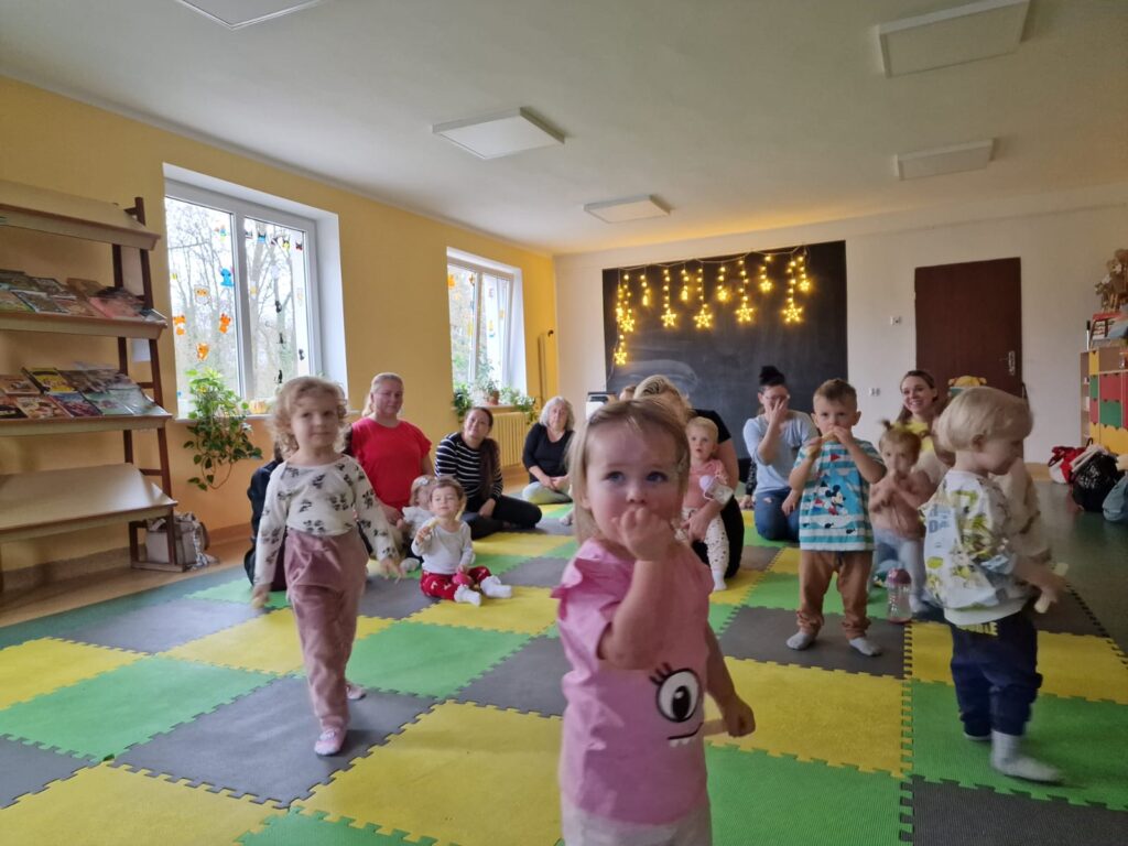 W środowe przedpołudnie 10.12.25 w dziecięcej Bibliotece miały miejsce zajęcia z maluszkami- Molikami, które skupiają się na rozwijaniu: motoryki małej i dużej, koordynacji wzrokowo-ruchowej, umiejętności sensorycznych i społecznych oraz rozbudzeniu zainteresowań czytelniczych.Zajęcia rozpoczęły się od aktywności rozwijającej precyzję chwytu i koordynację oko-ręka Dzieci nanizywały kolorowe kulki na drążek, ćwicząc małą motorykę i koncentrację. Gdy się chwilę pobawiły i rozluźnily, nastąpiło muzyczne powitanie: machały rączkami, tuptały nóżkami, kręciły główkami, brykały jak koniki…Następnie nadszedł czas na dynamiczne zabawy angażujące całe ciało.