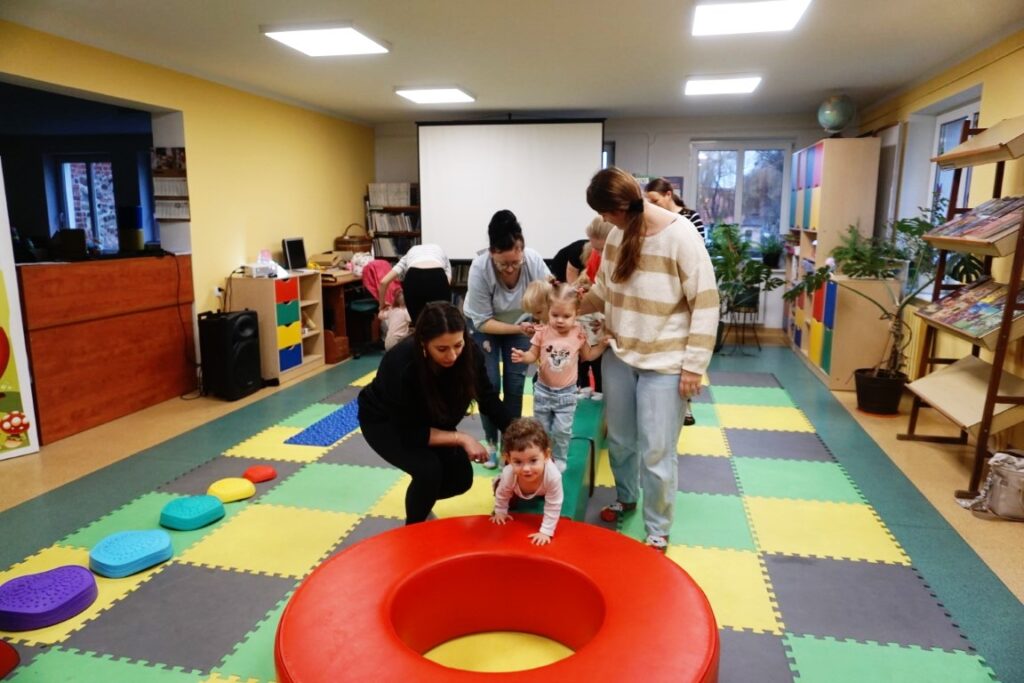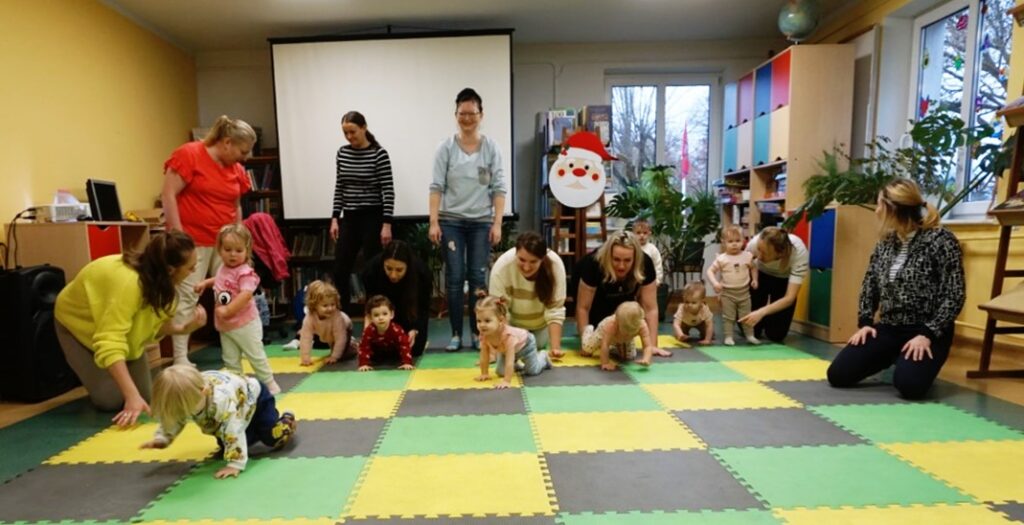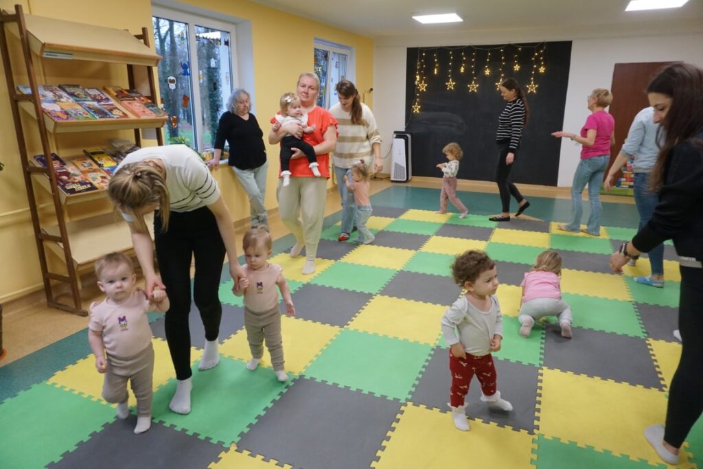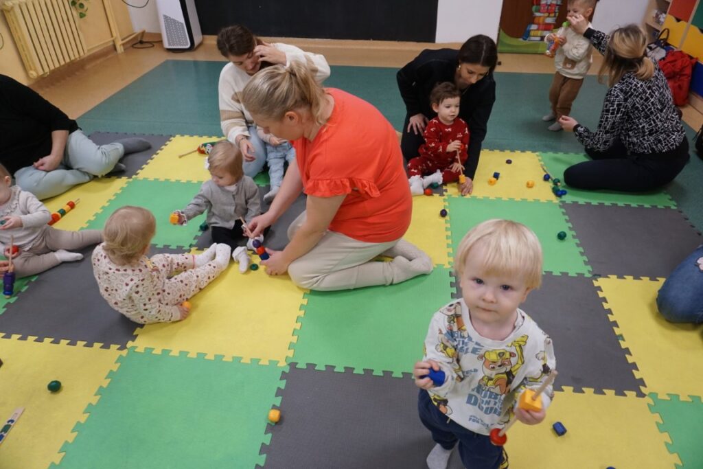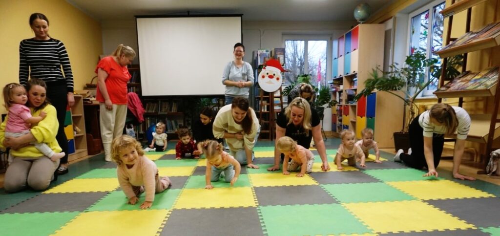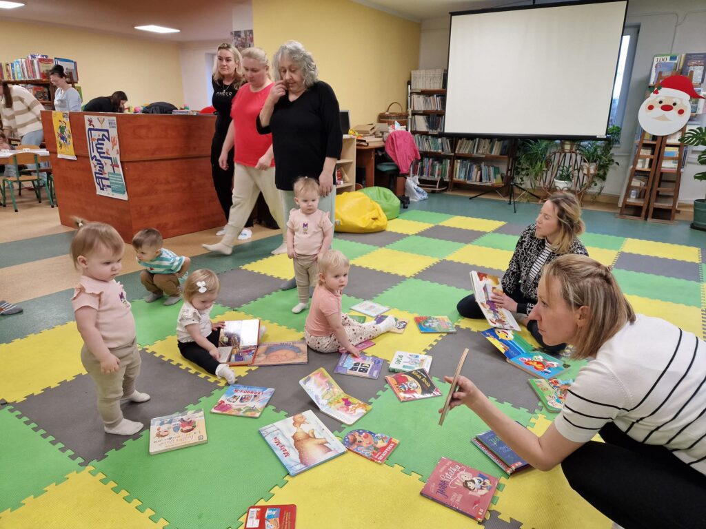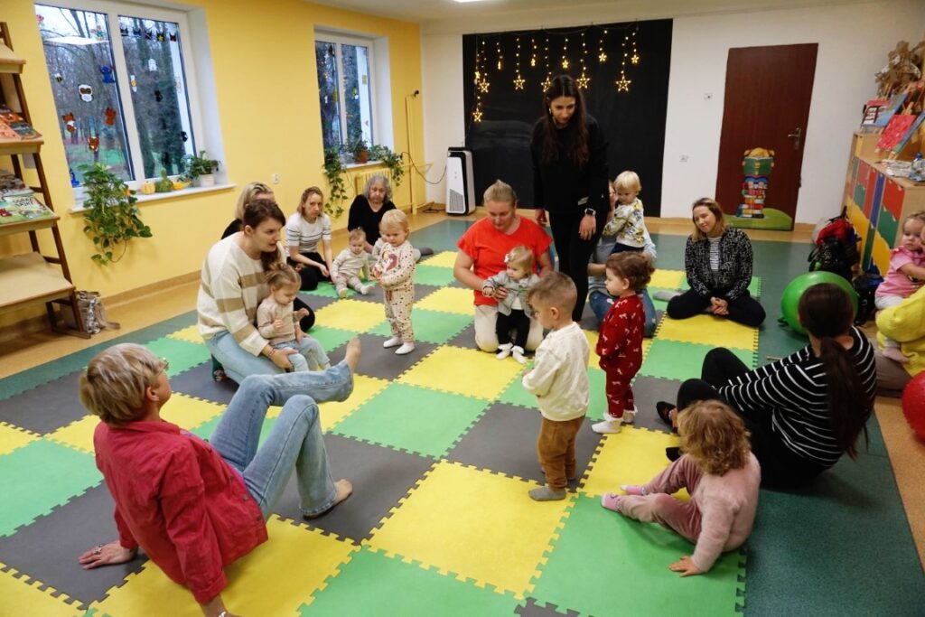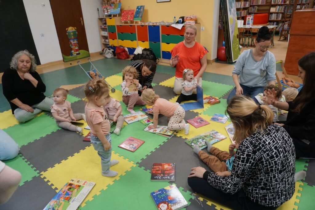 W środowe przedpołudnie 10.12.25 w dziecięcej Bibliotece miały miejsce zajęcia z maluszkami- Molikami, które skupiają się na rozwijaniu: motoryki małej i dużej, koordynacji wzrokowo-ruchowej, umiejętności sensorycznych i społecznych oraz rozbudzeniu zainteresowań czytelniczych.Zajęcia rozpoczęły się od aktywności rozwijającej precyzję chwytu i koordynację oko-ręka Dzieci nanizywały kolorowe kulki na drążek, ćwicząc małą motorykę i koncentrację. Gdy się chwilę pobawiły i rozluźnily, nastąpiło muzyczne powitanie: machały rączkami, tuptały nóżkami, kręciły główkami, brykały jak koniki…Następnie nadszedł czas na dynamiczne zabawy angażujące całe ciało.