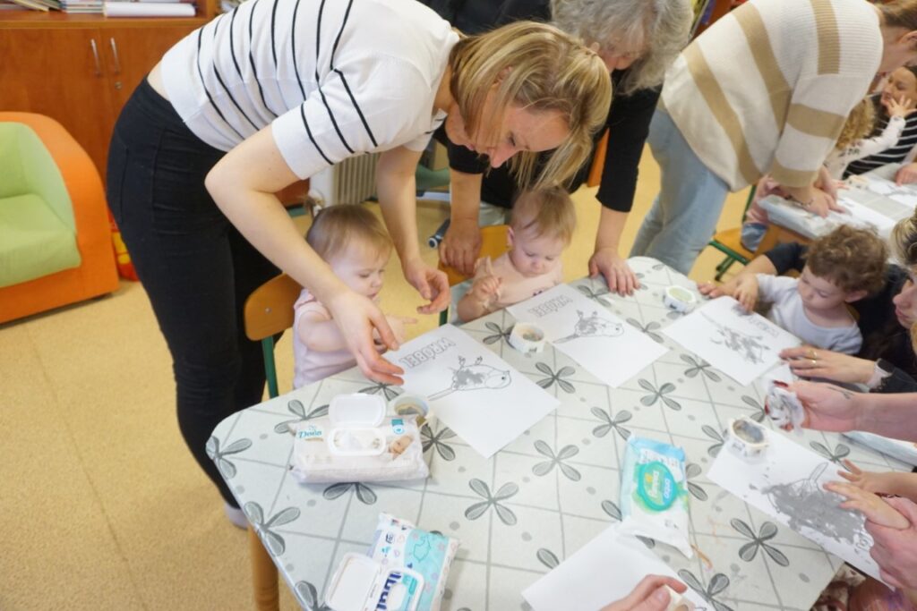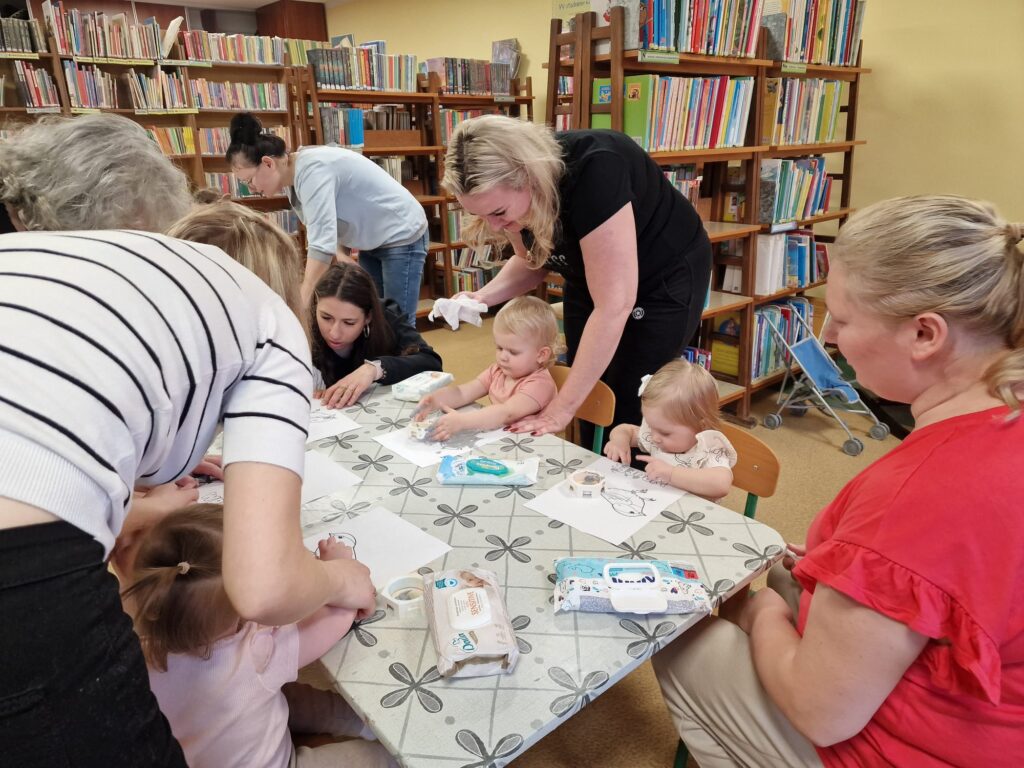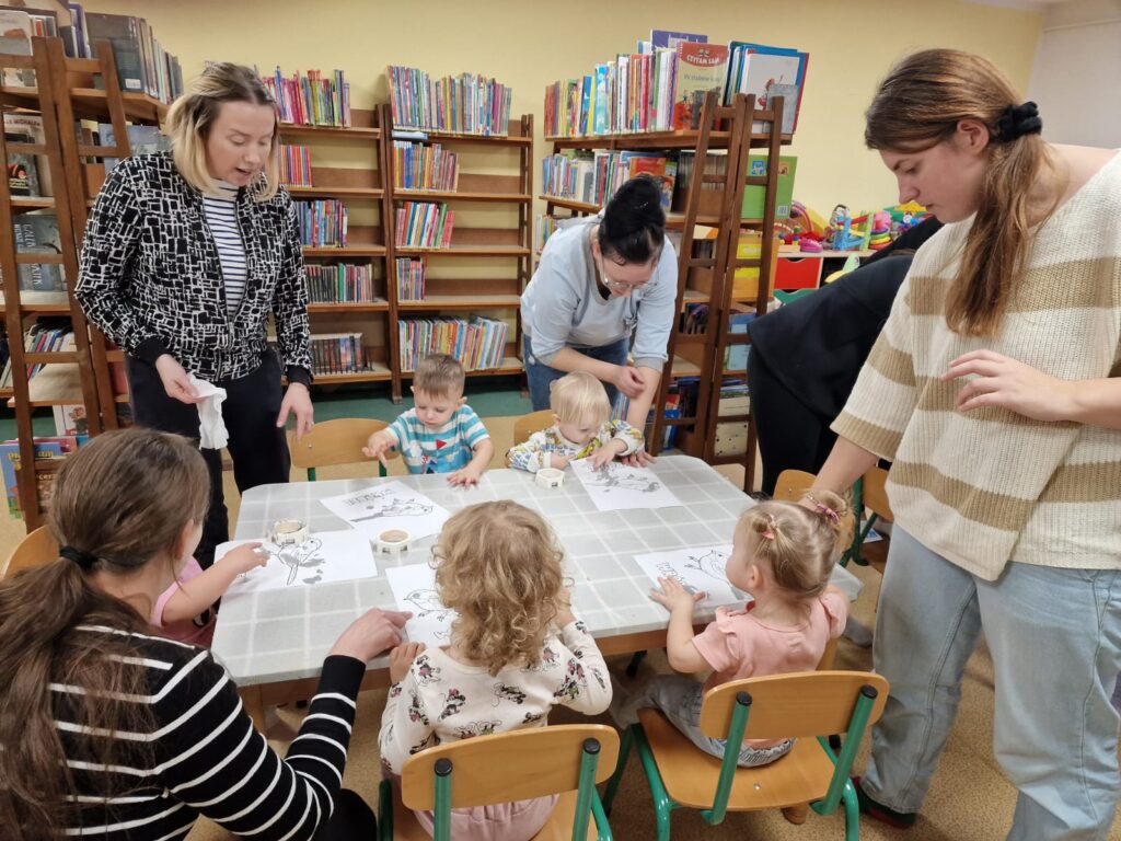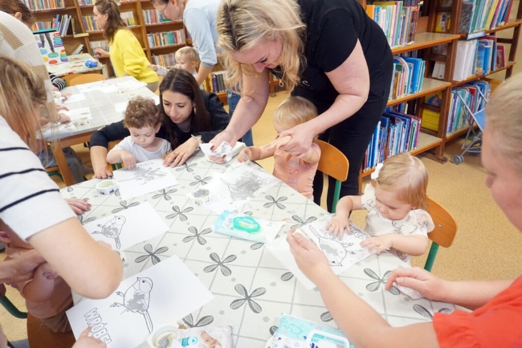 Spotkanie zakończyło się spokojniejszymi aktywnościami. Dzieci malowały wróbelka paluszkami, co było kolejnym ćwiczeniem małej motoryki, precyzji i kreatywności. Potem spotkały się z książkami. Ogladały, wybierały, nawet czytały, naśladując dorosłych, co wspiera rozwój mowy i miłość do literatury. Zajęcia zakończyły się pożegnaniem i wypożyczaniem książek.