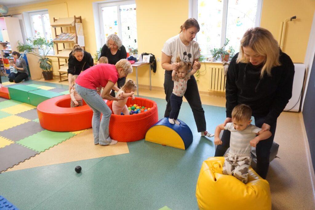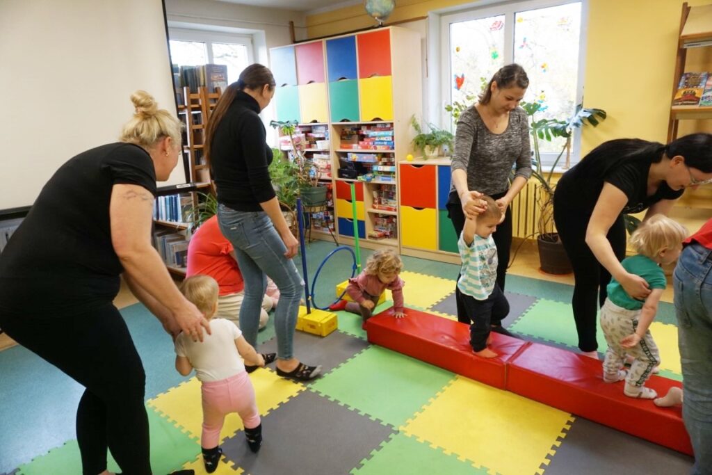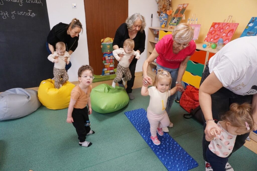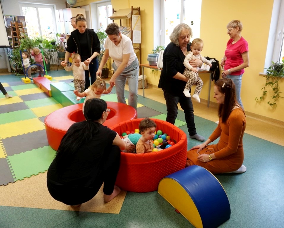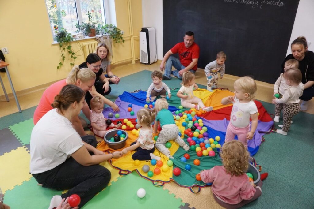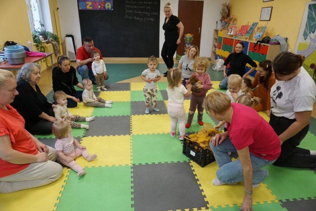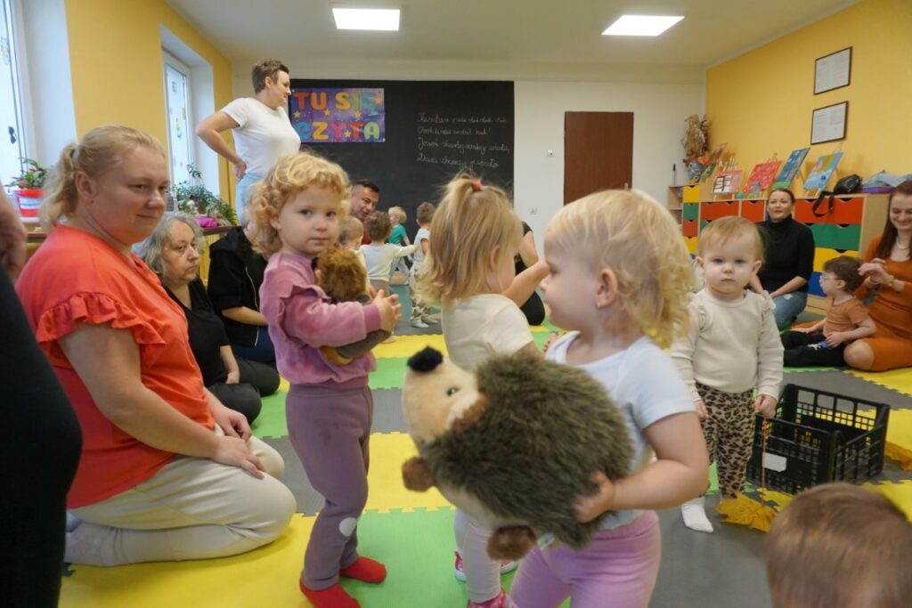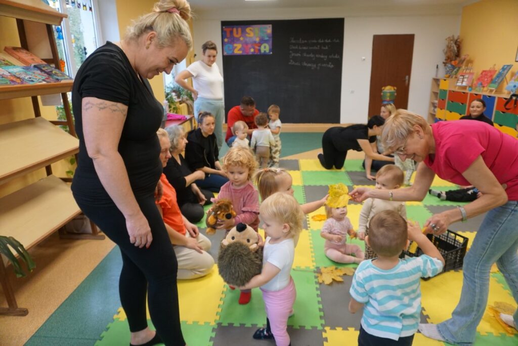 Dzieci w rączki brały i wesoło grały. Bam, bam o podłogę, bam, bam przed sobą, bam, bam nad głową… Gdy się znudziły, do wora je wrzuciły.Z sigumą, kółeczko graniaste zrobiły. Potem chustą się bawiły. Piłeczki na chustę wrzucały. Troszkę je odbijały. W piłeczkach brodziły. Karuzelą zakręciły i dość miały. Niektóre się rozbeczały. Miski dostały. Piłeczki zbierały. Niespodzianka w skrzynce się skryła. Gdy spadła liściasta pokrywa… to się ujawniła jeżowa rodzina. Jeże w lesie i ogrodach mieszkają. Ostre kolce mają. Maluszki je oglądały. Z rąk do rąk podawały. Piosenkę o jeżach śpiewały. Wyliczankę powtarzały: Po lesie, po lesie spacerują jeże…Motorykę dużą rozwijały, gdy przeszkody pokonywały. Rysunki kolorowały. Książeczki oglądały.