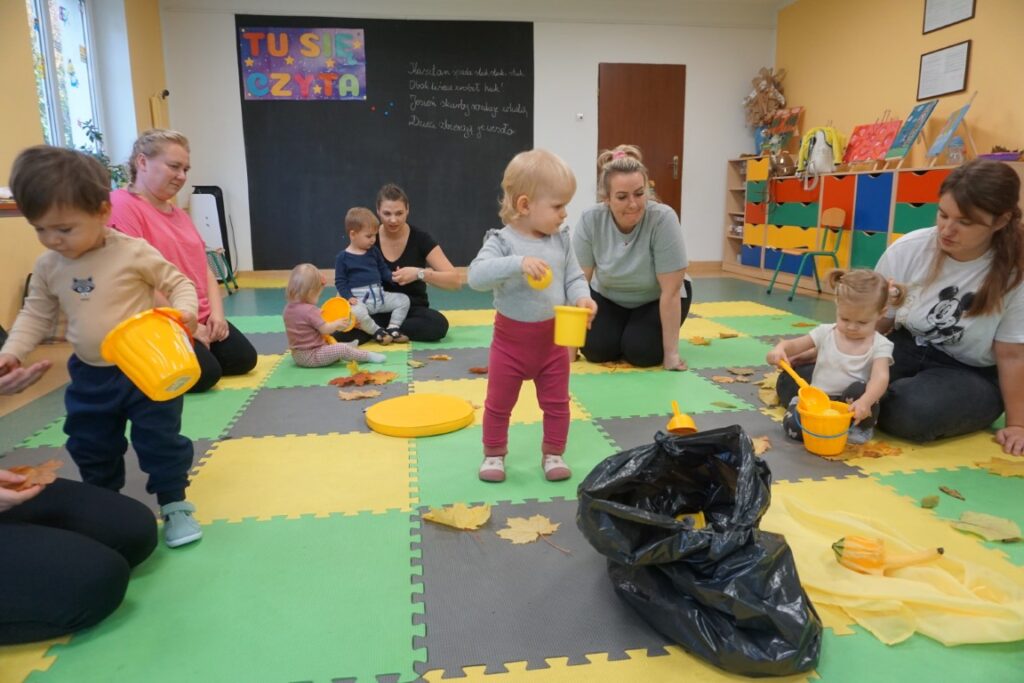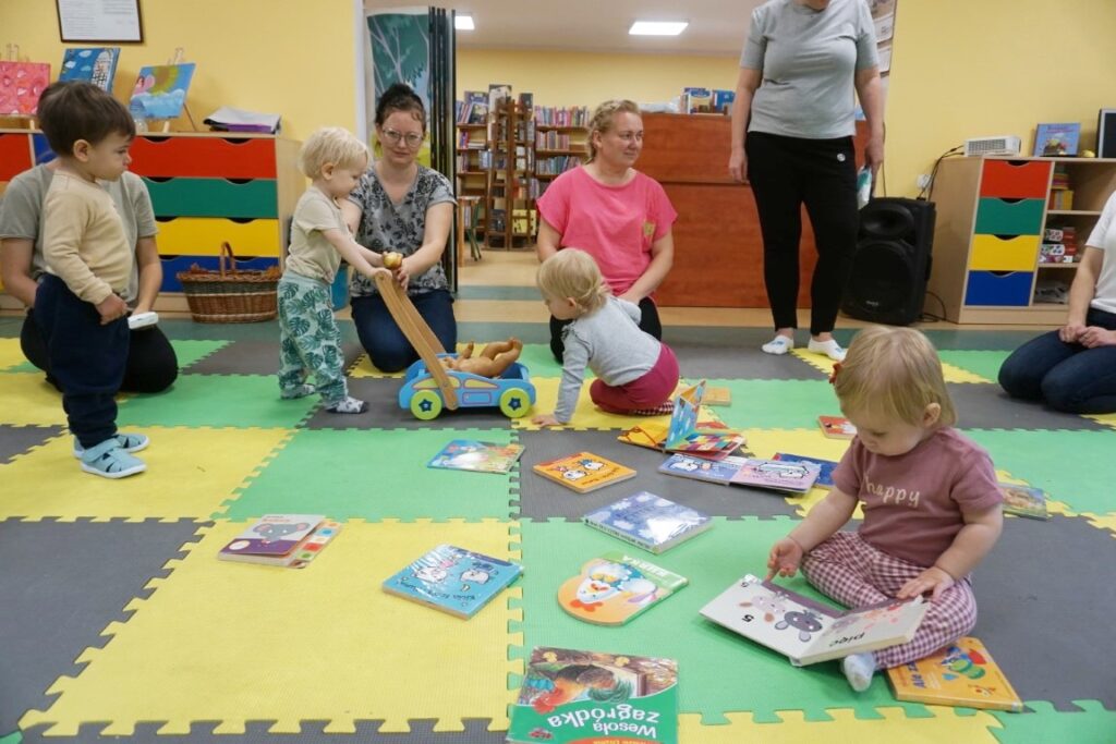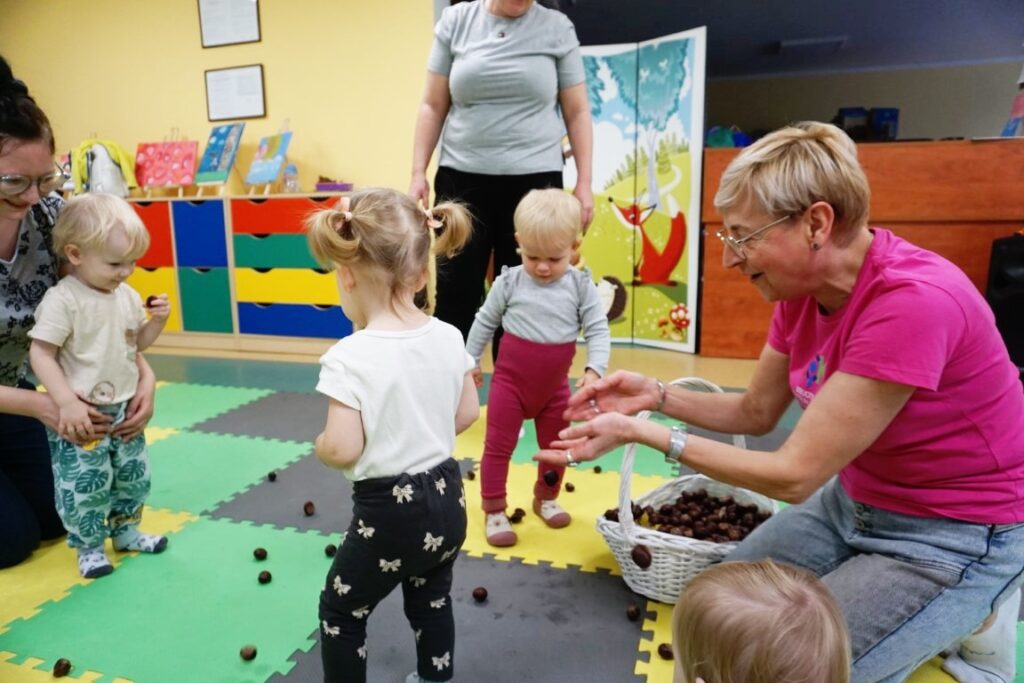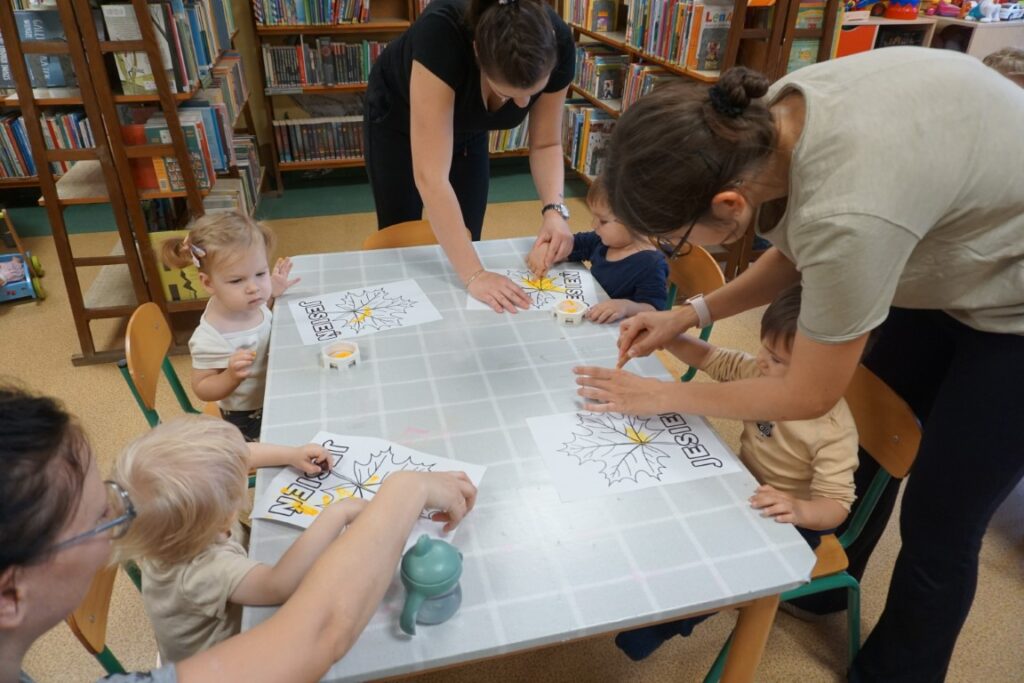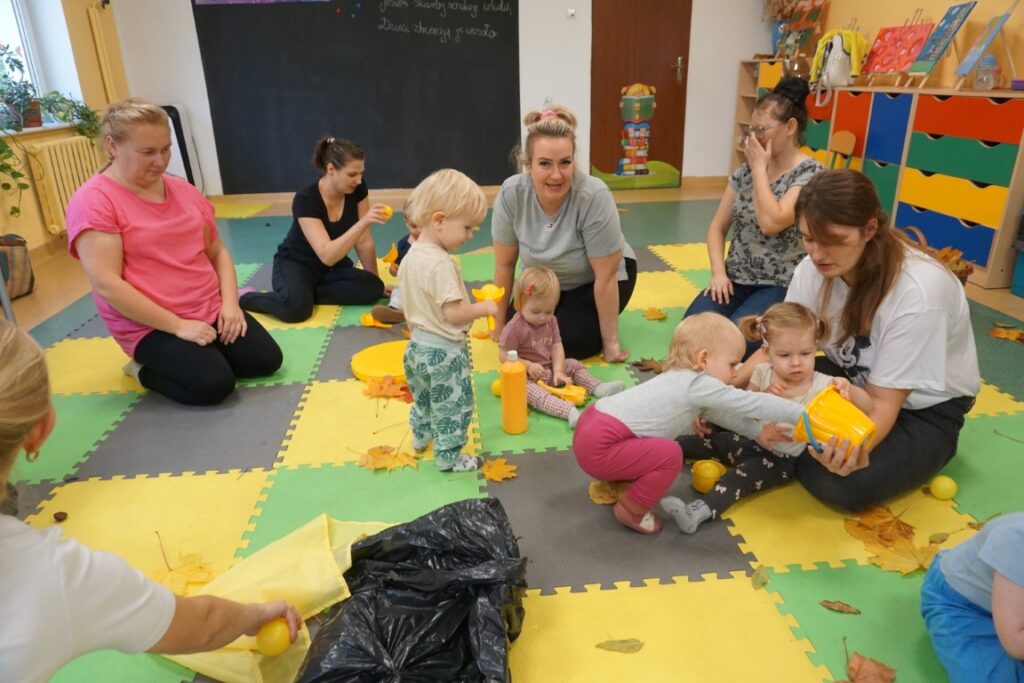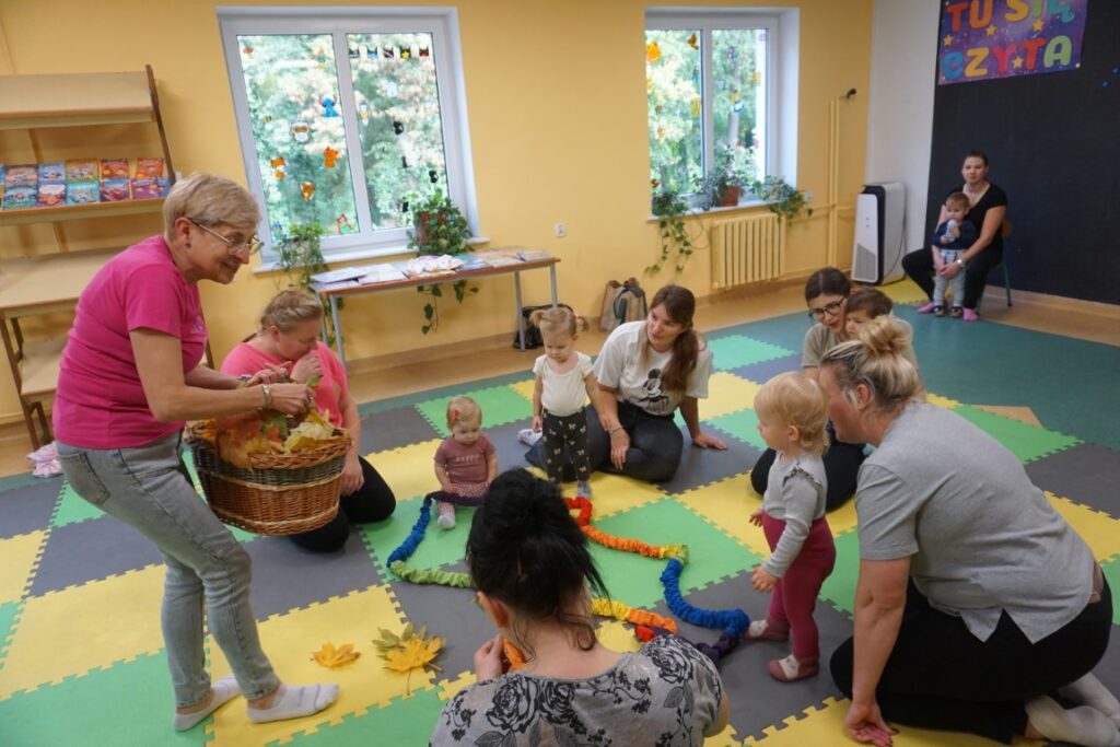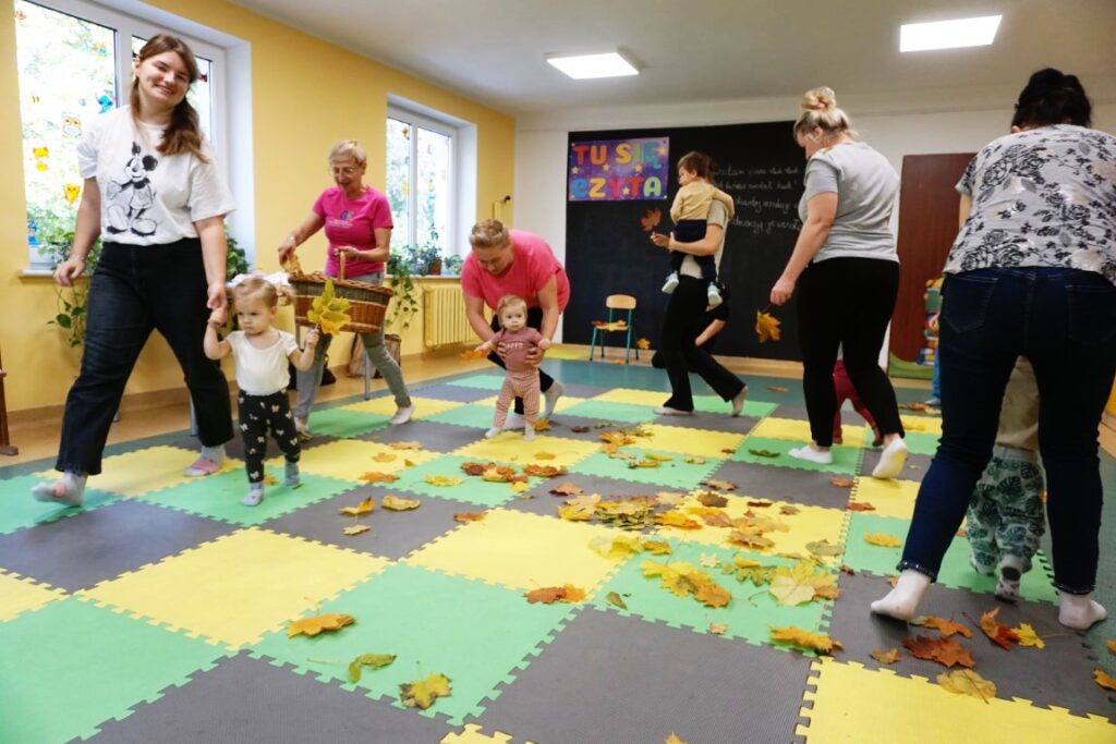Dnia 22.10.25 do Biblioteki przyszły maluszki z mamusiami, by wziąć udział w jesiennych zajęciach integracyjnych, promujących książkę. Najpierw powitanie: klaskanie, tupanie, jak koniki kłusowanie, części ciała rozpoznawanie. Potem zabawy w kółeczku z sigumą i bęc na dywanie zrobiły!