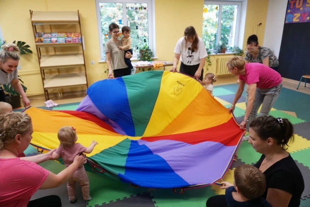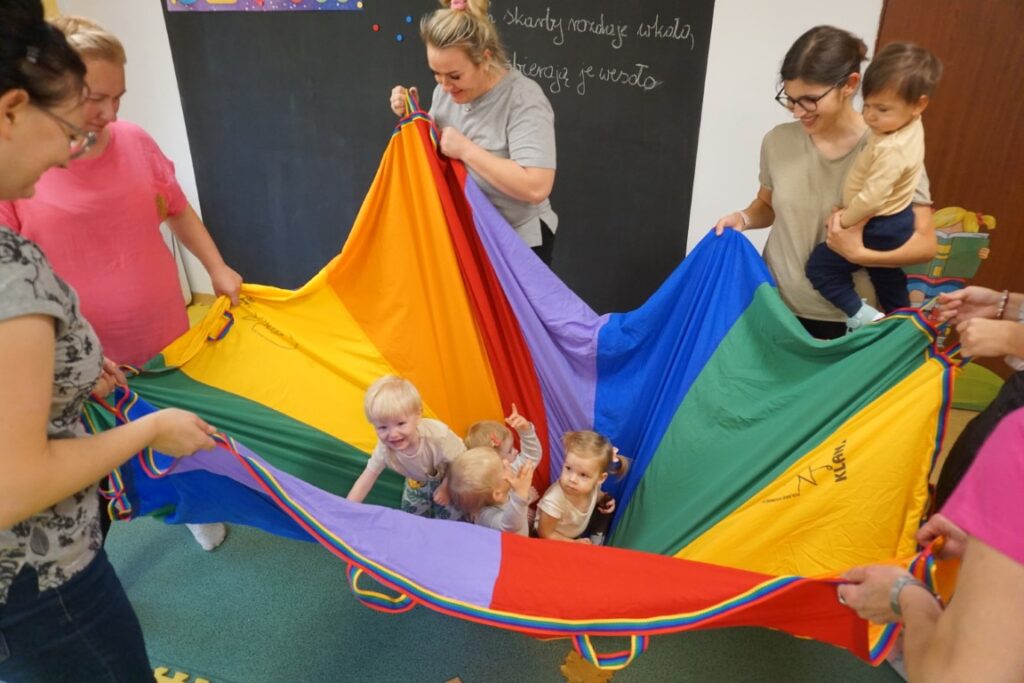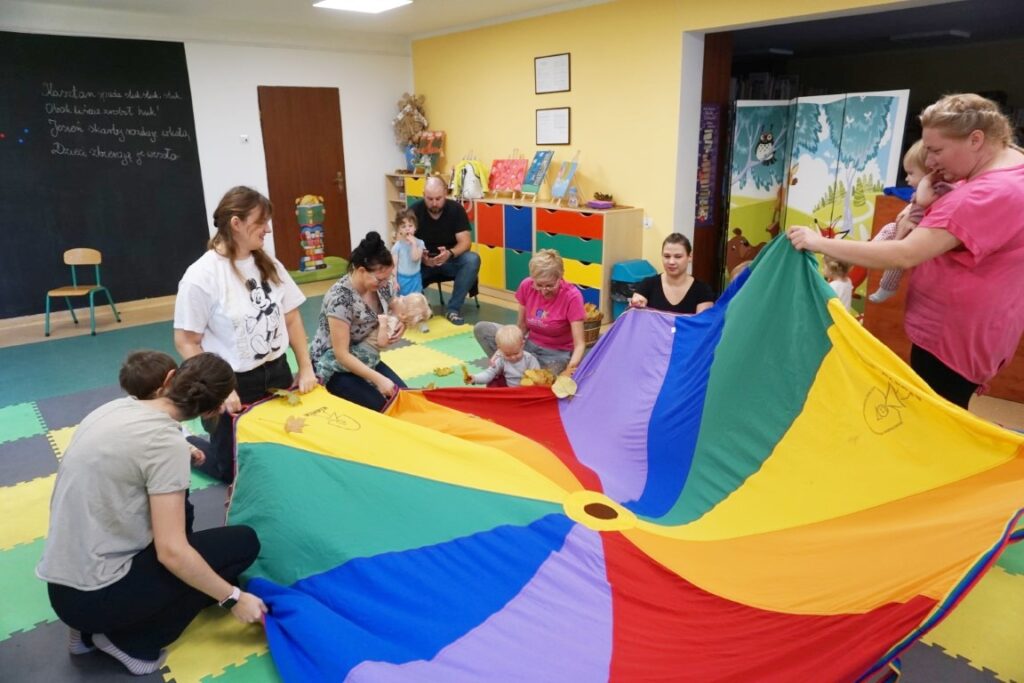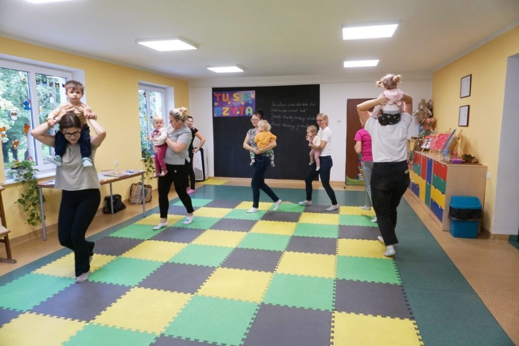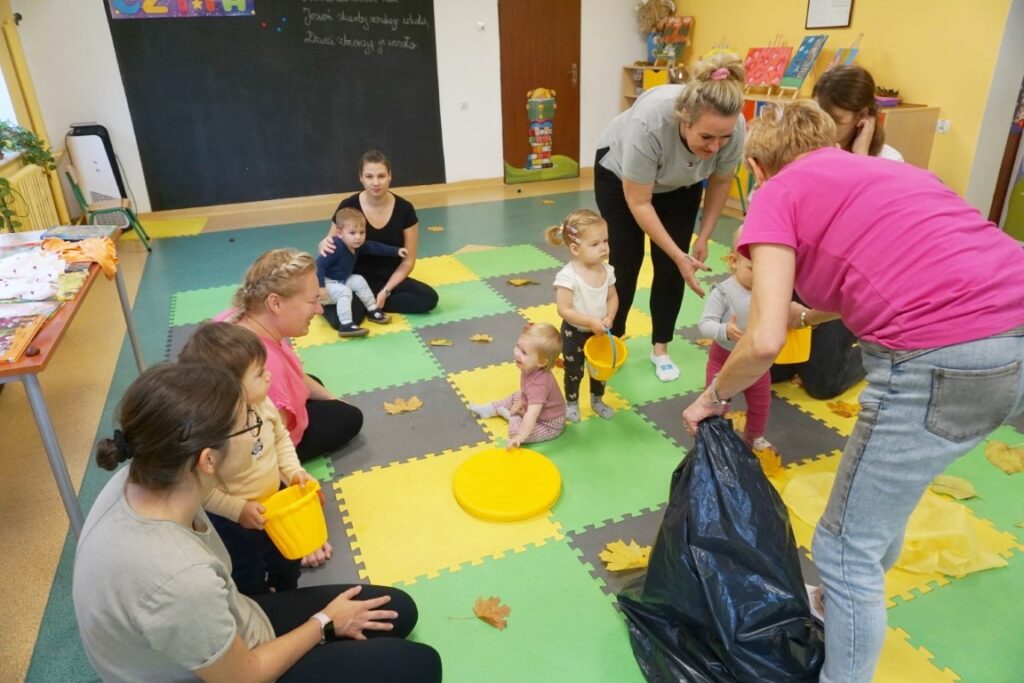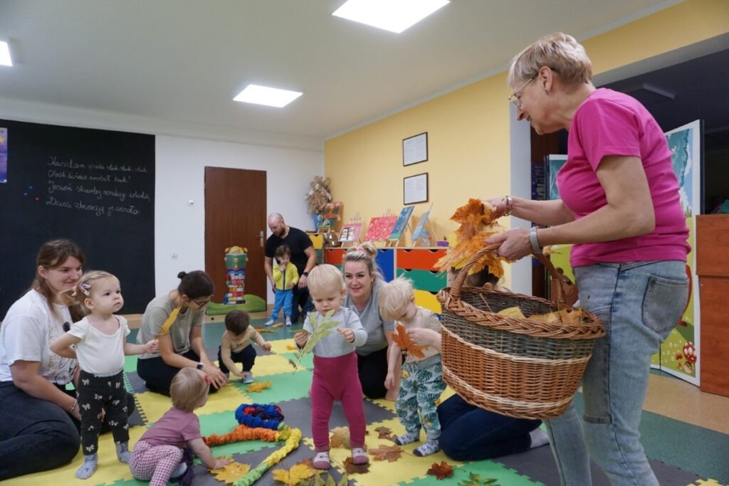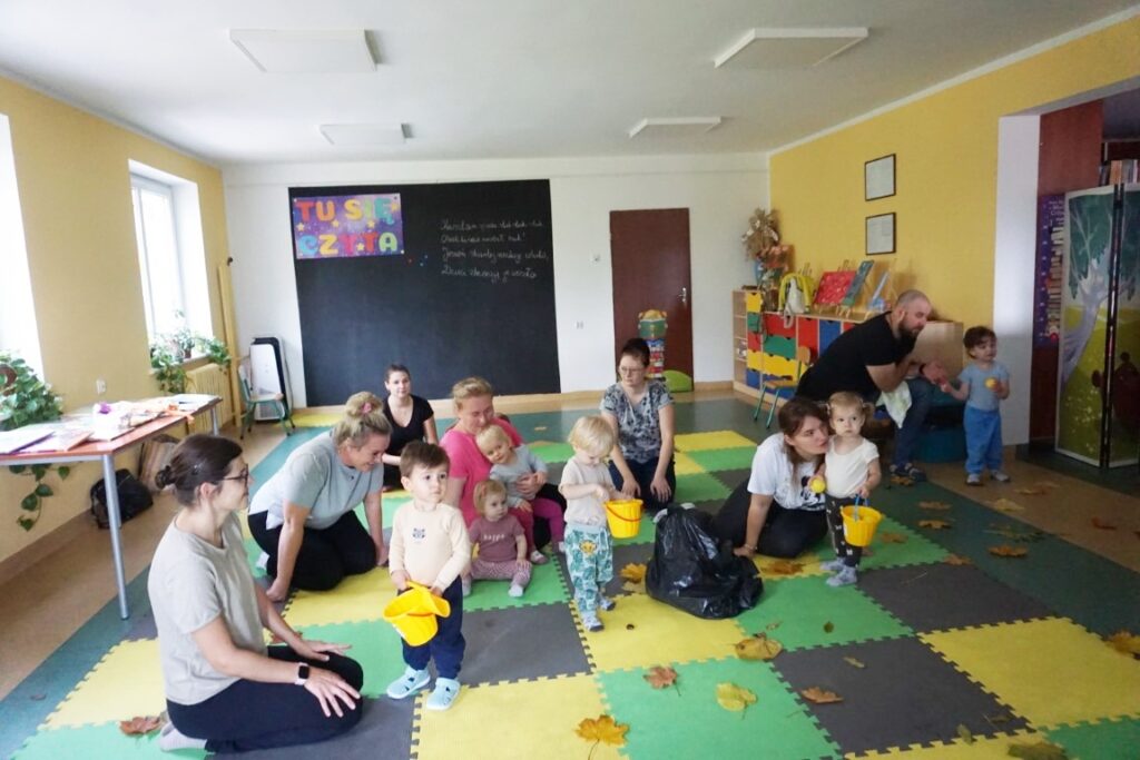 Dnia 22.10.25 do Biblioteki przyszły maluszki z mamusiami, by wziąć udział w jesiennych zajęciach integracyjnych, promujących książkę. Najpierw powitanie: klaskanie, tupanie, jak koniki kłusowanie, części ciała rozpoznawanie. Potem zabawy w kółeczku z sigumą i bęc na dywanie zrobiły!