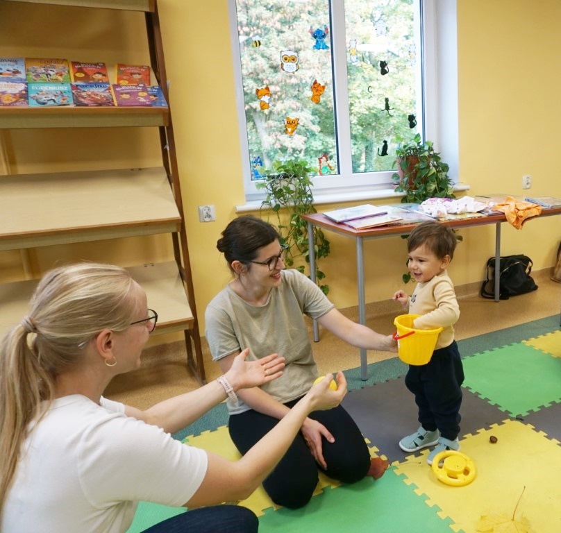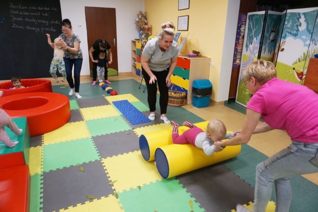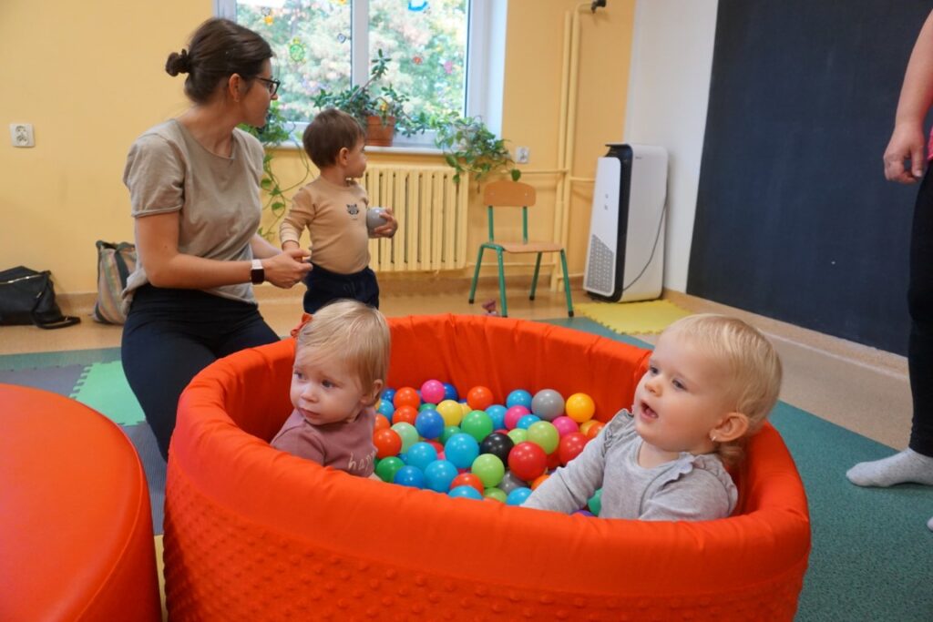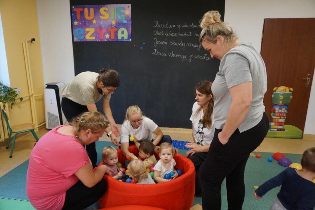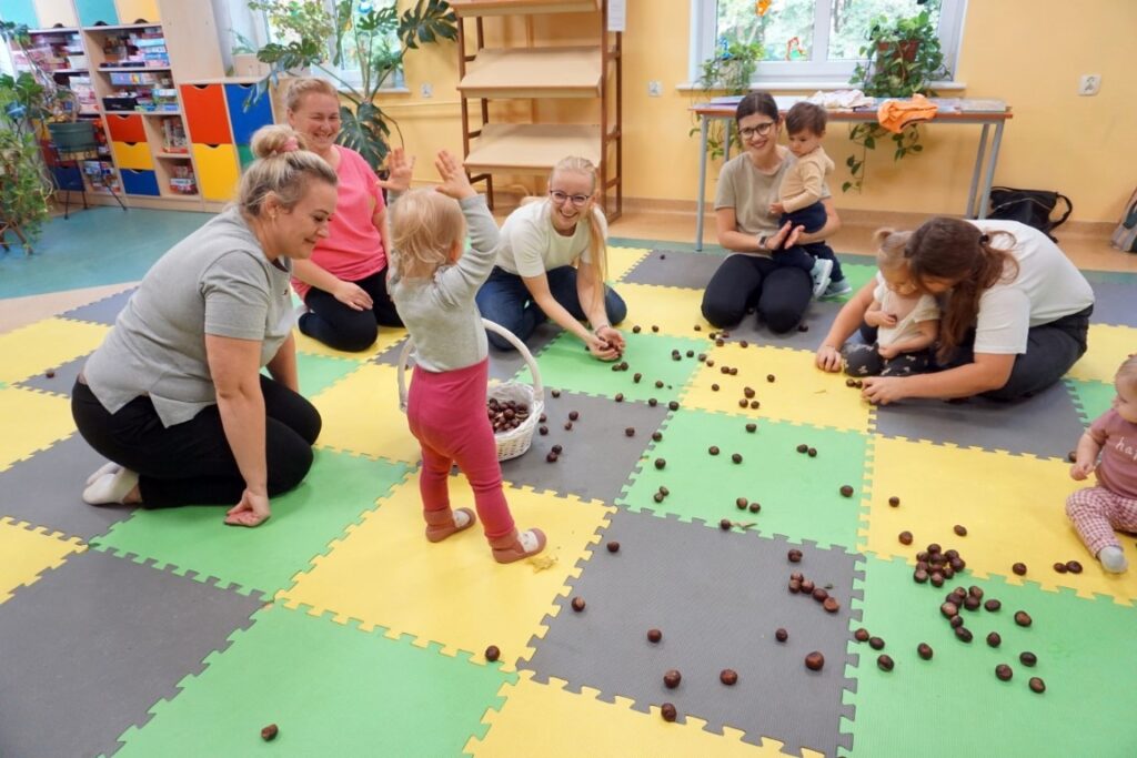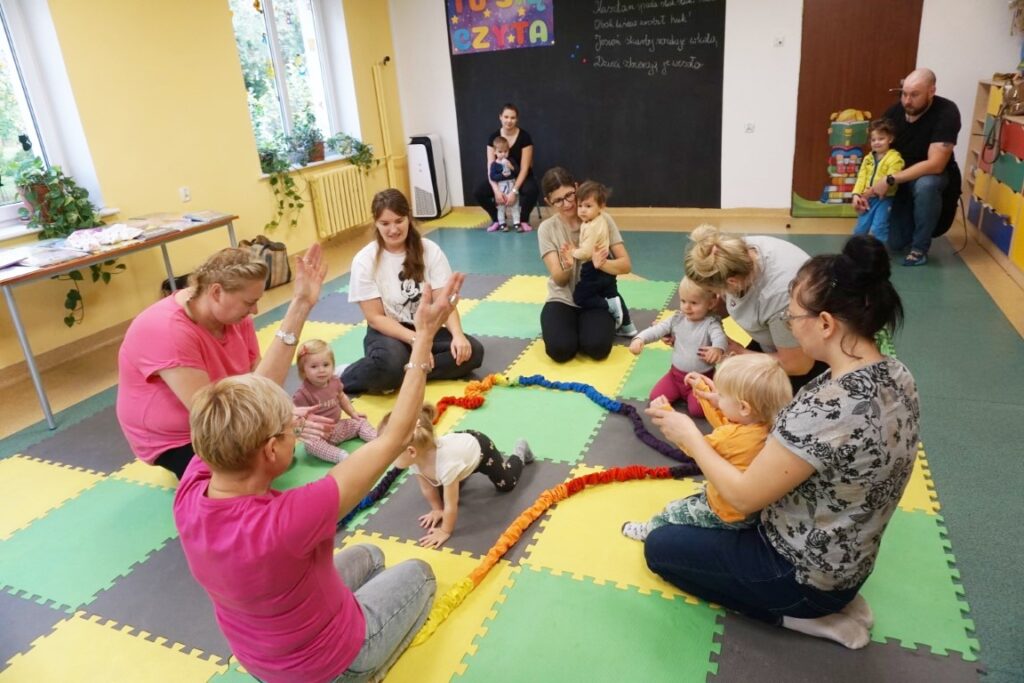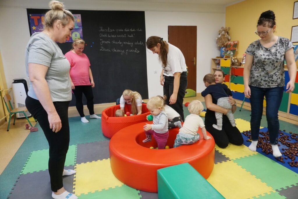 Dnia 22.10.25 do Biblioteki przyszły maluszki z mamusiami, by wziąć udział w jesiennych zajęciach integracyjnych, promujących książkę. Najpierw powitanie: klaskanie, tupanie, jak koniki kłusowanie, części ciała rozpoznawanie. Potem zabawy w kółeczku z sigumą i bęc na dywanie zrobiły!