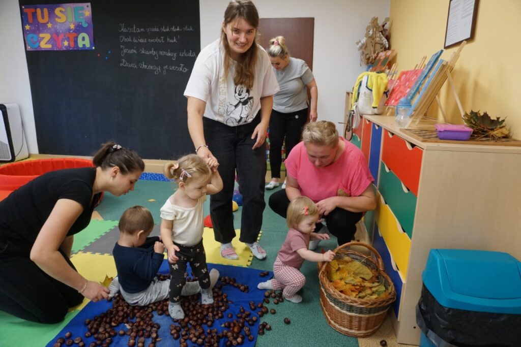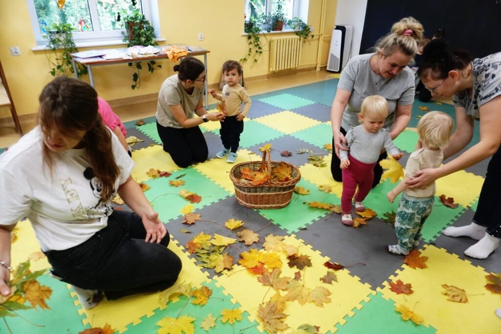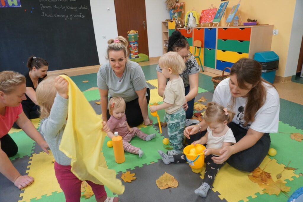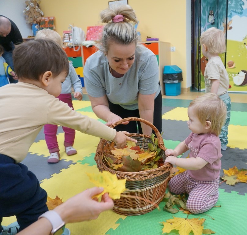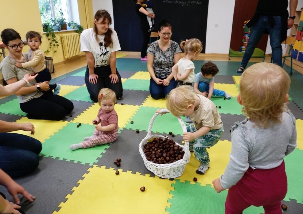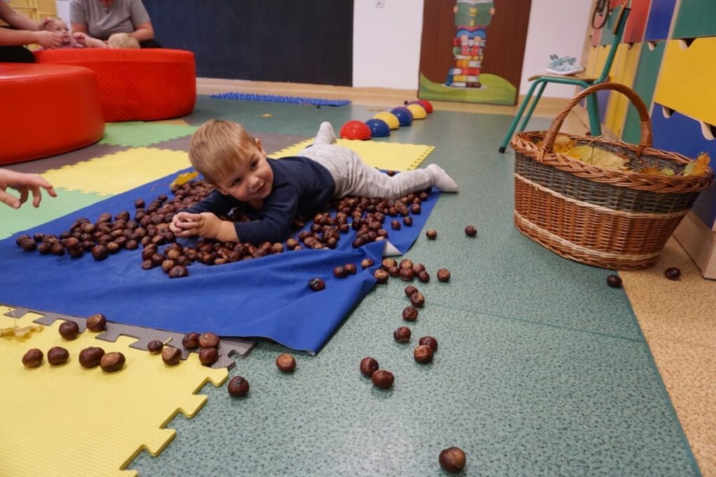 Jesień koszyk zostawiła, dzieci do zabawy zaprosiła. W koszu były liście kolorowe. Wirowały, opadały, na głowy spadały. Dzieci je zbierały do kosza wkładały. Liście na chuście podskakiwały, po sali fruwały. Przyszła kolej na kasztany. Było stuk, obok liścia huk. Tak zrobiły i się rozproszyły. Po chwili do koszyczka trafiły. Malcy worek zobaczyły i się ucieszyły, bo w nim niespodzianka się skryła, która je rozweseliła. Do worka zajrzały i różne, żółte przedmioty z niego wyciągały. Bawiły się i oglądały. Tak kolor żółty utrwalały. Gdy się znudziły, wszystko do worka wrzuciły. Przeszkody pokonywały, sprawności zyskiwały: przez oponę przechodziły. W kulkach odpoczynek zrobiły. Po kasztanach chodziły i w nich swawoliły. Nawet na walcach się turlać chciały i się walcowały. Na dużym ekranie, książeczkę o Kici-Koci i Nunusiu oglądały. Na pytania odpowiadały. Paluszkami listki malowały. Farbą się umazały, ale przecież jest woda i niewielka to szkoda! Książeczki na dzieci czekały i to był koniec zabawy!