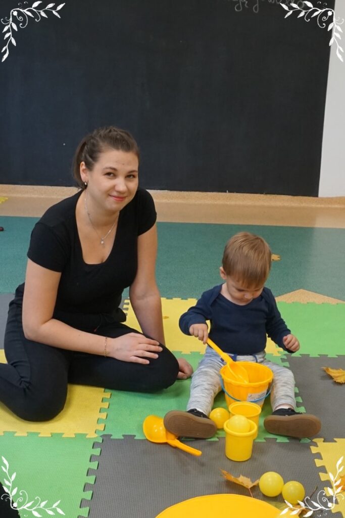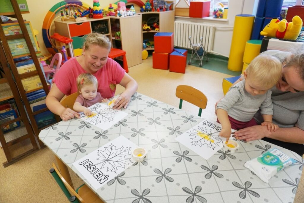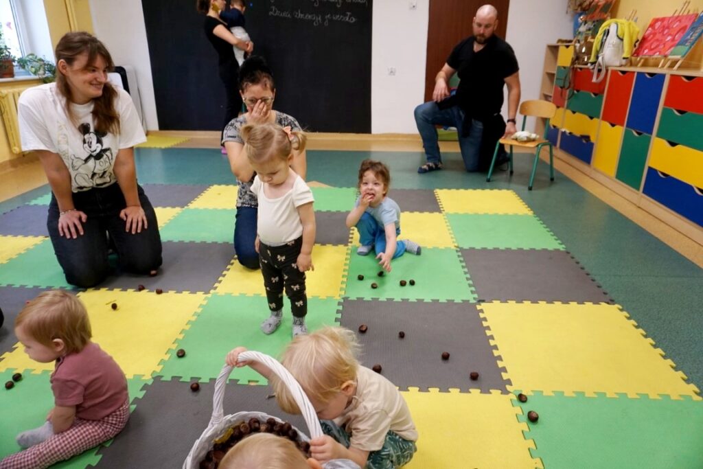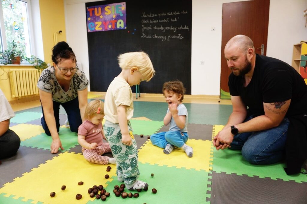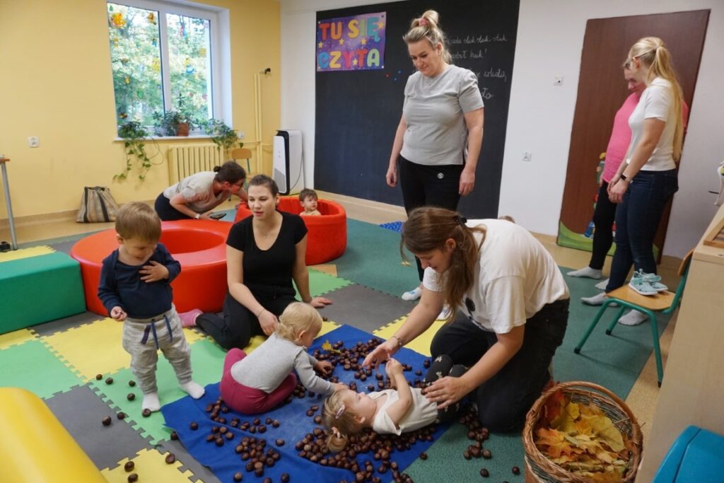 Jesień koszyk zostawiła, dzieci do zabawy zaprosiła. W koszu były liście kolorowe. Wirowały, opadały, na głowy spadały. Dzieci je zbierały do kosza wkładały. Liście na chuście podskakiwały, po sali fruwały. Przyszła kolej na kasztany. Było stuk, obok liścia huk. Tak zrobiły i się rozproszyły. Po chwili do koszyczka trafiły. Malcy worek zobaczyły i się ucieszyły, bo w nim niespodzianka się skryła, która je rozweseliła. Do worka zajrzały i różne, żółte przedmioty z niego wyciągały. Bawiły się i oglądały. Tak kolor żółty utrwalały. Gdy się znudziły, wszystko do worka wrzuciły. Przeszkody pokonywały, sprawności zyskiwały: przez oponę przechodziły. W kulkach odpoczynek zrobiły. Po kasztanach chodziły i w nich swawoliły. Nawet na walcach się turlać chciały i się walcowały. Na dużym ekranie, książeczkę o Kici-Koci i Nunusiu oglądały. Na pytania odpowiadały. Paluszkami listki malowały. Farbą się umazały, ale przecież jest woda i niewielka to szkoda! Książeczki na dzieci czekały i to był koniec zabawy!
