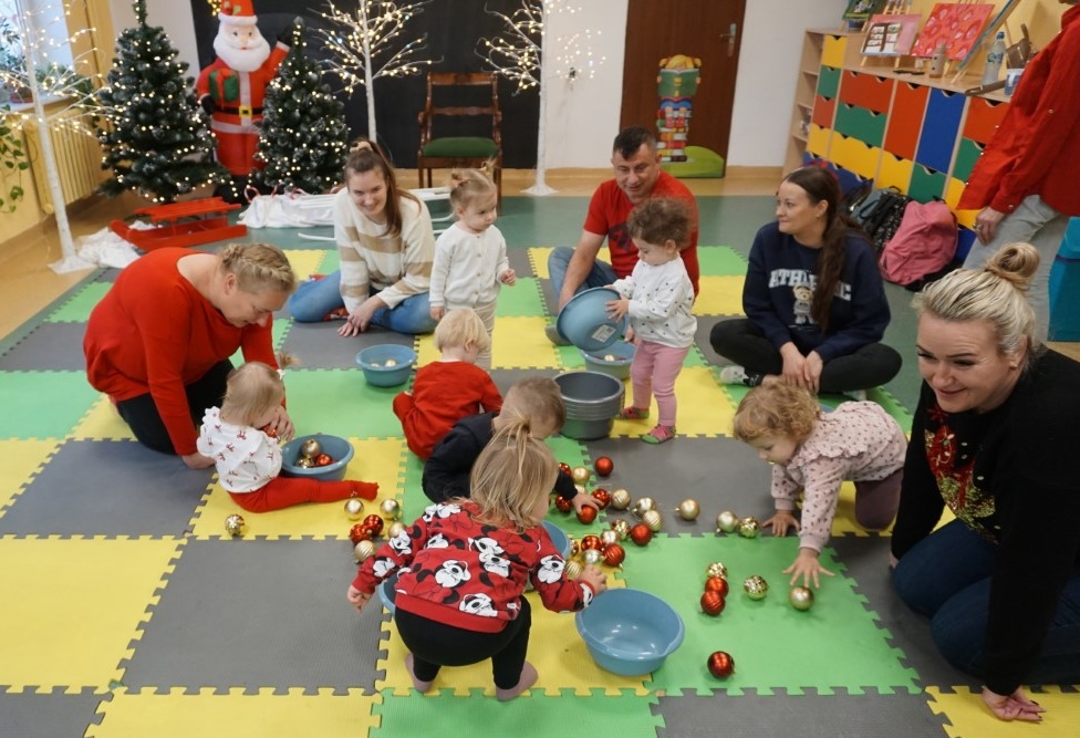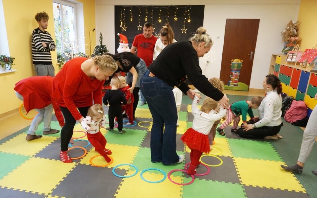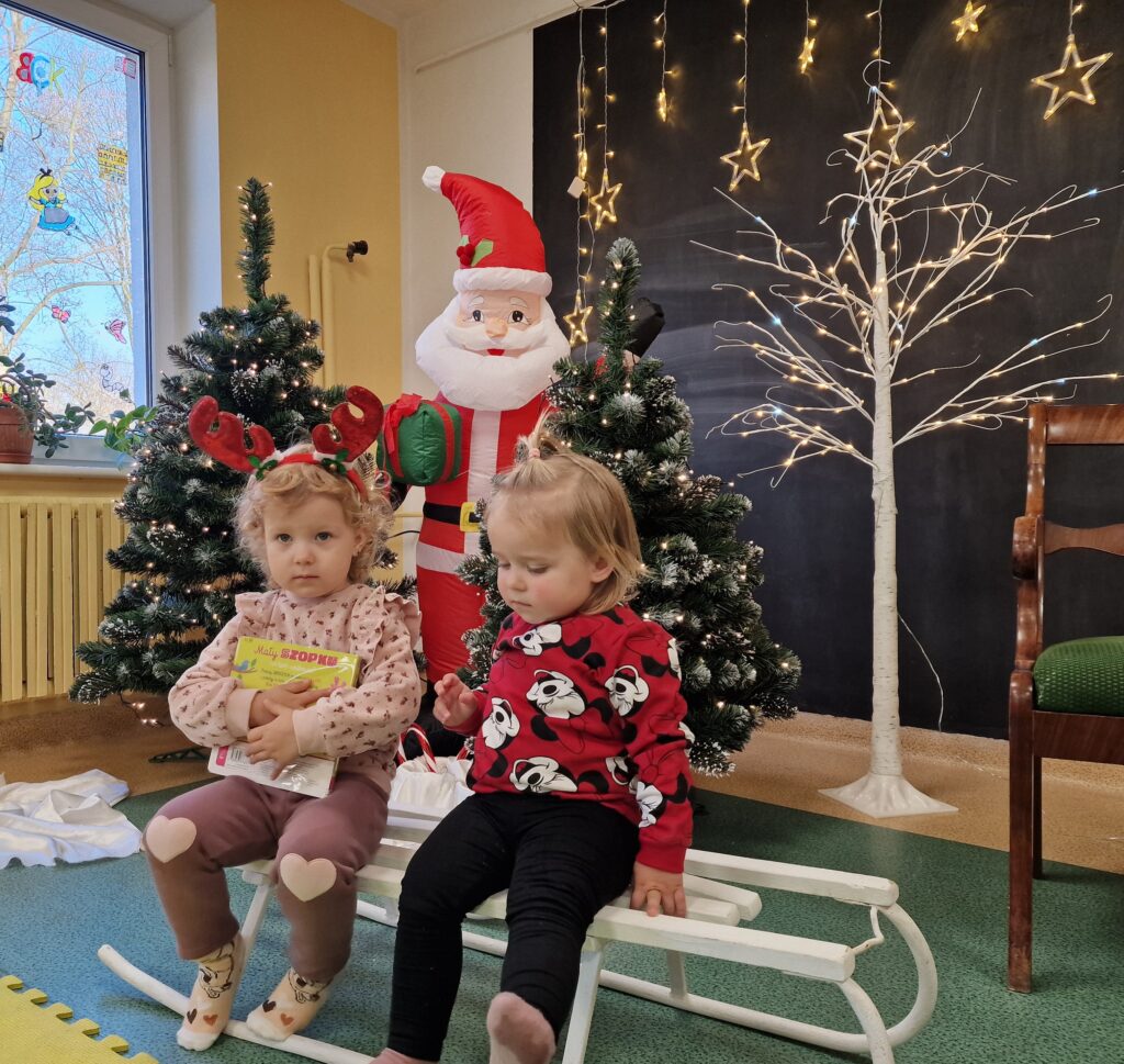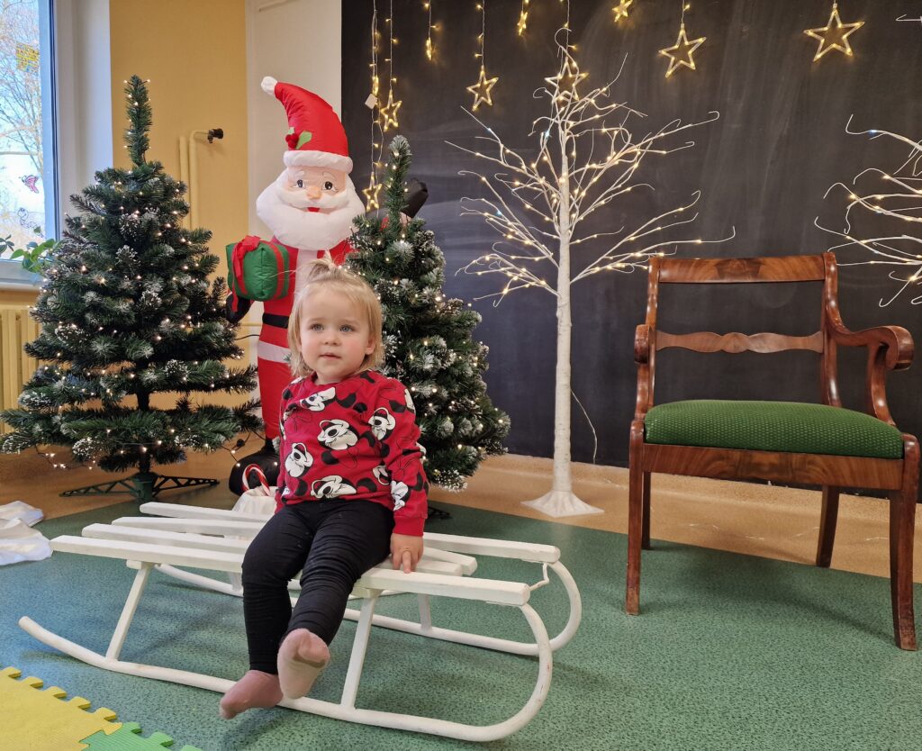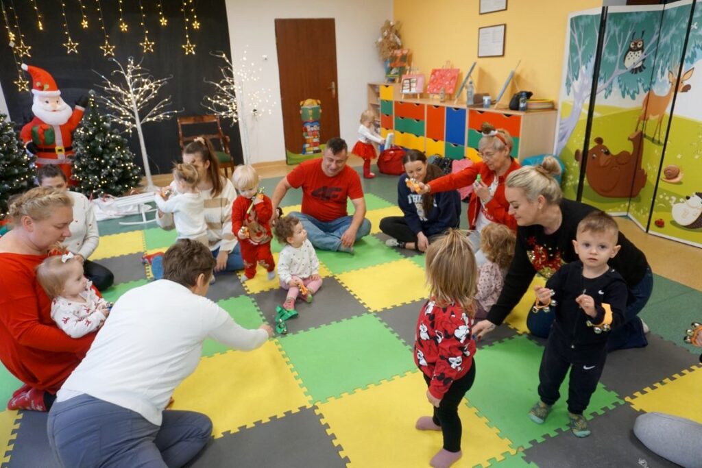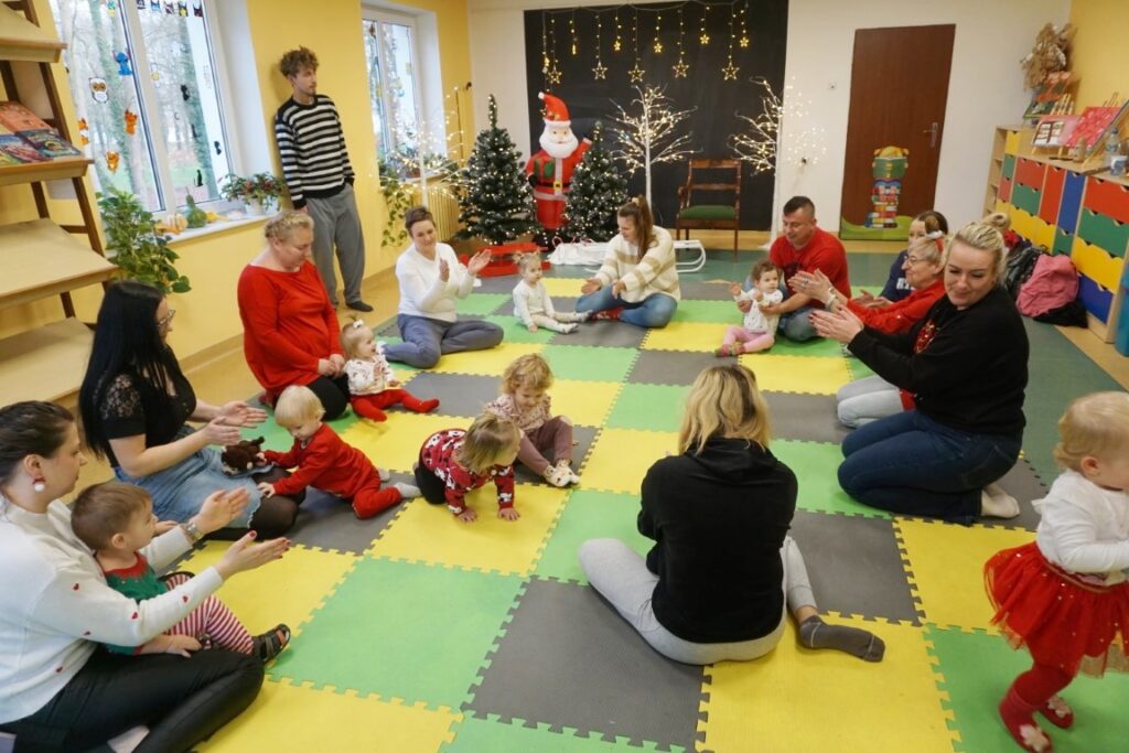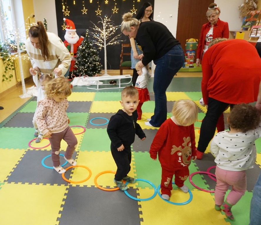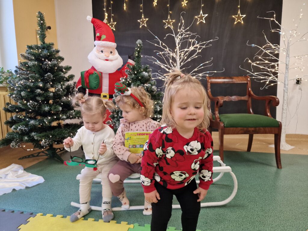 W rączki je chwytały i brum, brum wołały. Jak samochód, po sali jeździły. Kółeczka na podłodze położyły. Najpierw po nich chodziły, po chwili skakały i uciechę z tego miały. Wtem dzwonek usłyszały. Od razu znieruchomiały. I przyszedł gość niespodzianie na to wyjątkowe spotkanie. Miał strój czerwony, brodę i okulary. W fotelu się rozsiadł i zadał pytanie: czy dzieci grzeczne były? W odpowiedzi usłyszał popłakiwanie. O nic więcej nie pytał. Sprawnie rozpoczął działanie. Maluchy z mamusiami wywoływał, które na sankach przysiadały i prezenty odbierały. Szybko się oddalały. Z Mikołajem się pożegnały. Książeczki sobie wybrały. Zmęczone były i o odpoczynku, w domowych pieleszach marzyły.