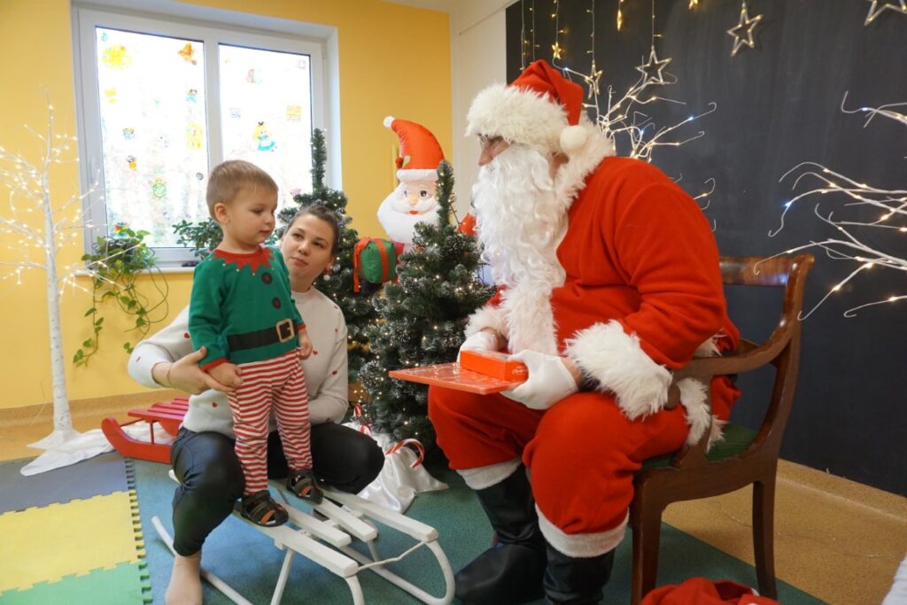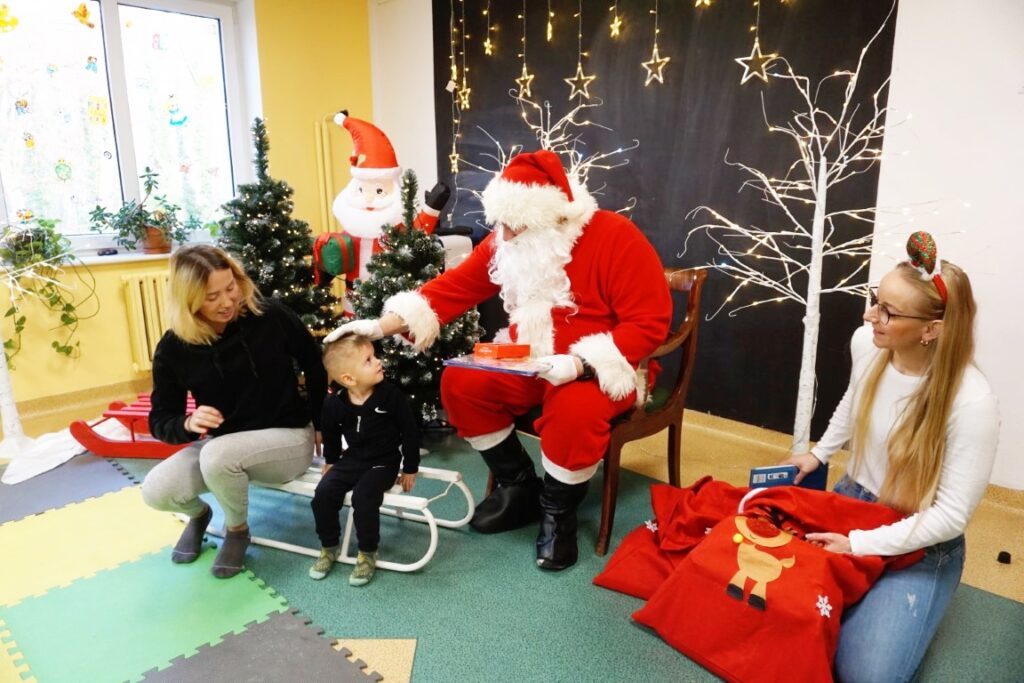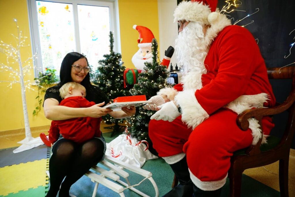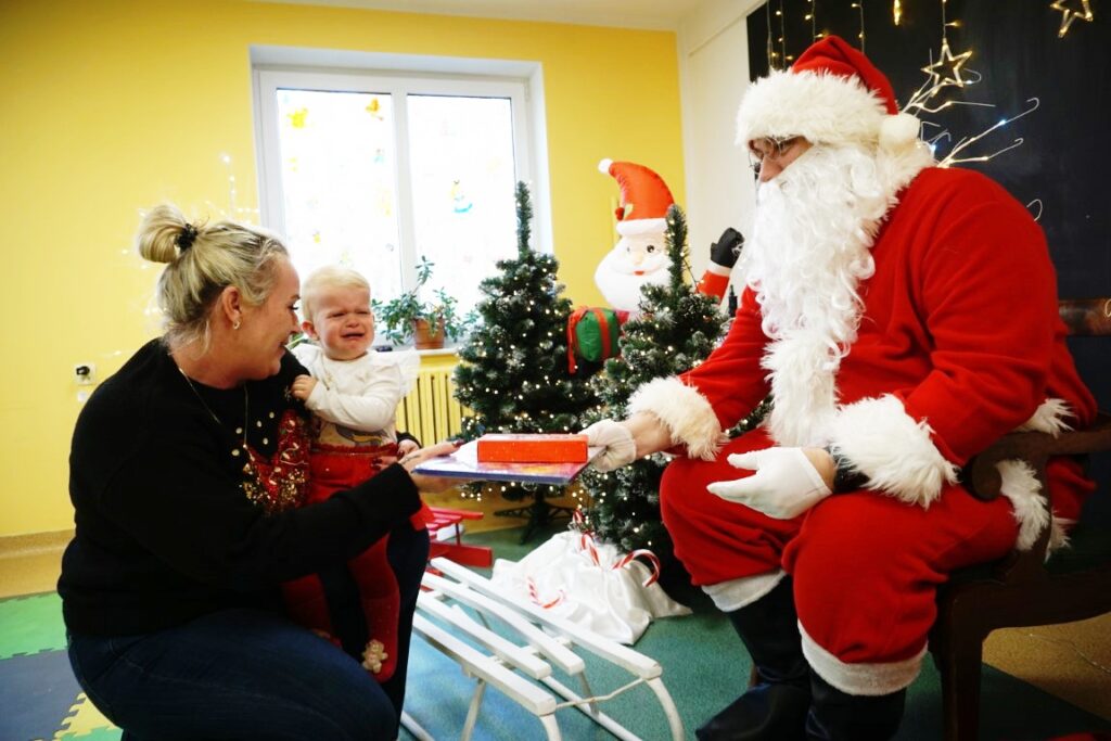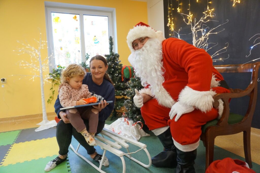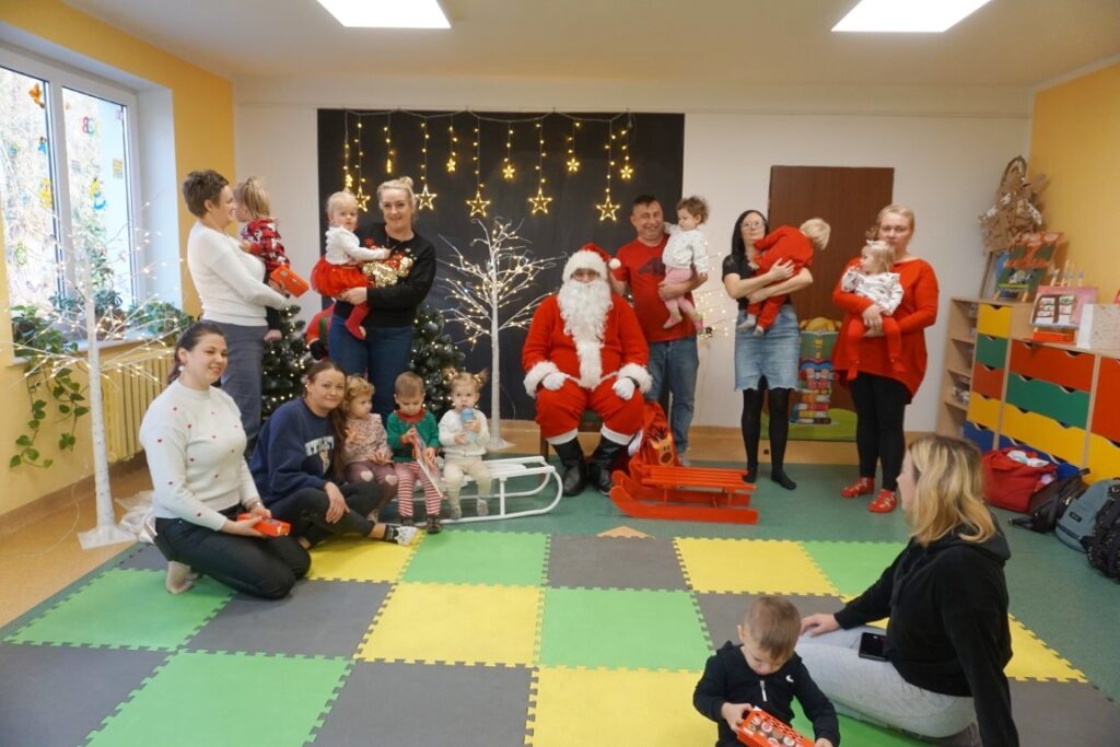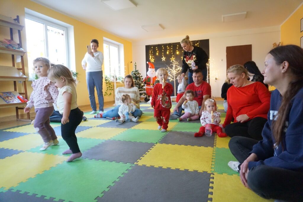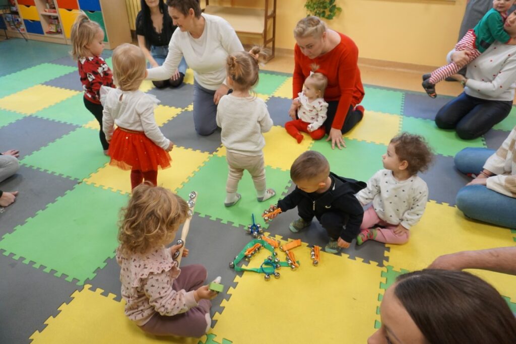 W rączki je chwytały i brum, brum wołały. Jak samochód, po sali jeździły. Kółeczka na podłodze położyły. Najpierw po nich chodziły, po chwili skakały i uciechę z tego miały. Wtem dzwonek usłyszały. Od razu znieruchomiały. I przyszedł gość niespodzianie na to wyjątkowe spotkanie. Miał strój czerwony, brodę i okulary. W fotelu się rozsiadł i zadał pytanie: czy dzieci grzeczne były? W odpowiedzi usłyszał popłakiwanie. O nic więcej nie pytał. Sprawnie rozpoczął działanie. Maluchy z mamusiami wywoływał, które na sankach przysiadały i prezenty odbierały. Szybko się oddalały. Z Mikołajem się pożegnały. Książeczki sobie wybrały. Zmęczone były i o odpoczynku, w domowych pieleszach marzyły.