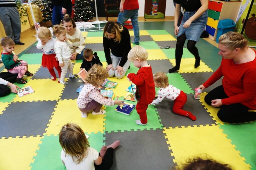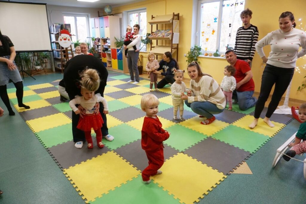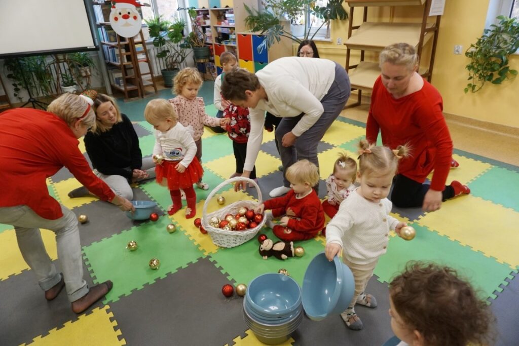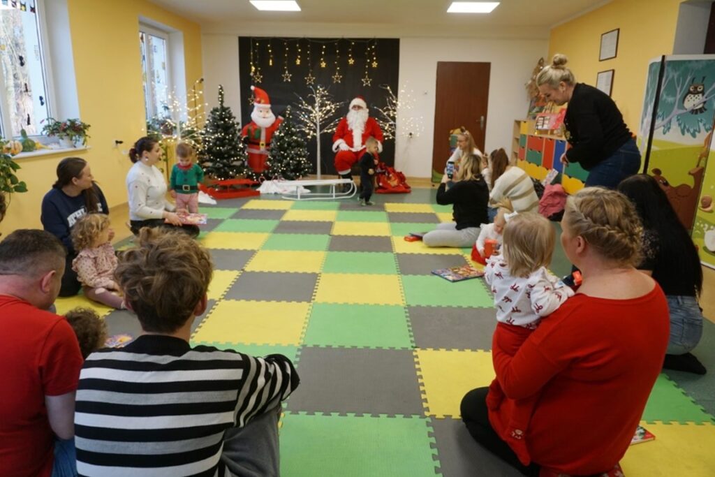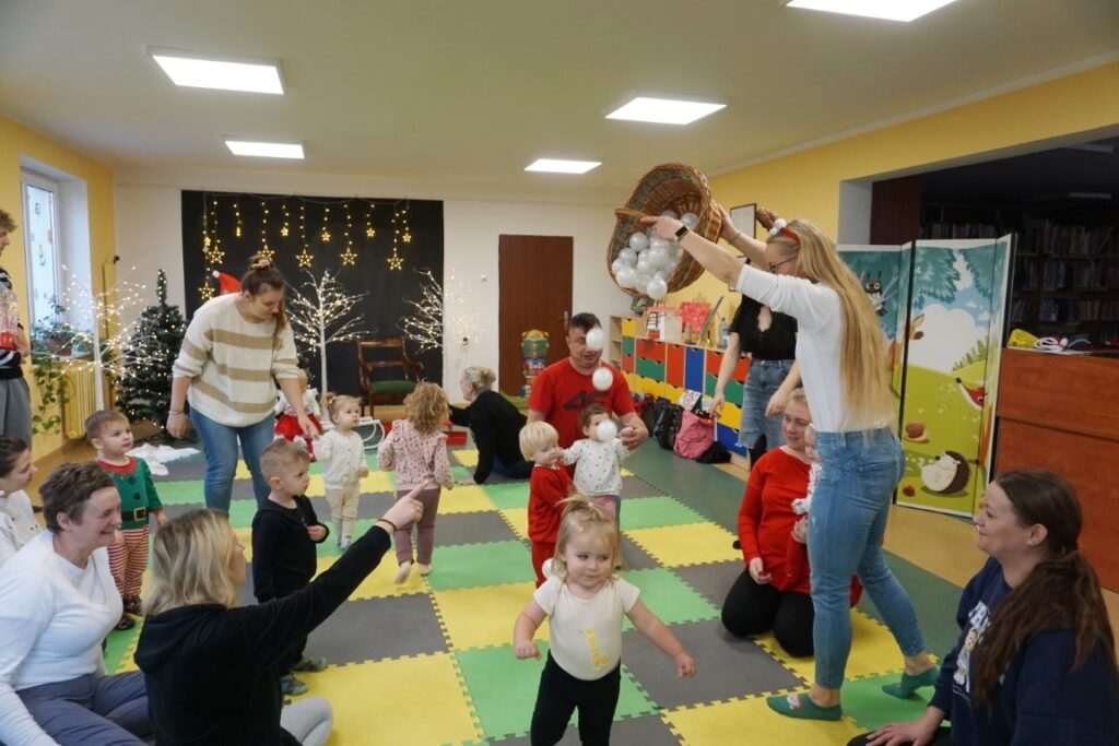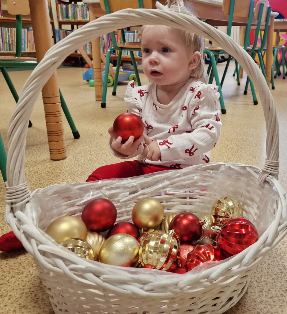 Dnia 3.12.25 Mikołaj odwiedził najmłodszych czytelników. Obaw było co niemiara, jak maluszki zareagują na Świętego Mikołaja. Wszystkie przyszły odświętnie ubrane i przez rodziców przygotowane. Zajęcia rozpoczęły się zabawami integracyjnymi w kole. W koszyczku bombki leżały. Brały je w ręce. Rozrzucały. Potem do misek zbierały. Były też wyliczanki- rytmiczanki i zabawa dzwoneczkami. Dzieci dzyń, dzyń…grały a po chwili, w ciszę się wsłuchiwały. Kilka razy zabawę powtarzały. Kółeczka dostały.