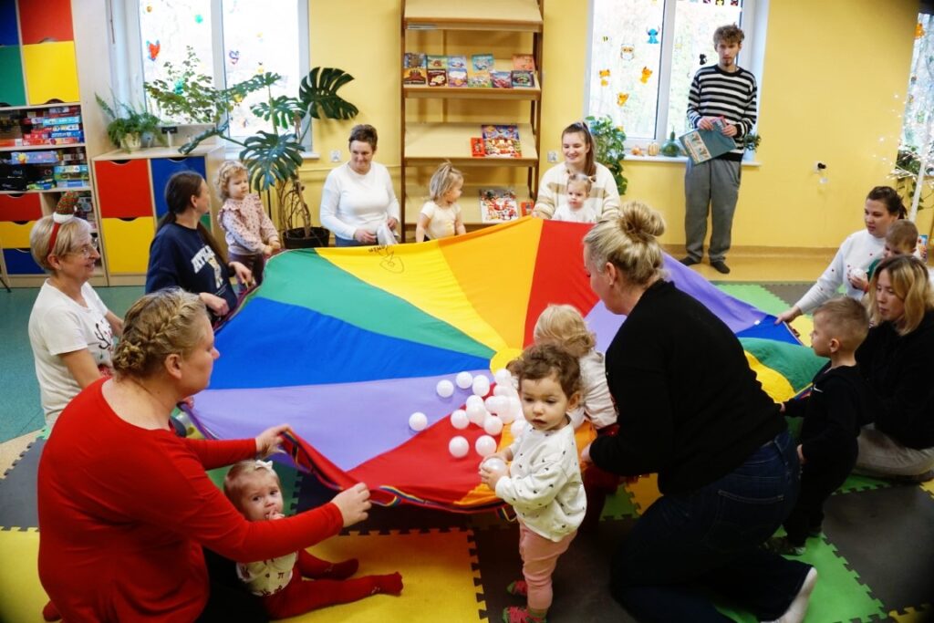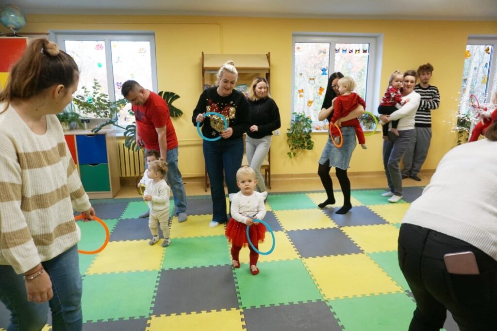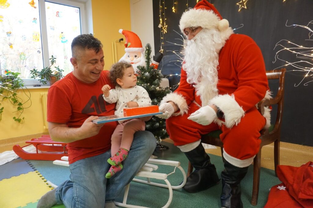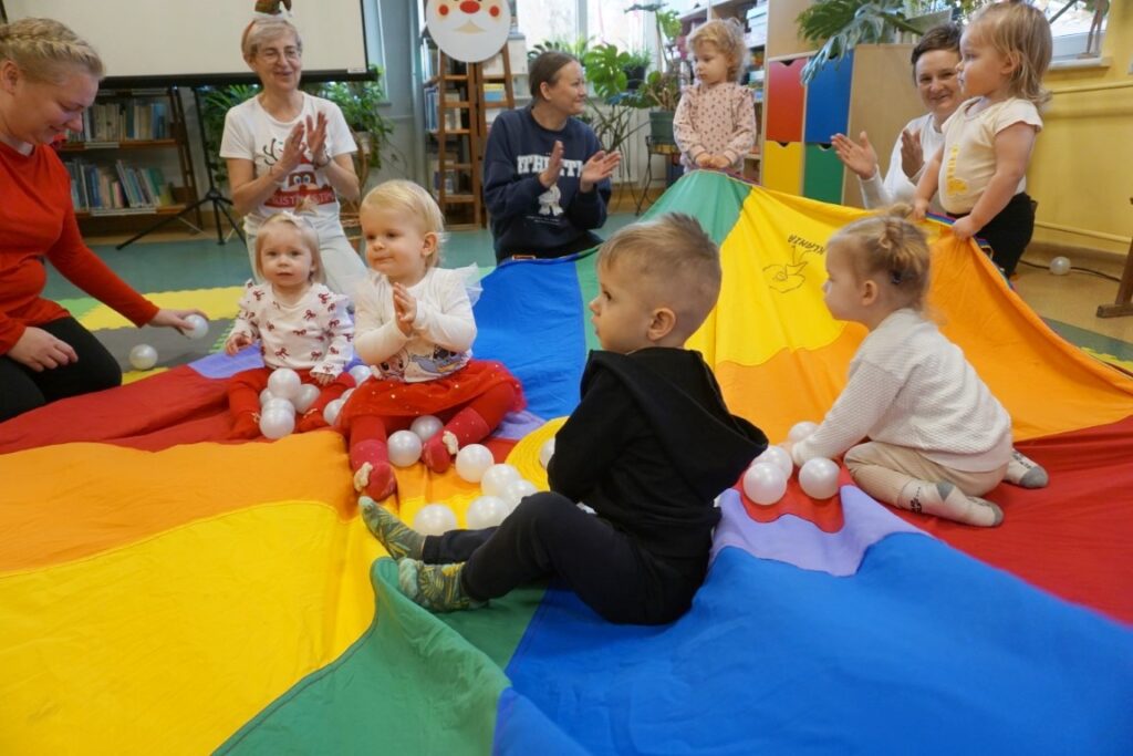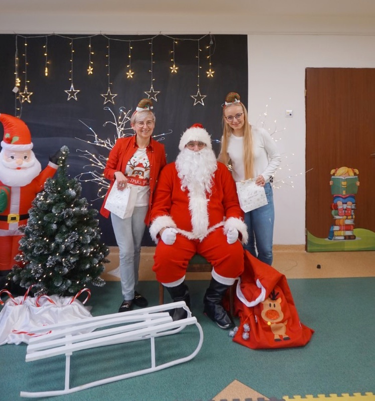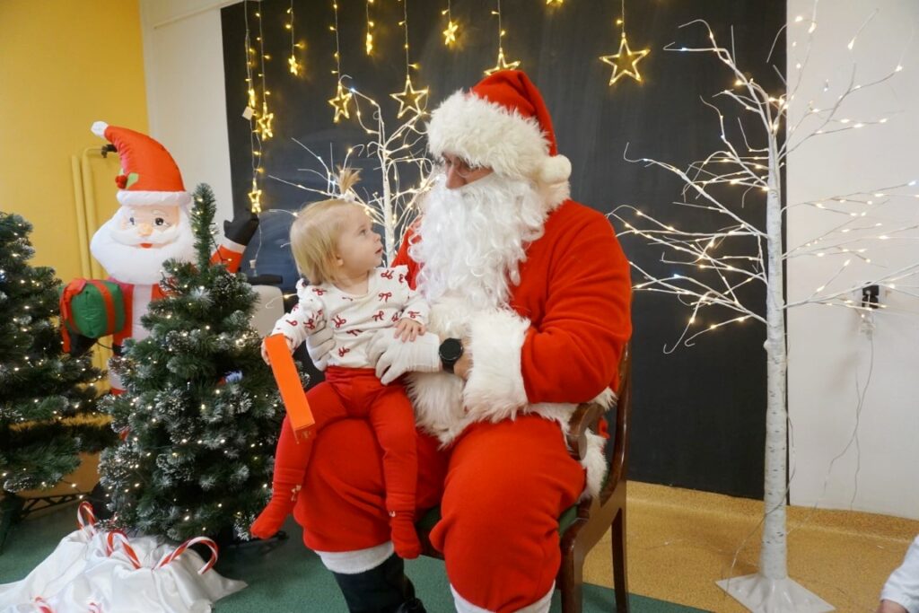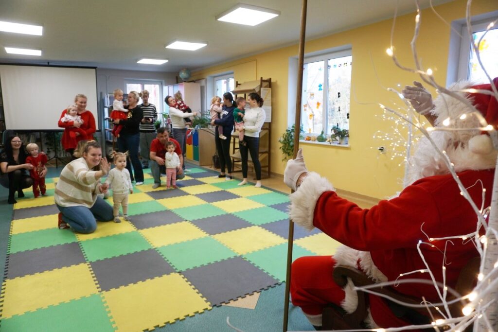Dnia 3.12.25 Mikołaj odwiedził najmłodszych czytelników. Obaw było co niemiara, jak maluszki zareagują na Świętego Mikołaja. Wszystkie przyszły odświętnie ubrane i przez rodziców przygotowane. Zajęcia rozpoczęły się zabawami integracyjnymi w kole. W koszyczku bombki leżały. Brały je w ręce. Rozrzucały. Potem do misek zbierały. Były też wyliczanki- rytmiczanki i zabawa dzwoneczkami. Dzieci dzyń, dzyń…grały a po chwili, w ciszę się wsłuchiwały. Kilka razy zabawę powtarzały. Kółeczka dostały.