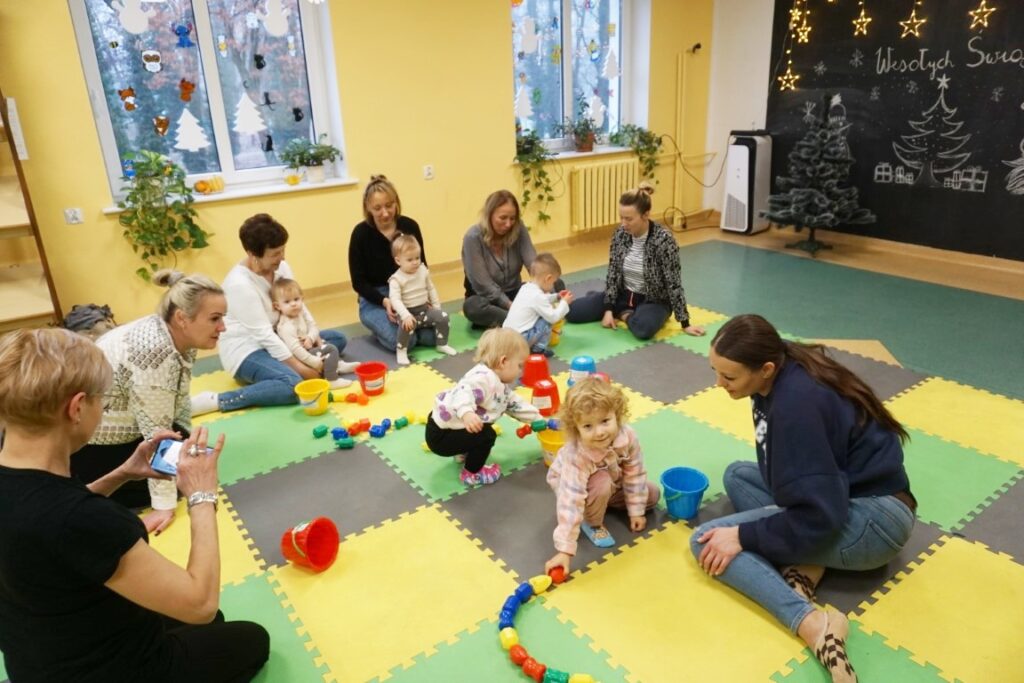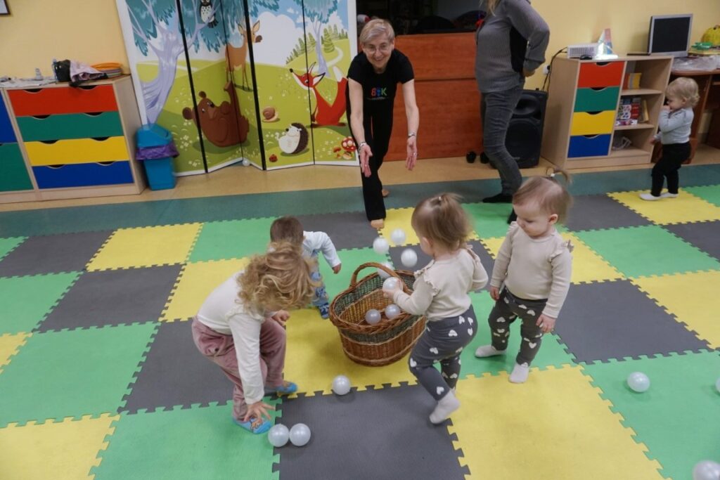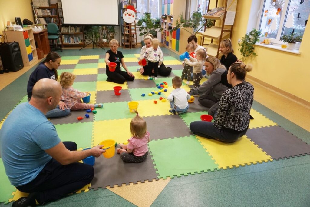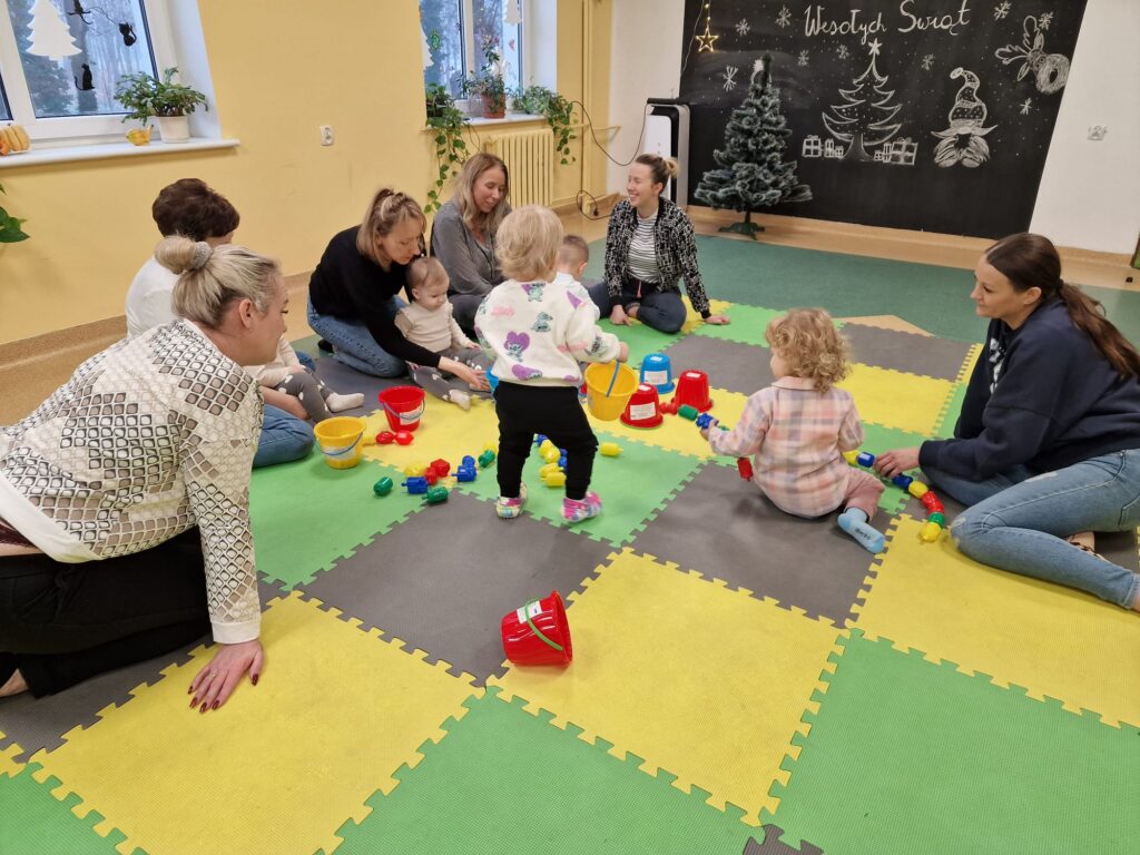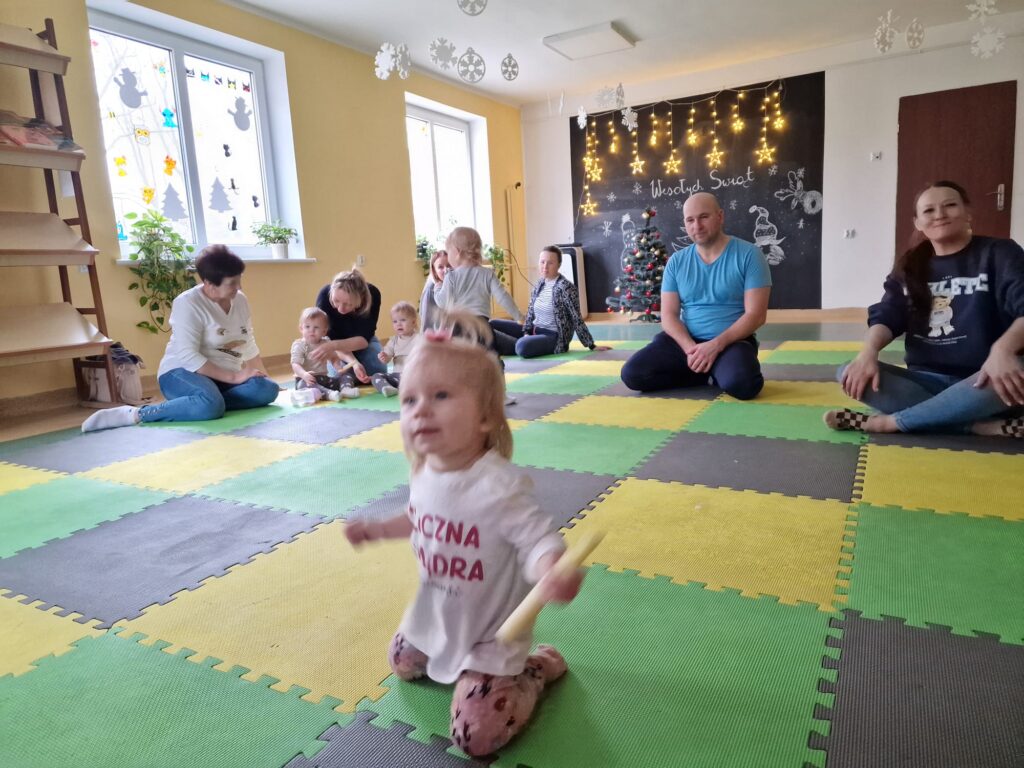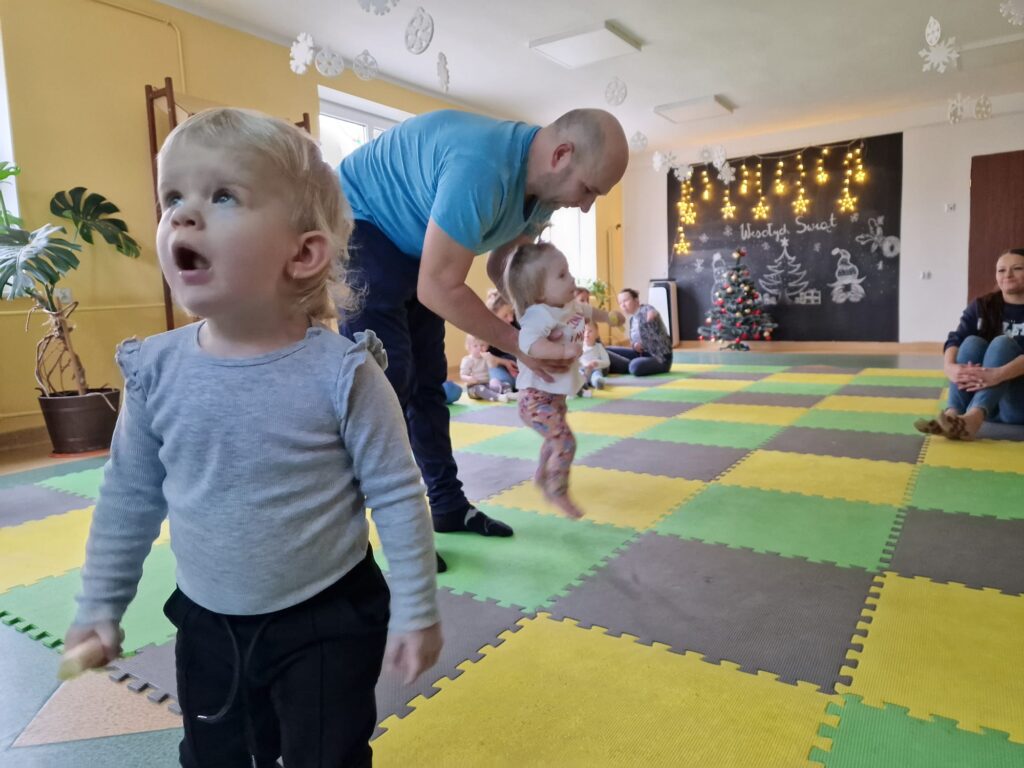 Dnia 17.12.2025 odbyły się, ostatnie w tym roku, zajęcia z maluszkami- Molikami. Na dobry początek- zabawa klockami, wagonikami. Na wiaderkach, jak na bębnie, granie: ram pam pam, ram, pam pam…Potem do wiaderek klocków zbieranie…i do bączka wrzucanie. Szybkie porządkowanie! Po zabawie powitanie i następne działanie.