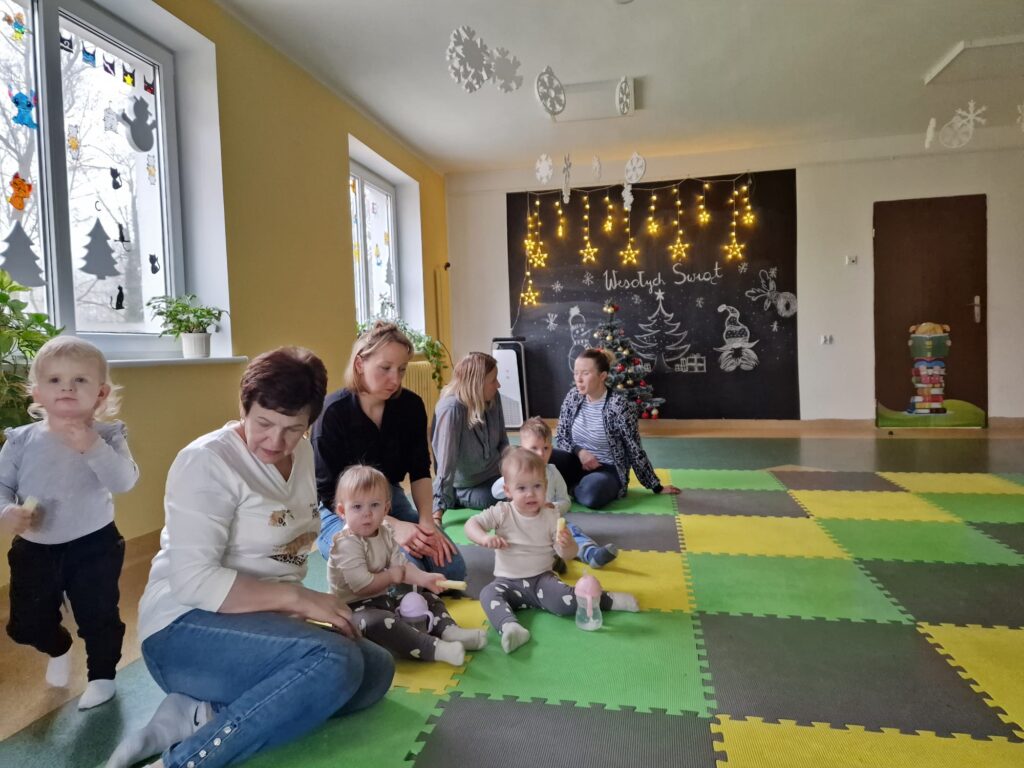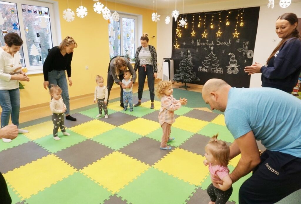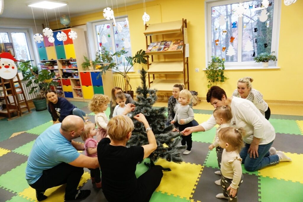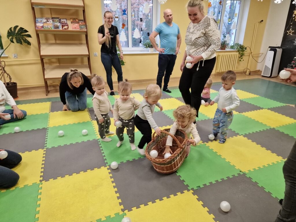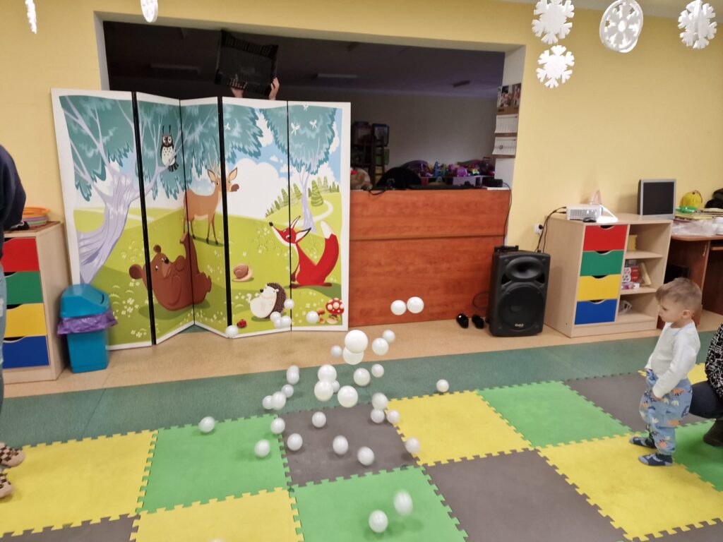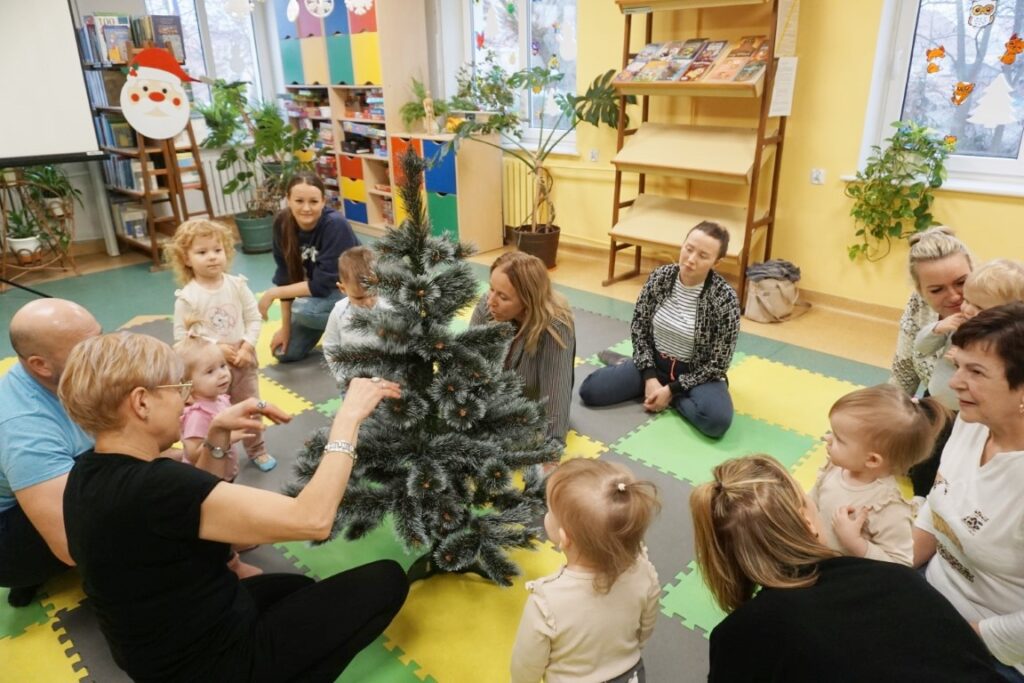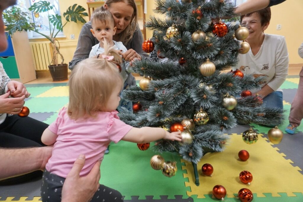 Na środeczku choinka stanęła. Gy dzieci ją zobaczyły, do niej podchodziły. Dotykały. Gałązki w rączki brały. Nawet igiełki gładziły. Kolorowe bombeczki zawieszały lub między gałązki wkładały. Gdy choinkę ubrały, wkoło tańcowały. Z góry, białe kulki wleciały. Dzieci jak, śnieżkami się nimi rzucały. Troszkę się po bawiły. Na koniec, wszystkie do kosza wrzuciły. Maluszki folię bąbelkową dostały. Pojedyncze bąbelki wciskały. Motorykę małą rozwijały. Jeszcze przeszkody pokonywały: mata kamyczkowa, wyspy sensoryczne, tunel, mega-bloki, opona, basen z kulkami… Motorykę dużą rozwijały. Jeszcze styropianowe choinki, gąbeczką malowały. Na koniec się pożegnały. Książki „prawie” czytały.Następne spotkanie z maluszkami- Molikami odbędzie się 7.01.26. Serdecznie zapraszamy! Nudzić się nikomu, na pewno nie damy!