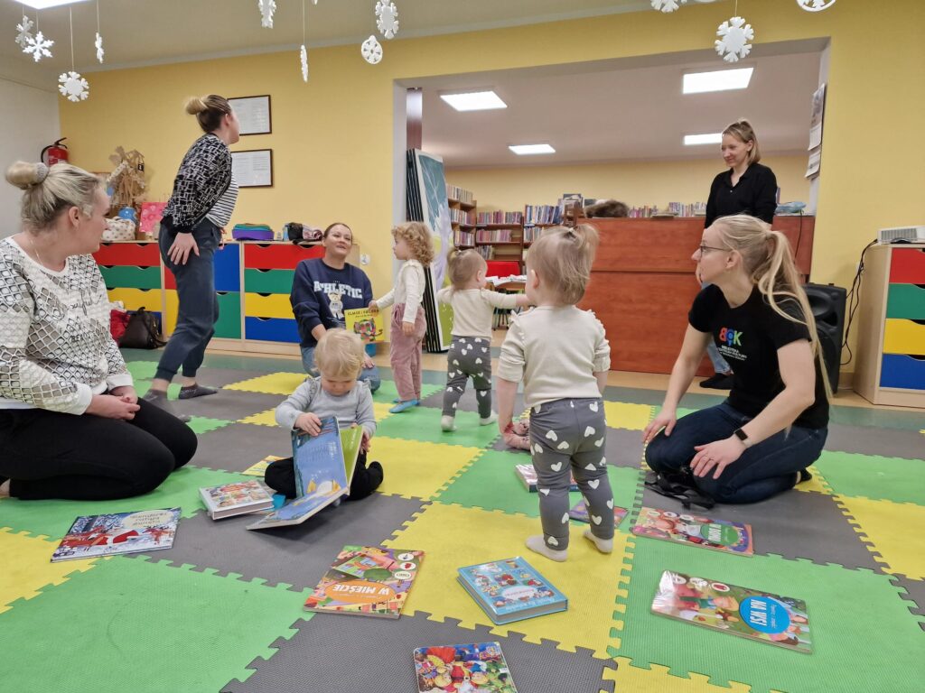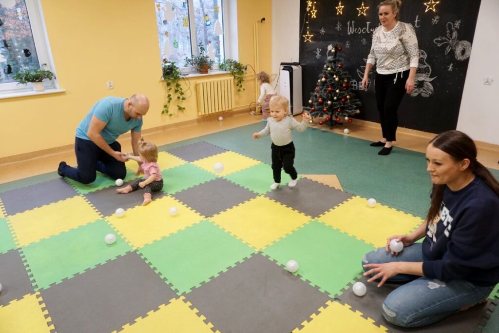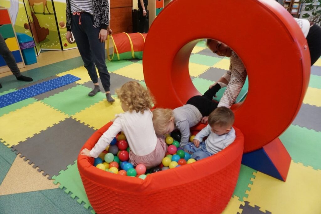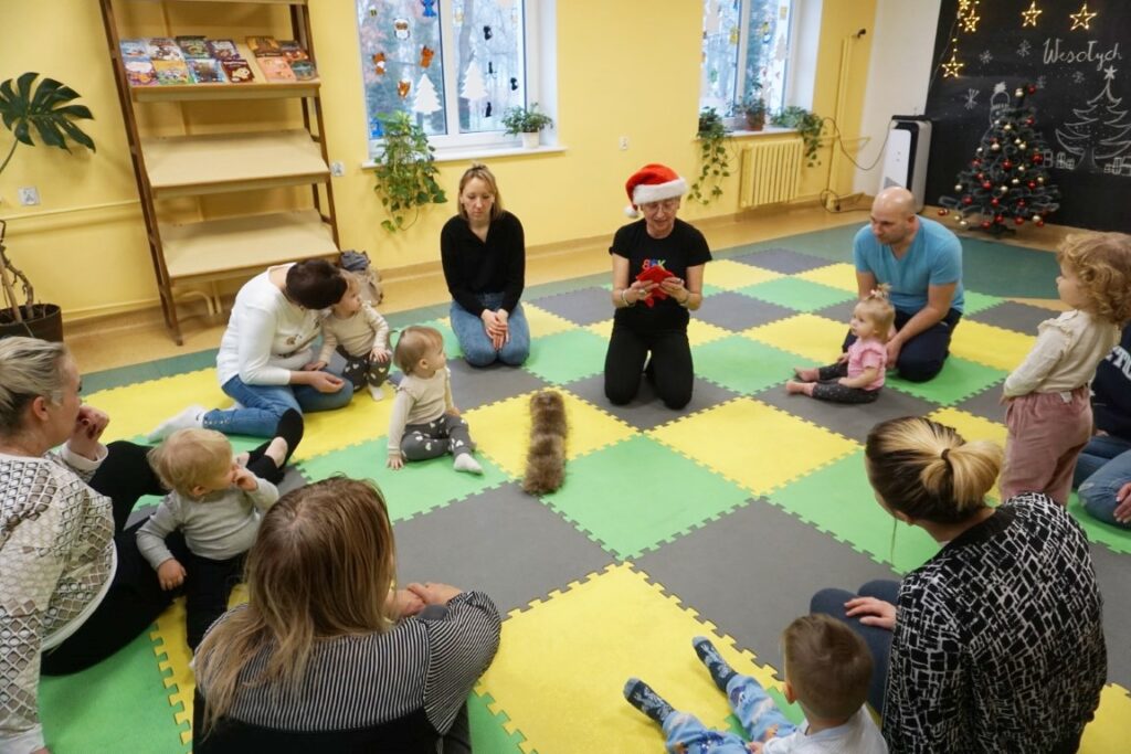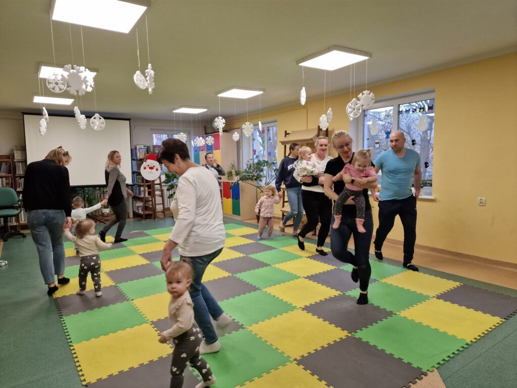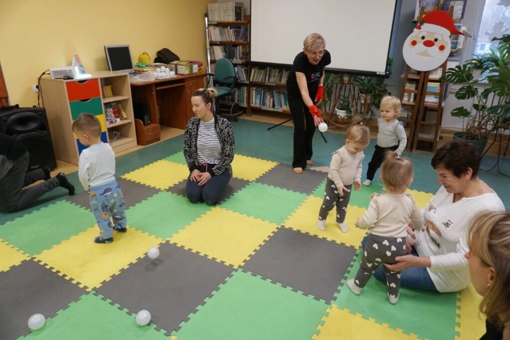 Na środeczku choinka stanęła. Gy dzieci ją zobaczyły, do niej podchodziły. Dotykały. Gałązki w rączki brały. Nawet igiełki gładziły. Kolorowe bombeczki zawieszały lub między gałązki wkładały. Gdy choinkę ubrały, wkoło tańcowały. Z góry, białe kulki wleciały. Dzieci jak, śnieżkami się nimi rzucały. Troszkę się po bawiły. Na koniec, wszystkie do kosza wrzuciły. Maluszki folię bąbelkową dostały. Pojedyncze bąbelki wciskały. Motorykę małą rozwijały. Jeszcze przeszkody pokonywały: mata kamyczkowa, wyspy sensoryczne, tunel, mega-bloki, opona, basen z kulkami… Motorykę dużą rozwijały. Jeszcze styropianowe choinki, gąbeczką malowały. Na koniec się pożegnały. Książki „prawie” czytały.Następne spotkanie z maluszkami- Molikami odbędzie się 7.01.26. Serdecznie zapraszamy! Nudzić się nikomu, na pewno nie damy!