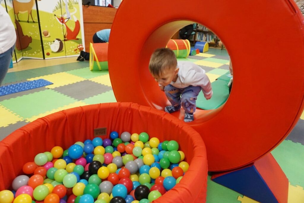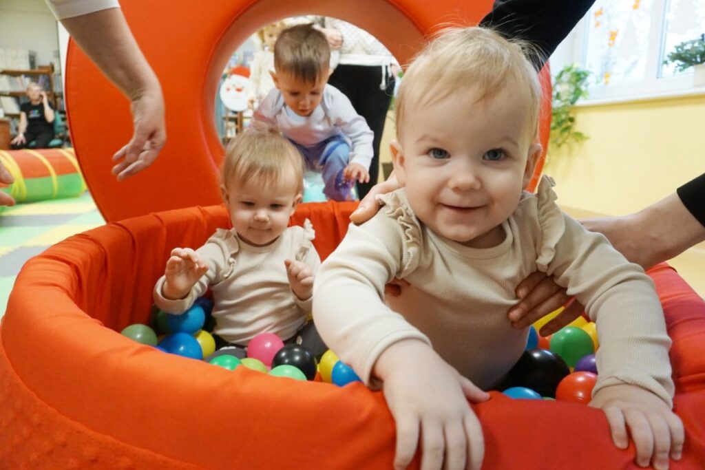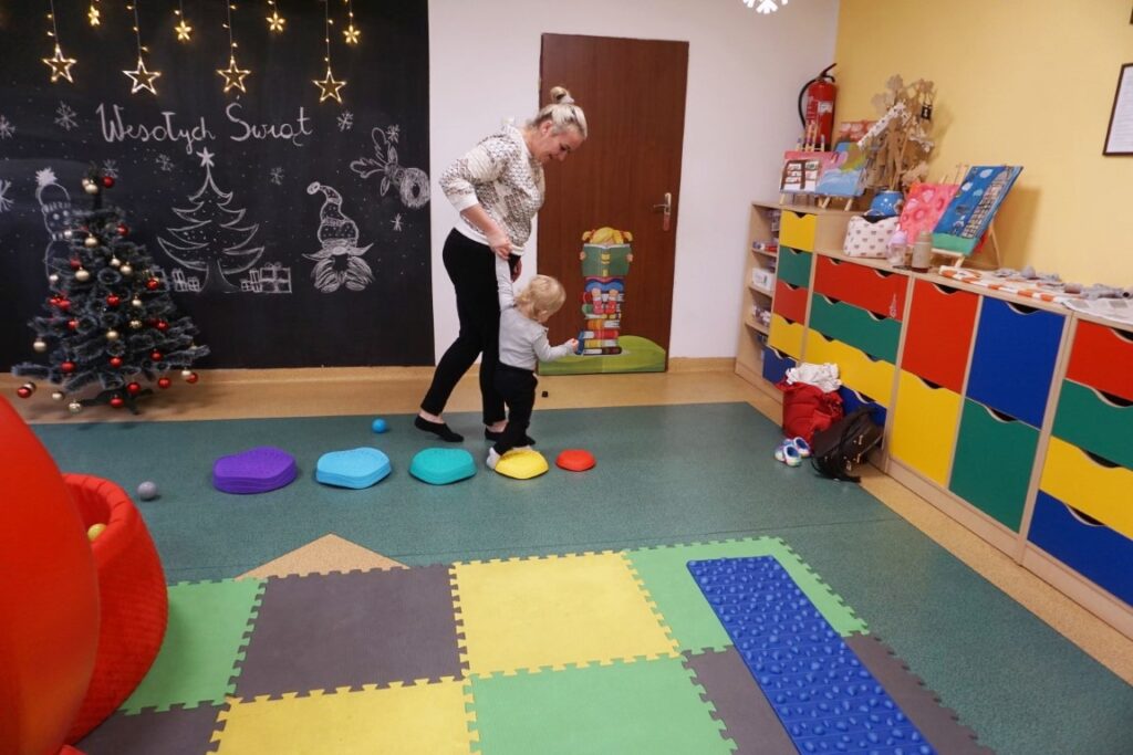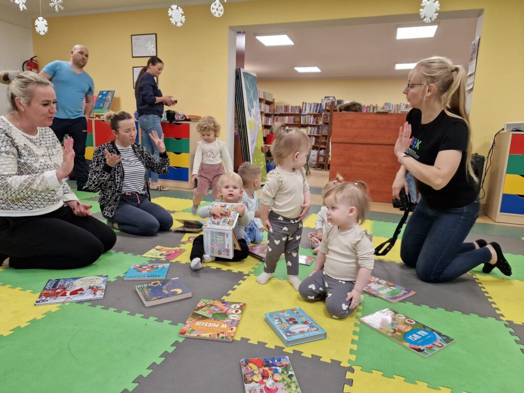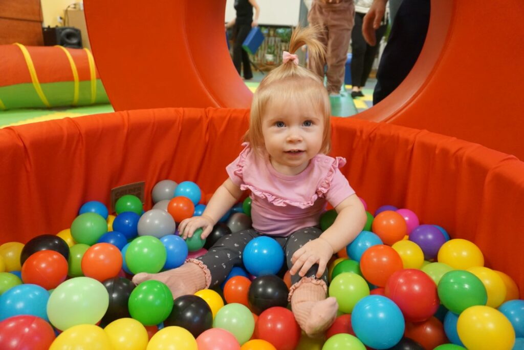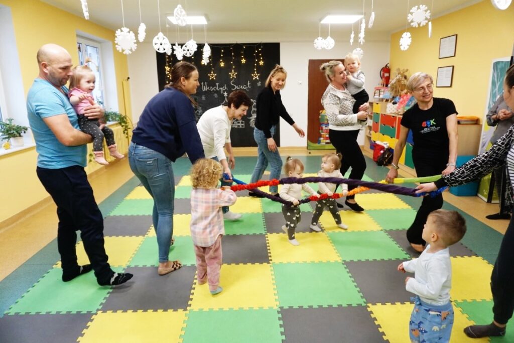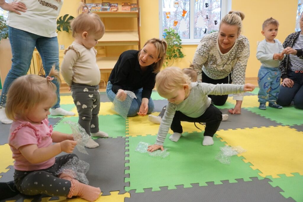 Na środeczku choinka stanęła. Gy dzieci ją zobaczyły, do niej podchodziły. Dotykały. Gałązki w rączki brały. Nawet igiełki gładziły. Kolorowe bombeczki zawieszały lub między gałązki wkładały. Gdy choinkę ubrały, wkoło tańcowały. Z góry, białe kulki wleciały. Dzieci jak, śnieżkami się nimi rzucały. Troszkę się po bawiły. Na koniec, wszystkie do kosza wrzuciły. Maluszki folię bąbelkową dostały. Pojedyncze bąbelki wciskały. Motorykę małą rozwijały. Jeszcze przeszkody pokonywały: mata kamyczkowa, wyspy sensoryczne, tunel, mega-bloki, opona, basen z kulkami… Motorykę dużą rozwijały. Jeszcze styropianowe choinki, gąbeczką malowały. Na koniec się pożegnały. Książki „prawie” czytały.Następne spotkanie z maluszkami- Molikami odbędzie się 7.01.26. Serdecznie zapraszamy! Nudzić się nikomu, na pewno nie damy!