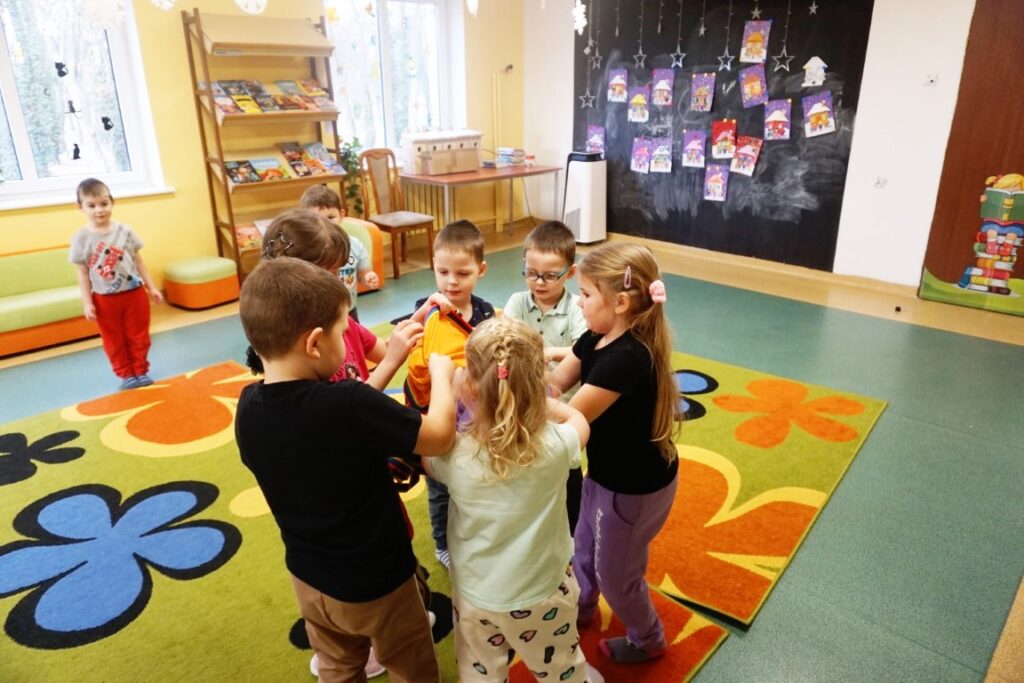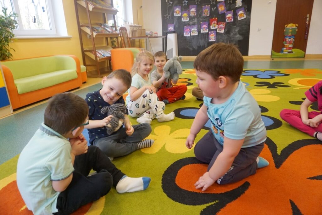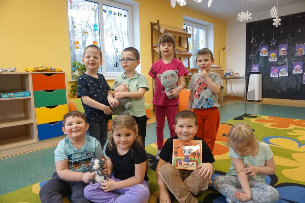 Po intensywnych aktywnościach przedszkolaki wygodnie usiadły na dywanie, aby odpocząć i wysłuchać opowiadania „Kicia Kocia. Wielka kłótnia” autorstwa Anity Głowińskiej. Bohaterka przeżywa konflikt z przyjacielem. Kłótnia wywołuje smutek, złość i poczucie niesprawiedliwości. Te emocje są dobrze znane dzieciom. Historia kotki stała się doskonałym pretekstem do rozmowy o emocjach i relacjach rówieśniczych.
