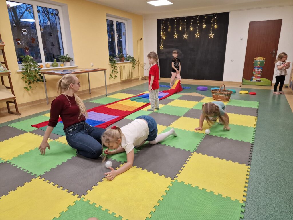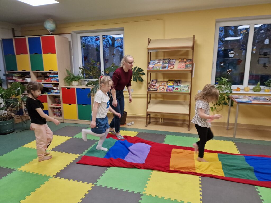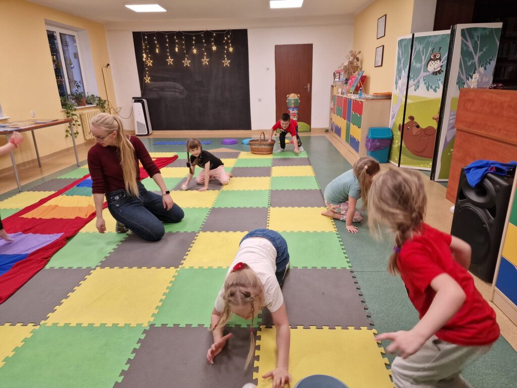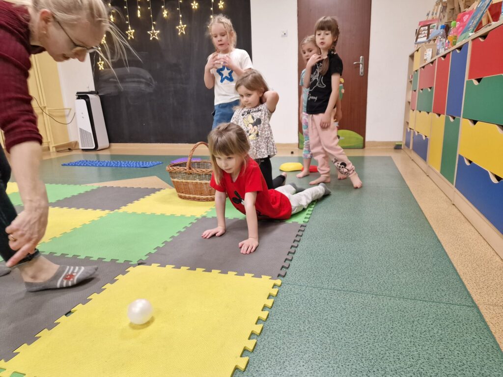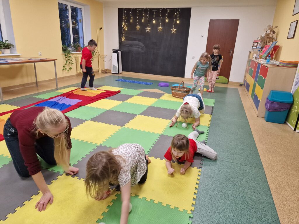 Po części ruchowej dzieci wygodnie usiadły na miękkich piankowych puzzlach, aby wysłuchać opowieści. Tego dnia zaproponowano książkę „Elfy na ratunek” Barbary Supeł. Przedszkolaki słuchały uważnie, w skupieniu śledząc losy bohaterów. Opowiadanie wprowadziło dzieci w magiczny, zimowy świat, w którym elfy przygotowywały się do najważniejszego momentu w roku, świąt. Gdy pojawił się kłopot, to właśnie one ruszyły z pomocą, wykazując się pomysłowością, współpracą i odwagą. Opowieść była pełna pozytywnych wartości: podkreślała znaczenie współpracy, uczyła odpowiedzialności i empatii, pokazując, że nawet mali bohaterowie mogą dokonywać wielkich rzeczy. Tekst był rymowany, lekki i przystępny z barwnymi ilustracjami przyciągającymi uwagę najmłodszych. Doskonale sprawdził się podczas głośnego czytania.