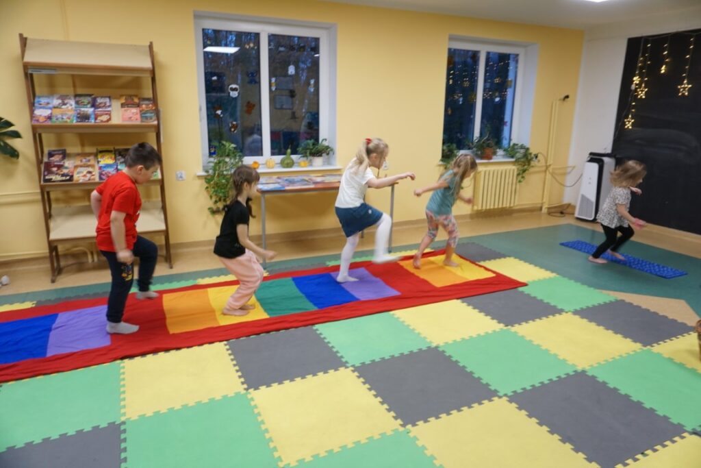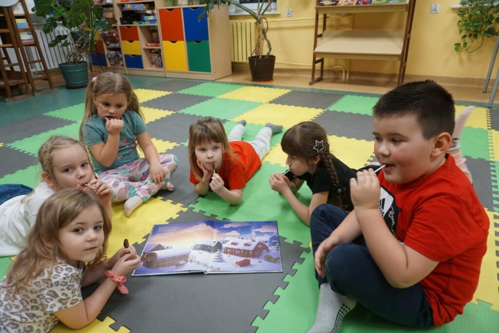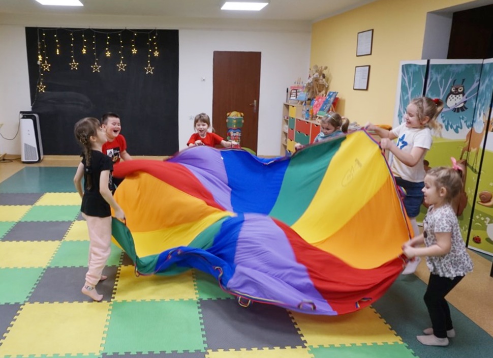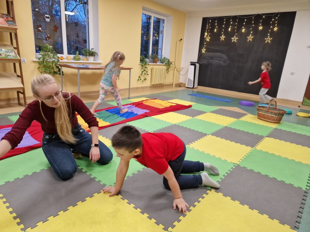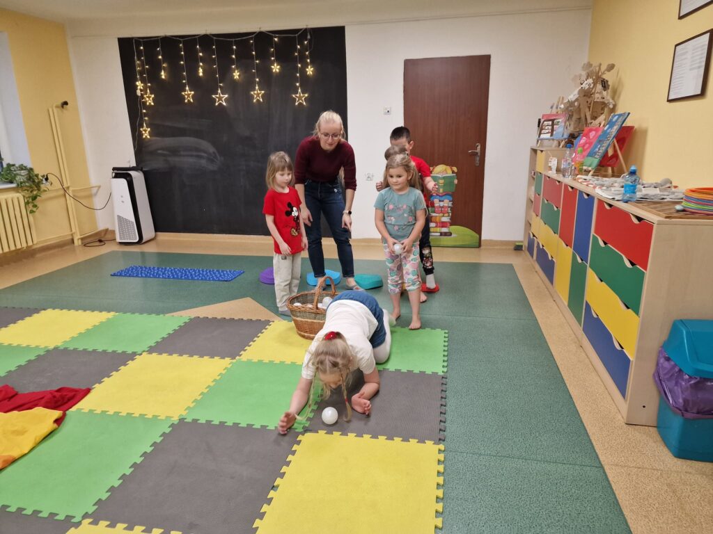 Po części ruchowej dzieci wygodnie usiadły na miękkich piankowych puzzlach, aby wysłuchać opowieści. Tego dnia zaproponowano książkę „Elfy na ratunek” Barbary Supeł. Przedszkolaki słuchały uważnie, w skupieniu śledząc losy bohaterów. Opowiadanie wprowadziło dzieci w magiczny, zimowy świat, w którym elfy przygotowywały się do najważniejszego momentu w roku, świąt. Gdy pojawił się kłopot, to właśnie one ruszyły z pomocą, wykazując się pomysłowością, współpracą i odwagą. Opowieść była pełna pozytywnych wartości: podkreślała znaczenie współpracy, uczyła odpowiedzialności i empatii, pokazując, że nawet mali bohaterowie mogą dokonywać wielkich rzeczy. Tekst był rymowany, lekki i przystępny z barwnymi ilustracjami przyciągającymi uwagę najmłodszych. Doskonale sprawdził się podczas głośnego czytania.