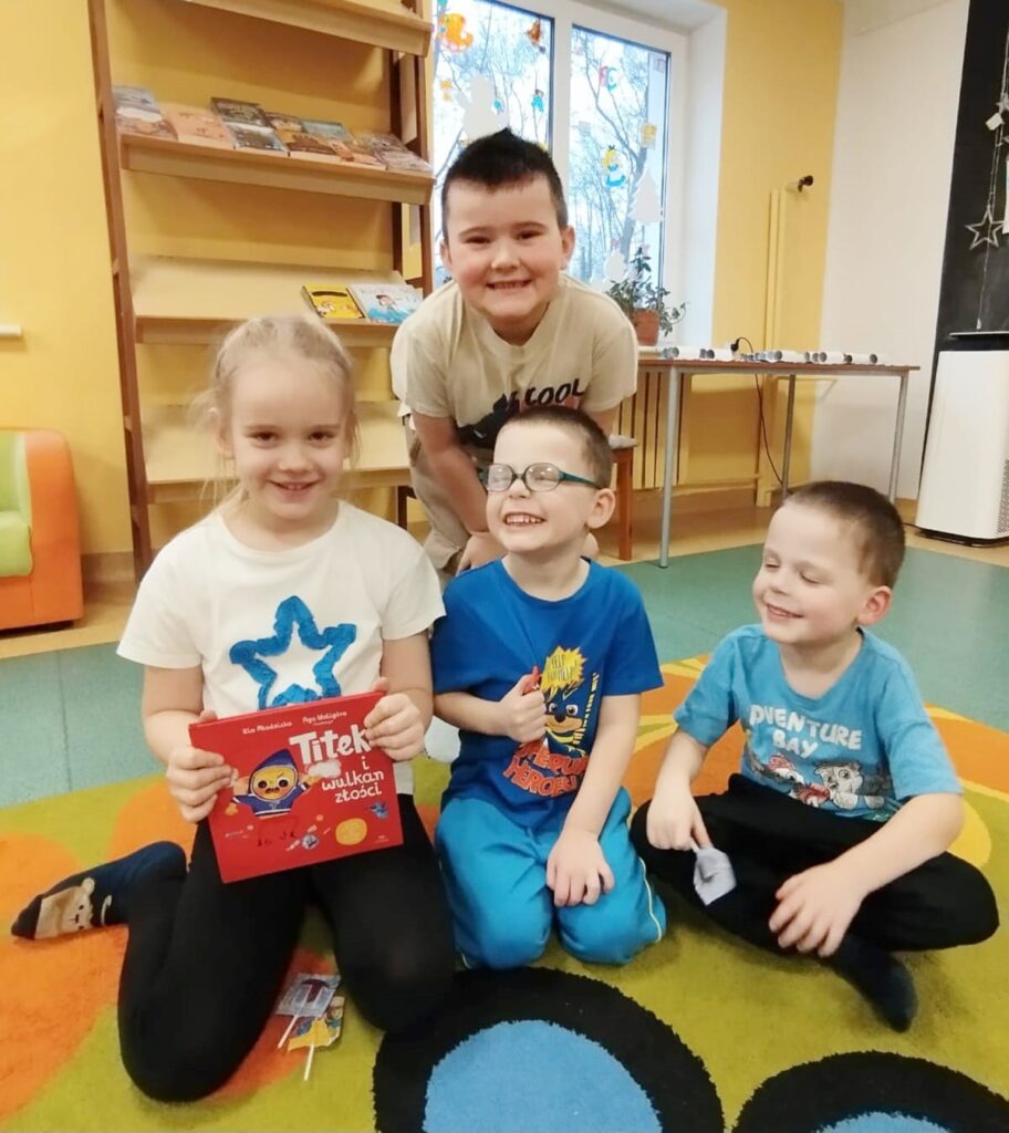 Na podstawie książki Urszuli Młodnickiej i Agnieszki Waligóry pt:”Titek i wulkan złości”, próbowano oswoić trudne emocje, które były tematem spotkania. W atmosferze skupienia dzieci wysłuchały opowiadania. Historia Titka stała się idealnym punktem wyjścia do zrozumienia, że złość jest naturalnym uczuciem, które bywa gwałtowne jak erupcja wulkanu – można zrozumieć i zaakceptować. Złość jest naturalna, ale wymaga „oswojenia”. Po lekturze odbyła się otwarta rozmowa. Przedszkolaki dzieliły się swoimi doświadczeniami z emocjami i wspólnie z panią szukały bezpiecznych metod na radzenie sobie z gniewem.