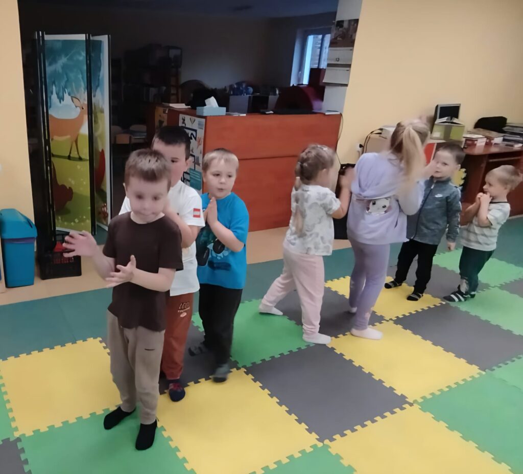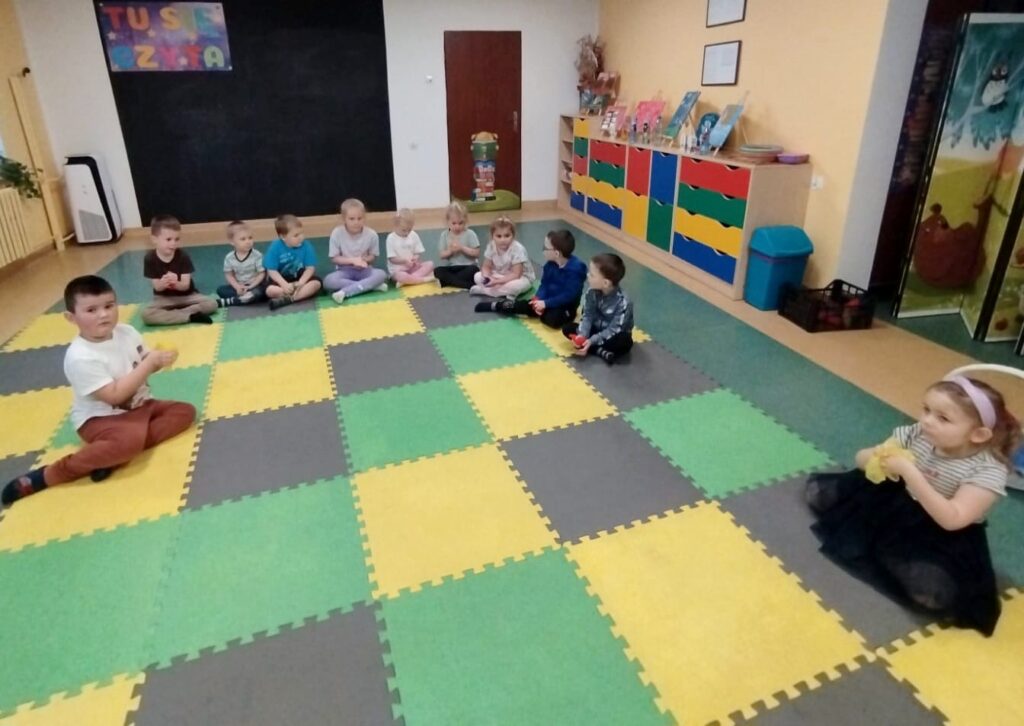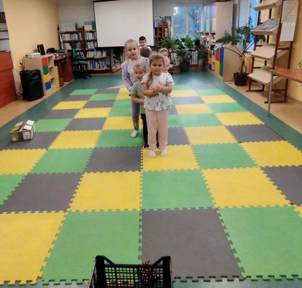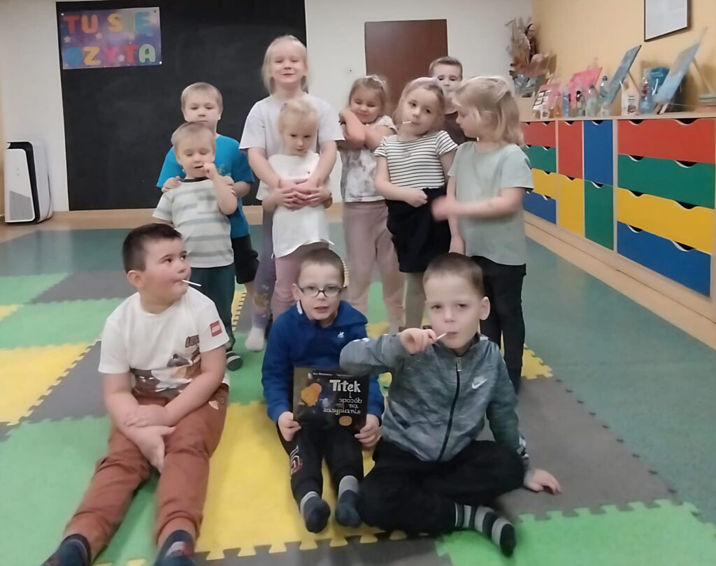 Dnia 19.11.2025 r. podczas spotkania klubiku czytelniczego, gdzie ruch przy muzyce łączy się z czytaniem i dyskutowaniem, klubowicze z entuzjazmem uczestniczyli w zaplanowanych aktywnościach. Poznali nowe, rytmiczne piosenki, które szybko przypadły im do gustu. Bez trudu opanowali ruch i rytm. Potem chętnie usiedli na piankowych puzzlach, moszcząc sobie wygodne i przytulne miejsca. W skupieniu wysłuchali opowiadania Uli Młodnickiej pt.: „Titek i sposób na zasypianie”. Jego bohaterem był Titek, sympatyczny, pełen energii i ciekawy świata, przedszkolak, który odkrył, że zasypianie wcale nie musi być trudne.
