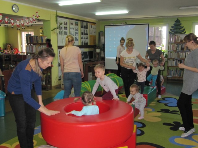 Utrzymywały równowagę, wdrapywały się wysoko, przeciskały między klockami i zeskakiwały. Pokonywały tunel. Radość przynosiło sprawne forsowanie przeszkód. Po chwili relaksu przy piosence „Zimowa rozruszanka”, następne zadanie: nabijanie drewnianych klocków na drążek. Na koniec przypomnienie kolorów i malowanie choinki. Kilkoro dzieci wypożyczyło nawet książeczki do domu.