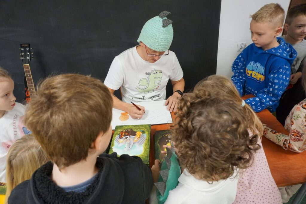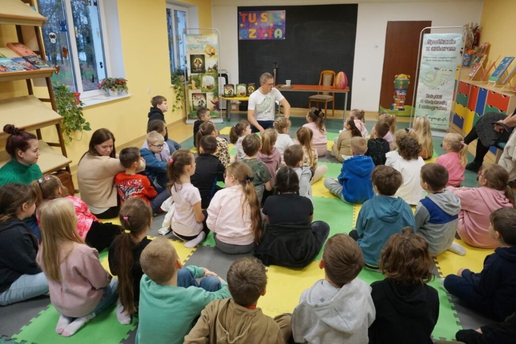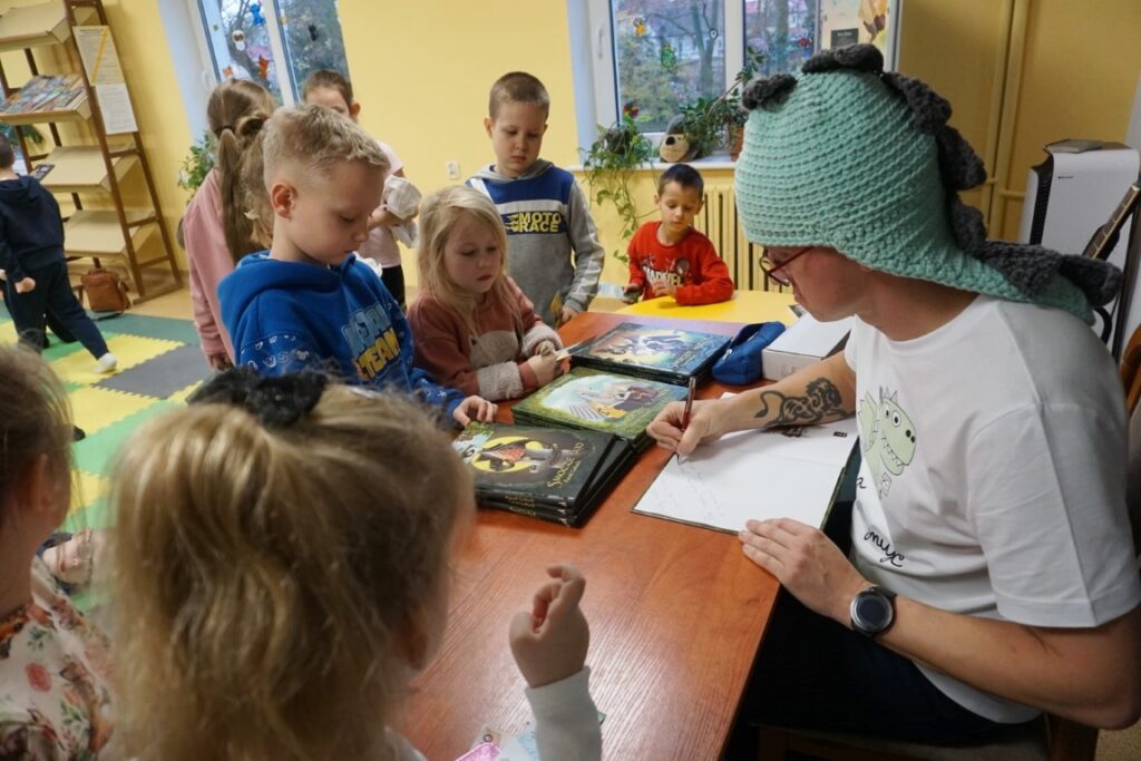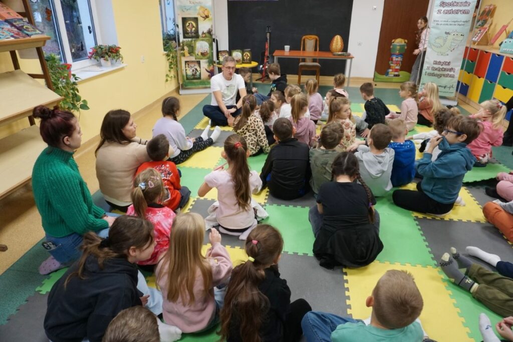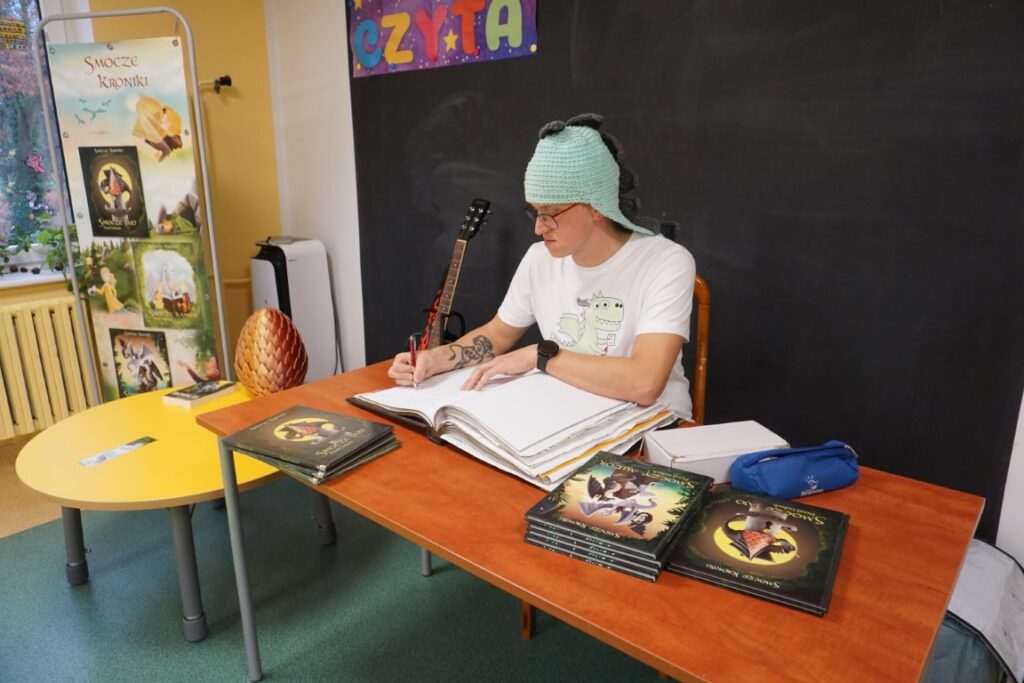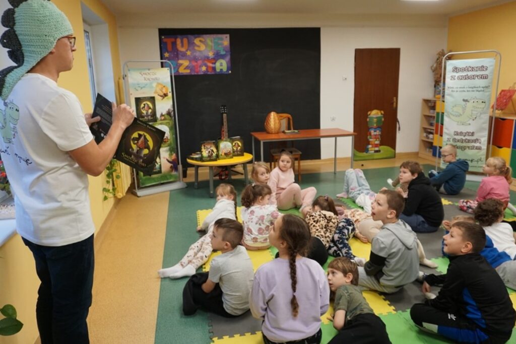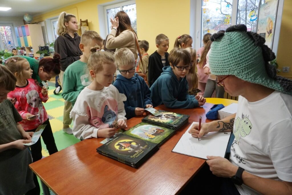 Dnia 18.11.25 w Bibliotece dla Dzieci miało miejsce ogniste, czytelnicze spotkanie Pawła Gołucha z uczniami klasy I i II SP w Trzcińsku-Zdroju. Od początku było niezwykle energetycznie. Autor znalazł sposób, by trafić do serc przyszłych czytelników i otworzyć wrota wyobraźni do zaczarowanego świata magii, radości i mądrości, które skrywają się w Smoczych Kronikach. Straszył smokami i potworami. Dzieci piszczały, ale w cale się nie bały! Były chętne do dalszej zabawy!