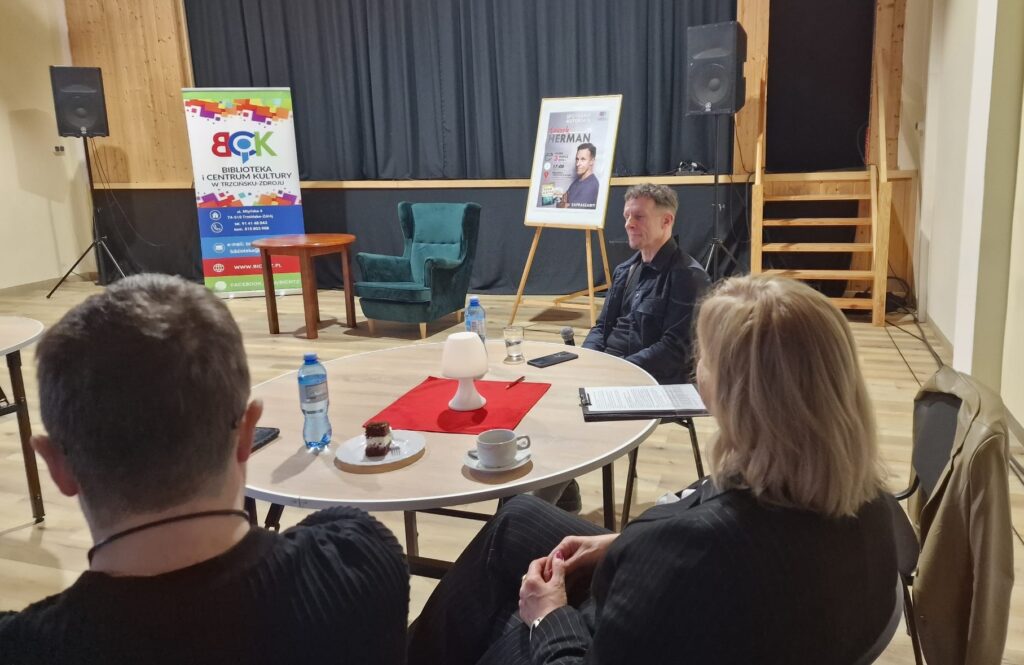 Wydarzenie rozpoczęła Dyrektor BiCK R. Brzezińska od przedstawienia pisarza i zaprezentowania jego dorobku literackiego. Następnie głos zabrał Leszek Herman. Zaczął od przybliżenia czytelnikom swojego warsztatu pisarskiego. Mówił o nawykach, technikach i narzędziach, które wykorzystuje w pracy nad książką. Herman, z właściwą sobie swadą i dystansem, opowiadał o tym, jak zawód architekta pomaga mu w konstruowaniu literackich labiryntów. Kilkukrotnie odnosił się do swojej debiutanckiej powieści „Sedinum”. Zdradził, jak jedno przypadkowe odkrycie na placu budowy potrafi stać się fundamentem dla kilkusetstronicowego thrillera. Czytelnicy dowiedzieli się, ile czasu zajmuje weryfikacja faktów historycznych, aby fikcja literacka mogła płynnie przeplatać się z rzeczywistością. Uczestnicy zadawali autorowi mnóstwo pytań. Niektóre były niezwykle konkretne – od kwestii związanych z dalszymi losami ulubionych bohaterów, po techniczne aspekty opisywania podziemi i starych zamczysk.